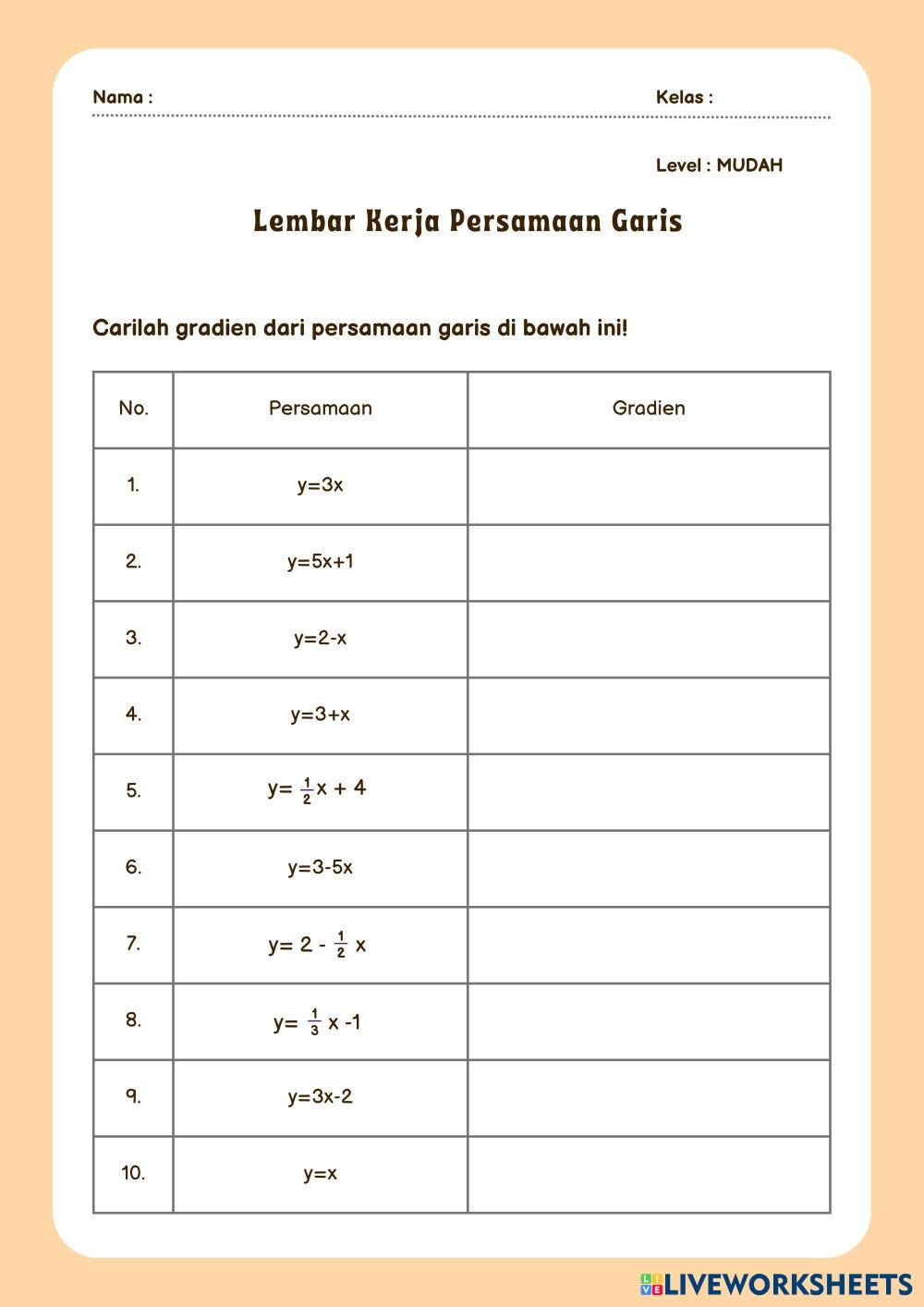 Created byILINING USWATUUN KHASANAH gradien garis lurus matematika1061950 Age 13+ level: Sedang Indonesian Author's Instructions My Google Classroom Courses × 0 classes selected (0 students total) Quick Access Select all classes (0 classes) All Classes Loading courses... Cancel Share Share to selected Course __COURSE_NAME__ __STUDENT_NAME__ (__STUDENT_EMAIL__) GRADIEN Download Worksheet Validation Check my answers Emails my answers to my teacher Full name Group/level School subject Teacher's email or key code Close Submit Validating worksheet... (12) Your answers have been sent to your teacher. Good luck! OK We encountered an error submitting your answers. Please try again. OK Advertisement | Go Ad Free Created byILINING USWATUUN KHASANAH gradien garis lurus matematika1061950 Age 13+ level: Sedang Indonesian Author's Instructions