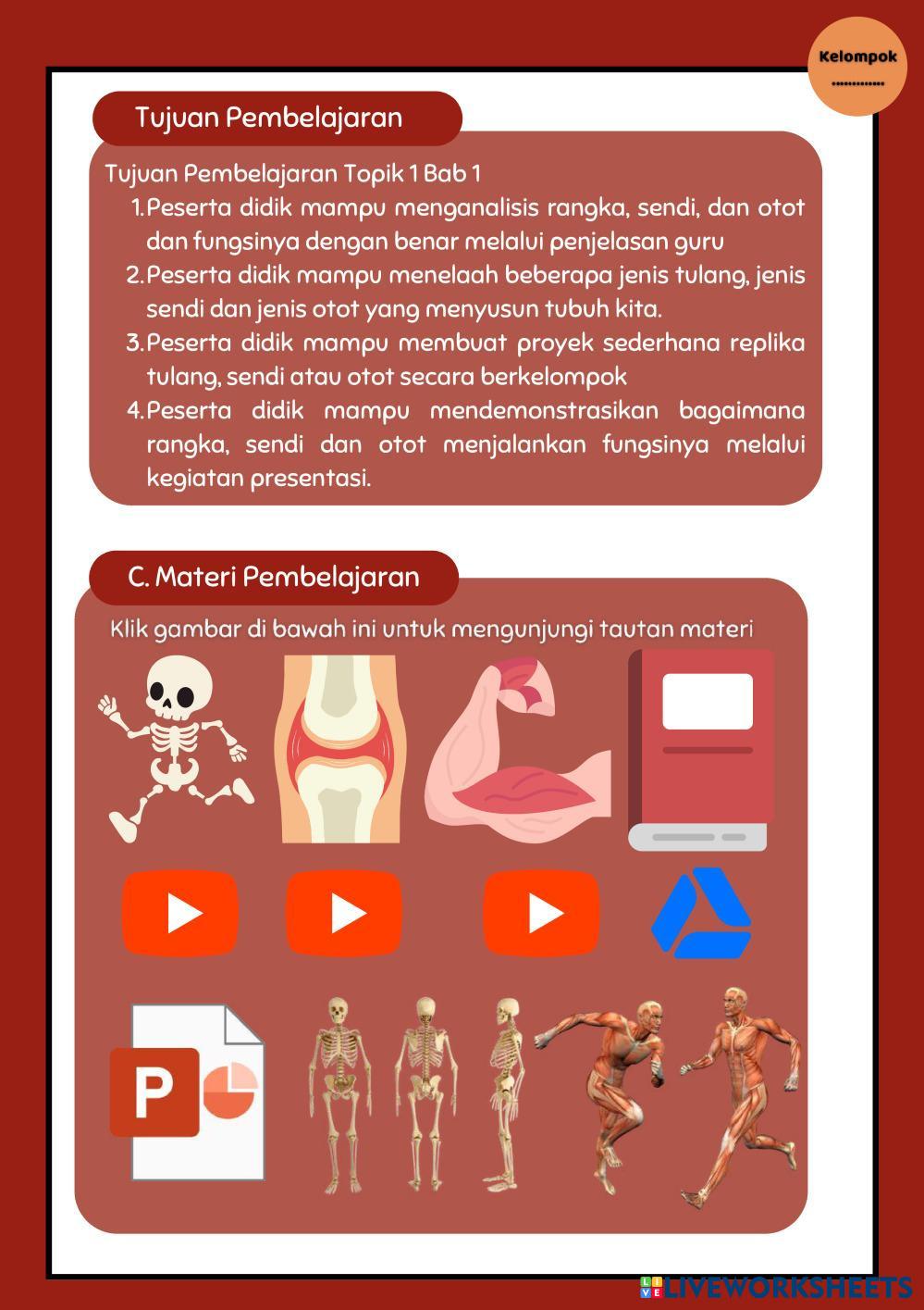 Created bydwi dee Ilmu Pengetahuan Alam dan Sosial (IPAS) Sistem Gerak Manusia Age 10-16 level: 6 Indonesian Author's Instructions My Google Classroom Courses × 0 classes selected (0 students total) Quick Access Select all classes (0 classes) All Classes Loading courses... Cancel Share Share to selected Course __COURSE_NAME__ __STUDENT_NAME__ (__STUDENT_EMAIL__) E-LKPD Interaktif Kelas 6 IPAS Bab 1 Topik 1 'Sistem Rangka, Sendi dan Otot dalam Gerak Manusia' Download Worksheet Validation Check my answers Emails my answers to my teacher Full name Group/level School subject Teacher's email or key code Close Submit Validating worksheet... (12) Your answers have been sent to your teacher. Good luck! OK We encountered an error submitting your answers. Please try again. OK Advertisement | Go Ad Free Created bydwi dee Ilmu Pengetahuan Alam dan Sosial (IPAS) Sistem Gerak Manusia Age 10-16 level: 6 Indonesian Author's Instructions