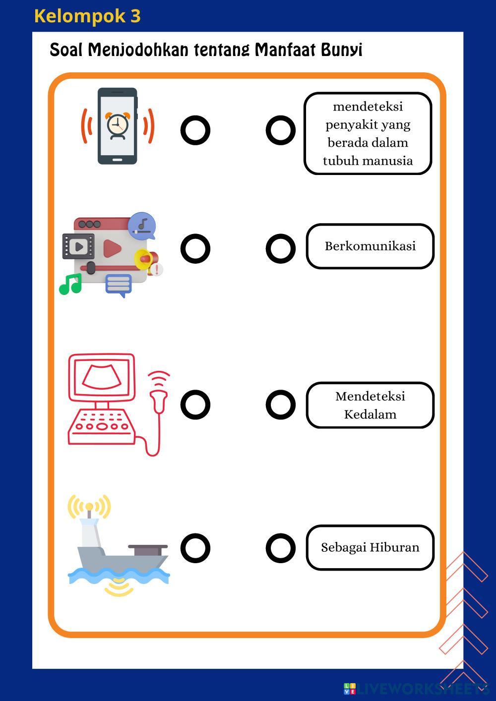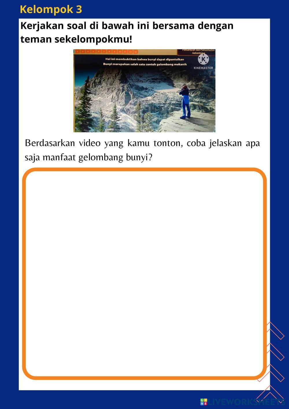 Created by Wulan13 Ilmu Pengetahuan Alam dan Sosial (IPAS) BUNYI DAN SIFATNYA Age 11-15 level: 5 Indonesian Author's Instructions My Google Classroom Courses × 0 classes selected (0 students total) Quick Access Select all classes (0 classes) All Classes Loading courses... Cancel Share Share to selected Course __COURSE_NAME__ __STUDENT_NAME__ (__STUDENT_EMAIL__) Bunyi dan Sifatnya Download Worksheet Validation Check my answers Emails my answers to my teacher Full name Group/level School subject Teacher's email or key code Close Submit Validating worksheet... (12) Your answers have been sent to your teacher. Good luck! OK We encountered an error submitting your answers. Please try again. OK Advertisement | Go Ad Free Created by Wulan13 Ilmu Pengetahuan Alam dan Sosial (IPAS) BUNYI DAN SIFATNYA Age 11-15 level: 5 Indonesian Author's Instructions