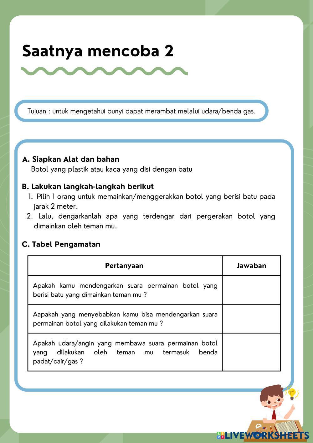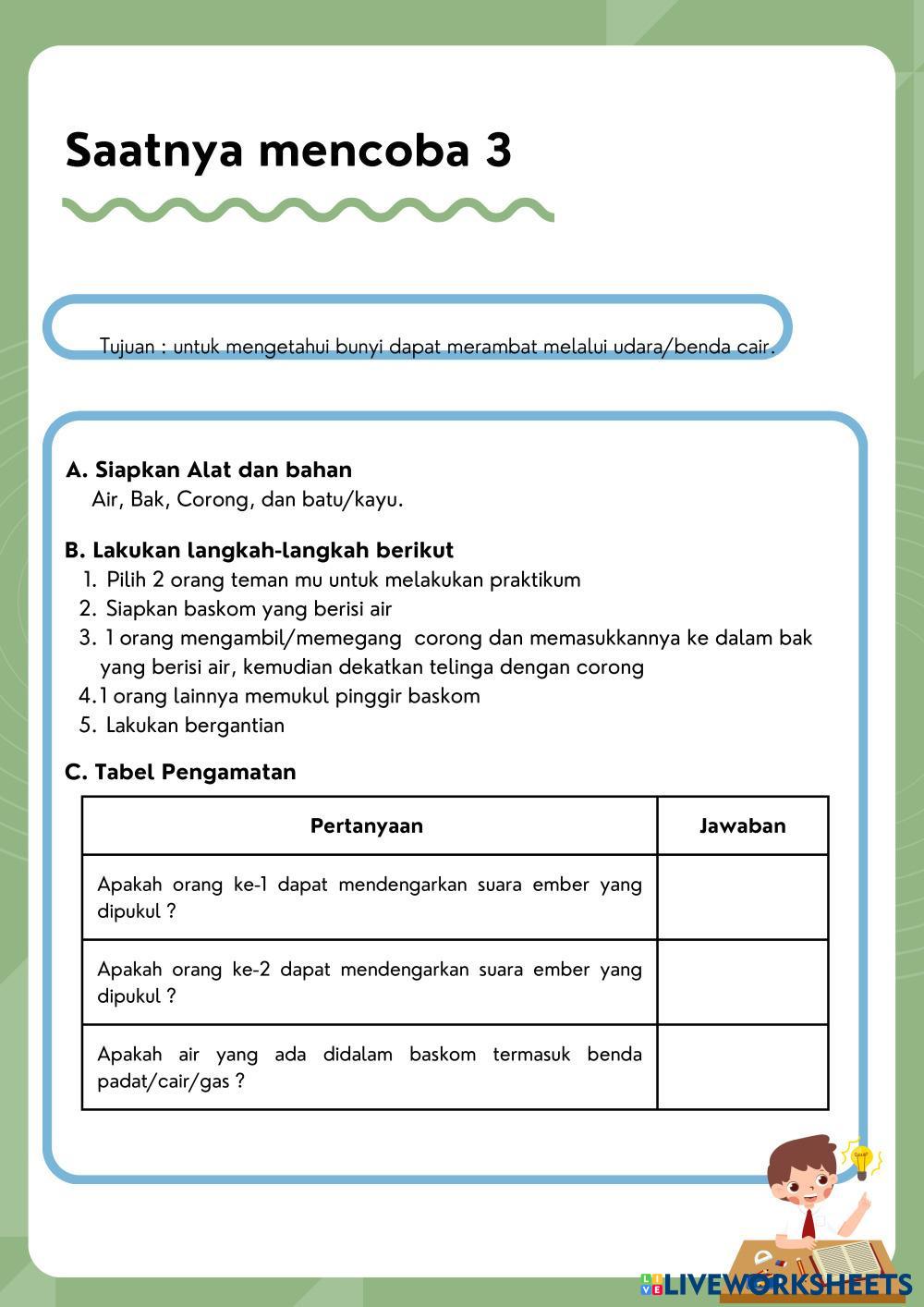 Created byOPI Ilmu Pengetahuan Alam dan Sosial (IPAS) BUNYI DAN SIFATNYA Age 10-15 level: KELAS 5 Indonesian Author's Instructions My Google Classroom Courses × 0 classes selected (0 students total) Quick Access Select all classes (0 classes) All Classes Loading courses... Cancel Share Share to selected Course __COURSE_NAME__ __STUDENT_NAME__ (__STUDENT_EMAIL__) LKPD BUNYI BISA MERAMBAT Download Worksheet Validation Check my answers Emails my answers to my teacher Full name Group/level School subject Teacher's email or key code Close Submit Validating worksheet... (12) Your answers have been sent to your teacher. Good luck! OK We encountered an error submitting your answers. Please try again. OK Advertisement | Go Ad Free Created byOPI Ilmu Pengetahuan Alam dan Sosial (IPAS) BUNYI DAN SIFATNYA Age 10-15 level: KELAS 5 Indonesian Author's Instructions