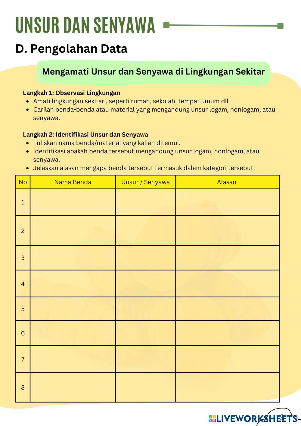 Created by AGUM_YUDA Ilmu Pengetahuan Alam (IPA) SMP Unsur, Senyawa, dan Campuran Age 14+ level: 7 Indonesian Author's Instructions My Google Classroom Courses × 0 classes selected (0 students total) Quick Access Select all classes (0 classes) All Classes Loading courses... Cancel Share Share to selected Course __COURSE_NAME__ __STUDENT_NAME__ (__STUDENT_EMAIL__) Pengolahan Data Misi 1 Unsur dan Senyawa Download Worksheet Validation Check my answers Emails my answers to my teacher Full name Group/level School subject Teacher's email or key code Close Submit Validating worksheet... (12) Your answers have been sent to your teacher. Good luck! OK We encountered an error submitting your answers. Please try again. OK Advertisement | Go Ad Free Created by AGUM_YUDA Ilmu Pengetahuan Alam (IPA) SMP Unsur, Senyawa, dan Campuran Age 14+ level: 7 Indonesian Author's Instructions