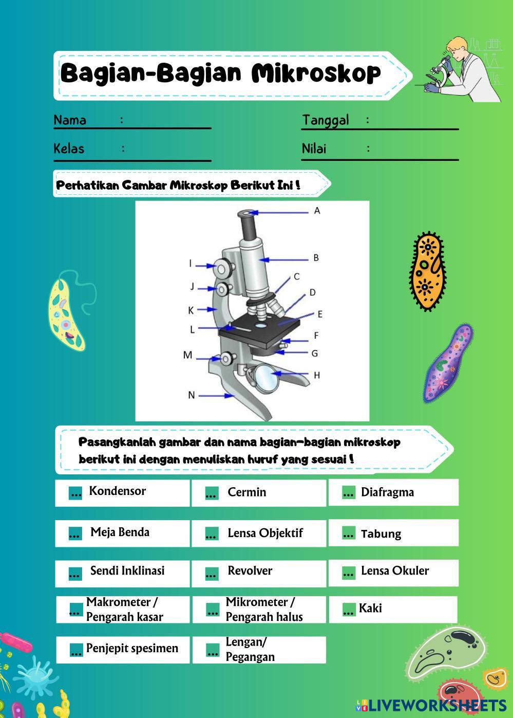 Created by agustina4885 Ilmu Pengetahuan Alam (IPA) Mengenal bagian dan fungsi mikroskop Age 10-12 level: 7 Indonesian Author's Instructions My Google Classroom Courses × 0 classes selected (0 students total) Quick Access Select all classes (0 classes) All Classes Loading courses... Cancel Share Share to selected Course __COURSE_NAME__ __STUDENT_NAME__ (__STUDENT_EMAIL__) BAGIAN-BAGIAN MIKROSKOP DAN FUNGSINYA Download Worksheet Validation Check my answers Emails my answers to my teacher Full name Group/level School subject Teacher's email or key code Close Submit Validating worksheet... (12) Your answers have been sent to your teacher. Good luck! OK We encountered an error submitting your answers. Please try again. OK Advertisement | Go Ad Free Created by agustina4885 Ilmu Pengetahuan Alam (IPA) Mengenal bagian dan fungsi mikroskop Age 10-12 level: 7 Indonesian Author's Instructions