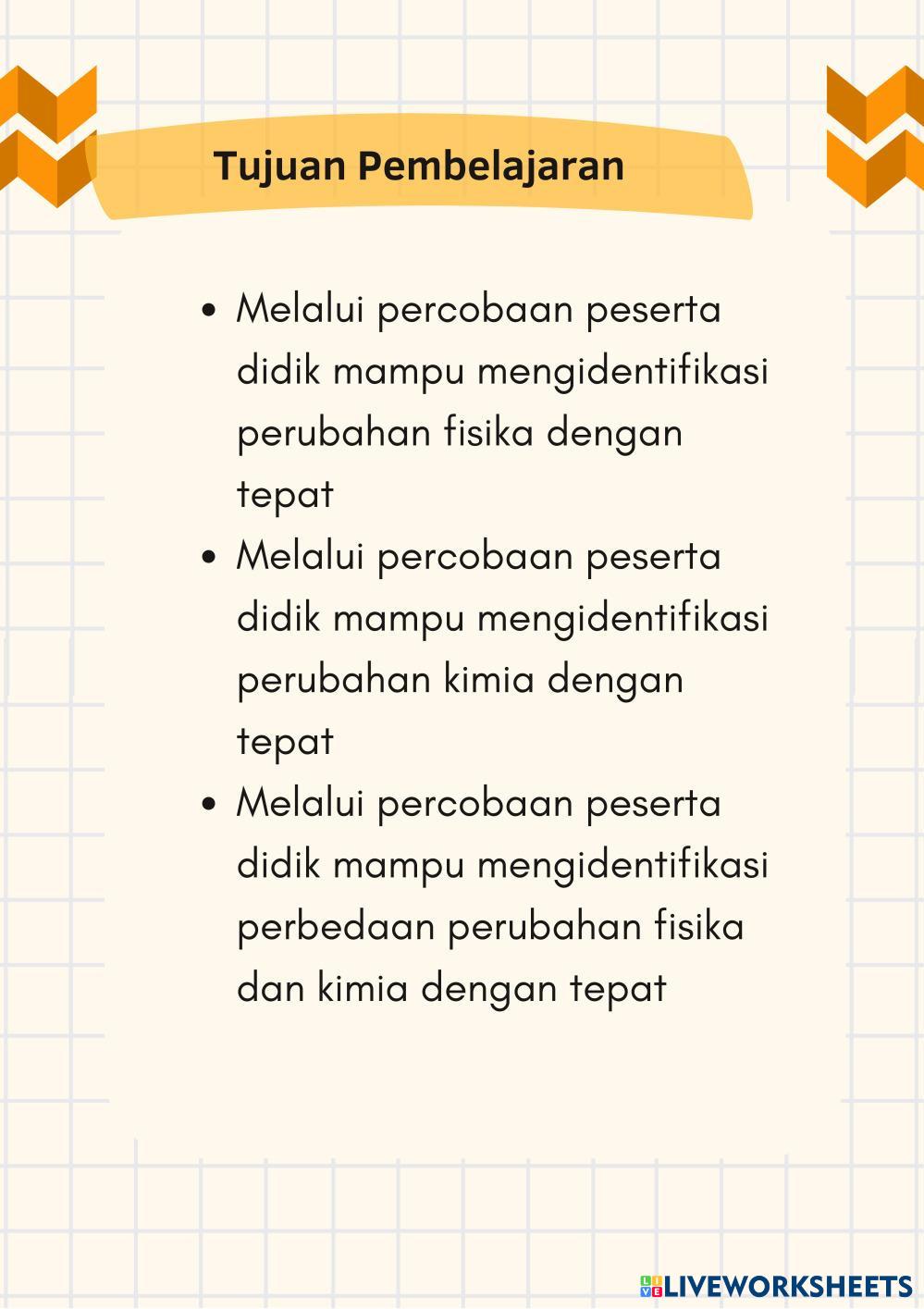 Created byMoch Arba Salahuddin Mulyono Ilmu Pengetahuan Alam (IPA) Perubahan Fisika dan Perubahan Kimia Age 3-16 level: 7 Indonesian Author's Instructions My Google Classroom Courses × 0 classes selected (0 students total) Quick Access Select all classes (0 classes) All Classes Loading courses... Cancel Share Share to selected Course __COURSE_NAME__ __STUDENT_NAME__ (__STUDENT_EMAIL__) Perubahan Fisika dan Kimia Download Worksheet Validation Check my answers Emails my answers to my teacher Full name Group/level School subject Teacher's email or key code Close Submit Validating worksheet... (12) Your answers have been sent to your teacher. Good luck! OK We encountered an error submitting your answers. Please try again. OK Advertisement | Go Ad Free Created byMoch Arba Salahuddin Mulyono Ilmu Pengetahuan Alam (IPA) Perubahan Fisika dan Perubahan Kimia Age 3-16 level: 7 Indonesian Author's Instructions