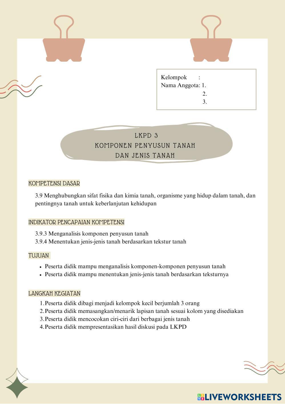 Created byZahra Pricilia Ilmu Pengetahuan Alam (IPA) Tanah dan Keberlangsungan Kehidupan Age 14-12 level: 6 Indonesian Author's Instructions LKPD 3 Komponen Penyusun Tanah My Google Classroom Courses × 0 classes selected (0 students total) Quick Access Select all classes (0 classes) All Classes Loading courses... Cancel Share Share to selected Course __COURSE_NAME__ __STUDENT_NAME__ (__STUDENT_EMAIL__) LKPD 3 Komponen Penyusun Tanah Download Worksheet Validation Check my answers Emails my answers to my teacher Full name Group/level School subject Teacher's email or key code Close Submit Validating worksheet... (12) Your answers have been sent to your teacher. Good luck! OK We encountered an error submitting your answers. Please try again. OK Advertisement | Go Ad Free Created byZahra Pricilia Ilmu Pengetahuan Alam (IPA) Tanah dan Keberlangsungan Kehidupan Age 14-12 level: 6 Indonesian Author's Instructions LKPD 3 Komponen Penyusun Tanah