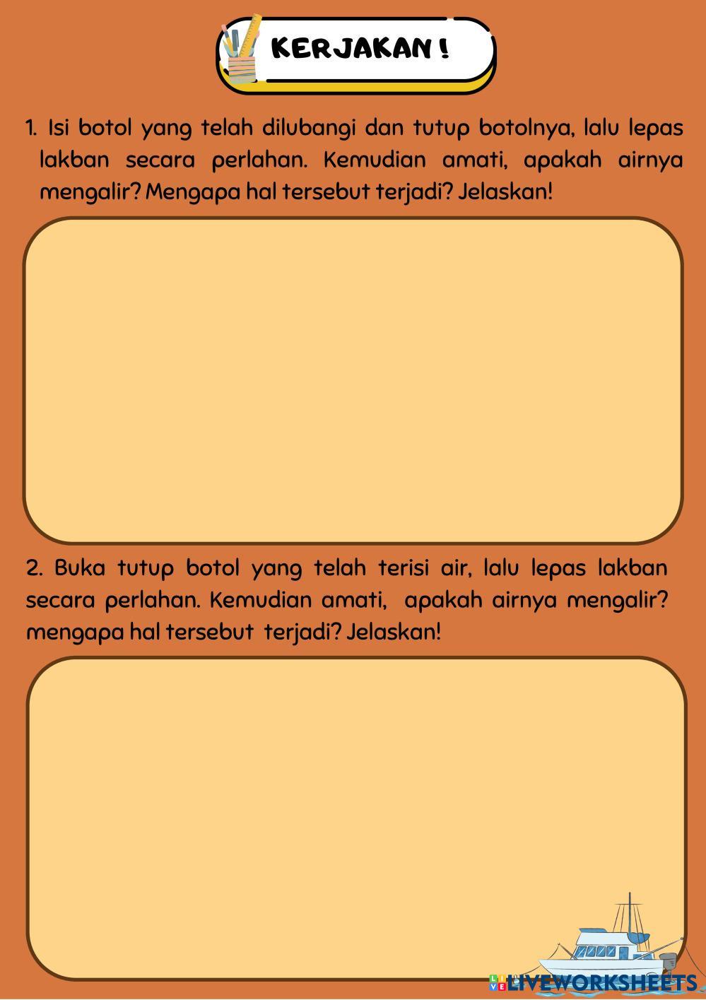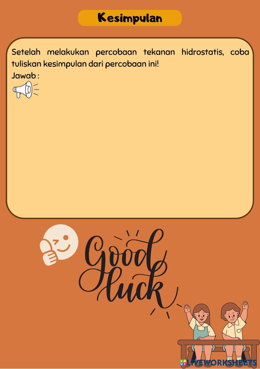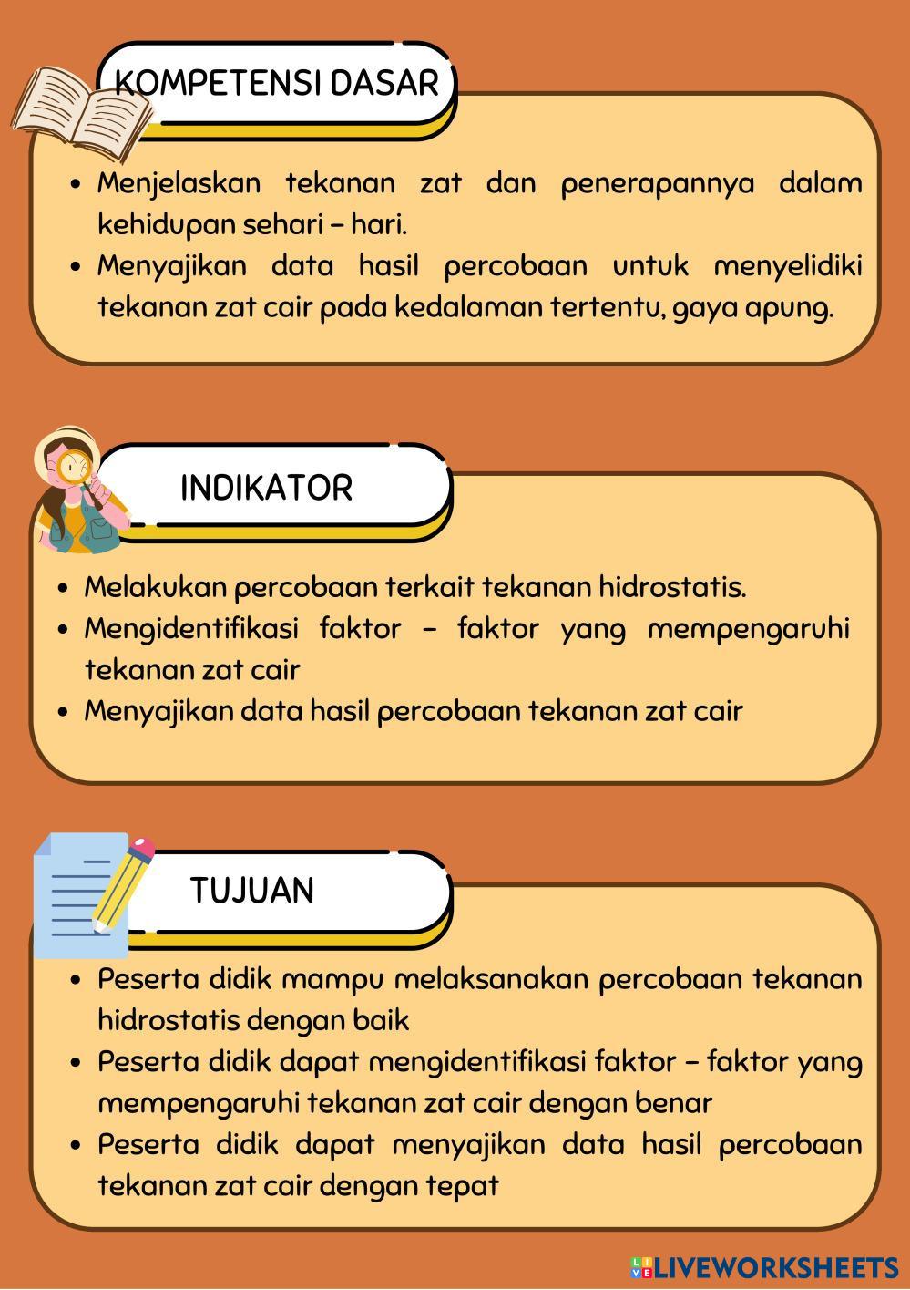 Created byNurul Faradillah Ilmu Pengetahuan Alam (IPA) Tekanan Hidrostatis Age 17-16 level: 11 Indonesian Author's Instructions Tekanan Hidrostatis My Google Classroom Courses × 0 classes selected (0 students total) Quick Access Select all classes (0 classes) All Classes Loading courses... Cancel Share Share to selected Course __COURSE_NAME__ __STUDENT_NAME__ (__STUDENT_EMAIL__) Tekanan Hidrostatis Download Worksheet Validation Check my answers Emails my answers to my teacher Full name Group/level School subject Teacher's email or key code Close Submit Validating worksheet... (12) Your answers have been sent to your teacher. Good luck! OK We encountered an error submitting your answers. Please try again. OK Advertisement | Go Ad Free Created byNurul Faradillah Ilmu Pengetahuan Alam (IPA) Tekanan Hidrostatis Age 17-16 level: 11 Indonesian Author's Instructions Tekanan Hidrostatis
