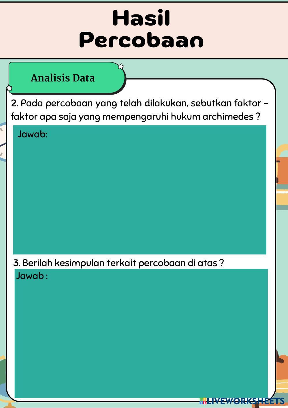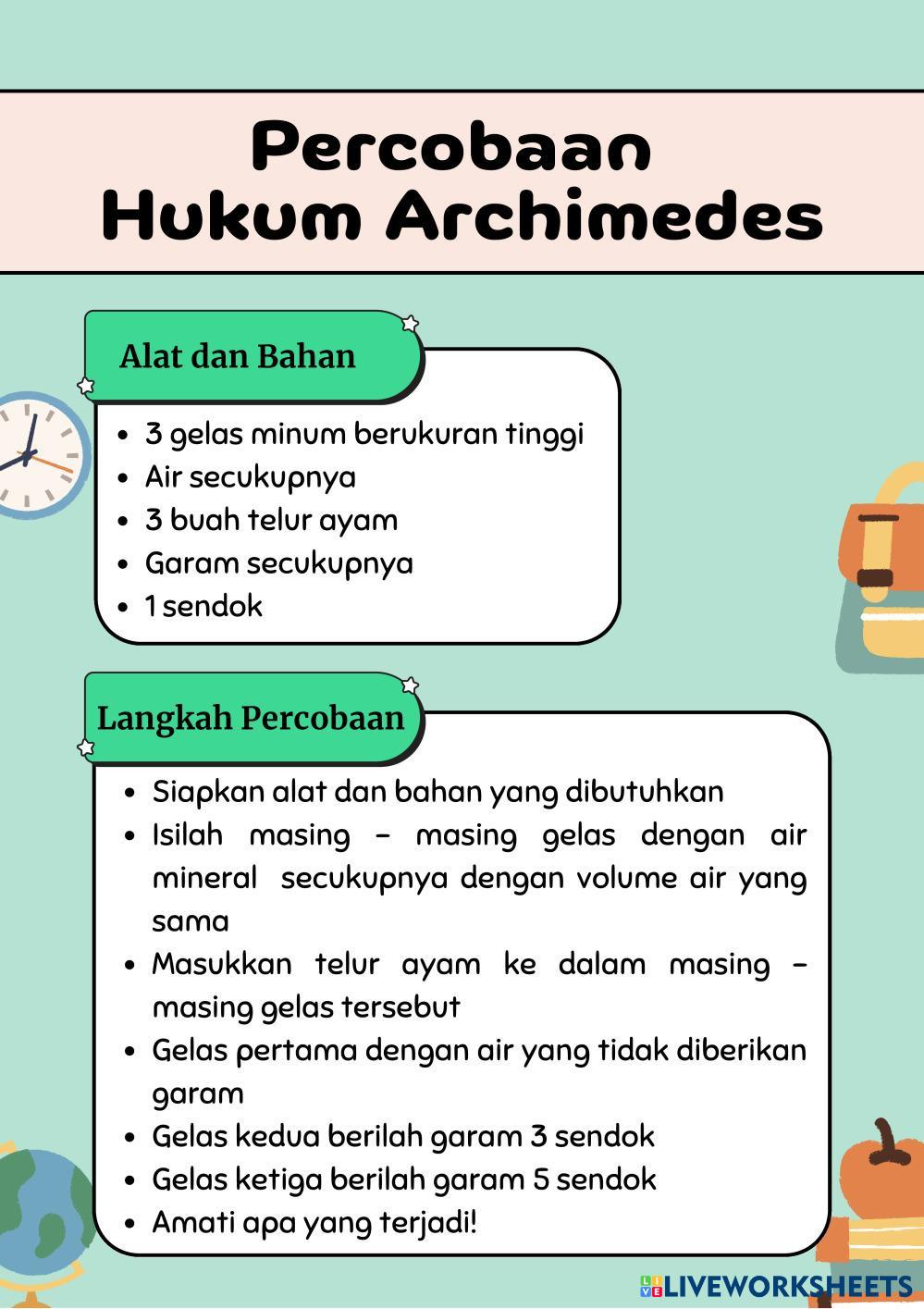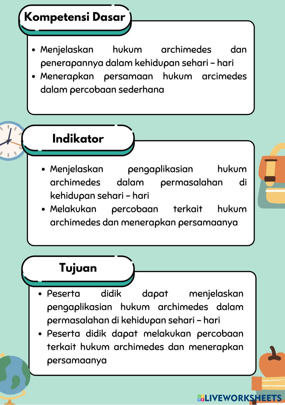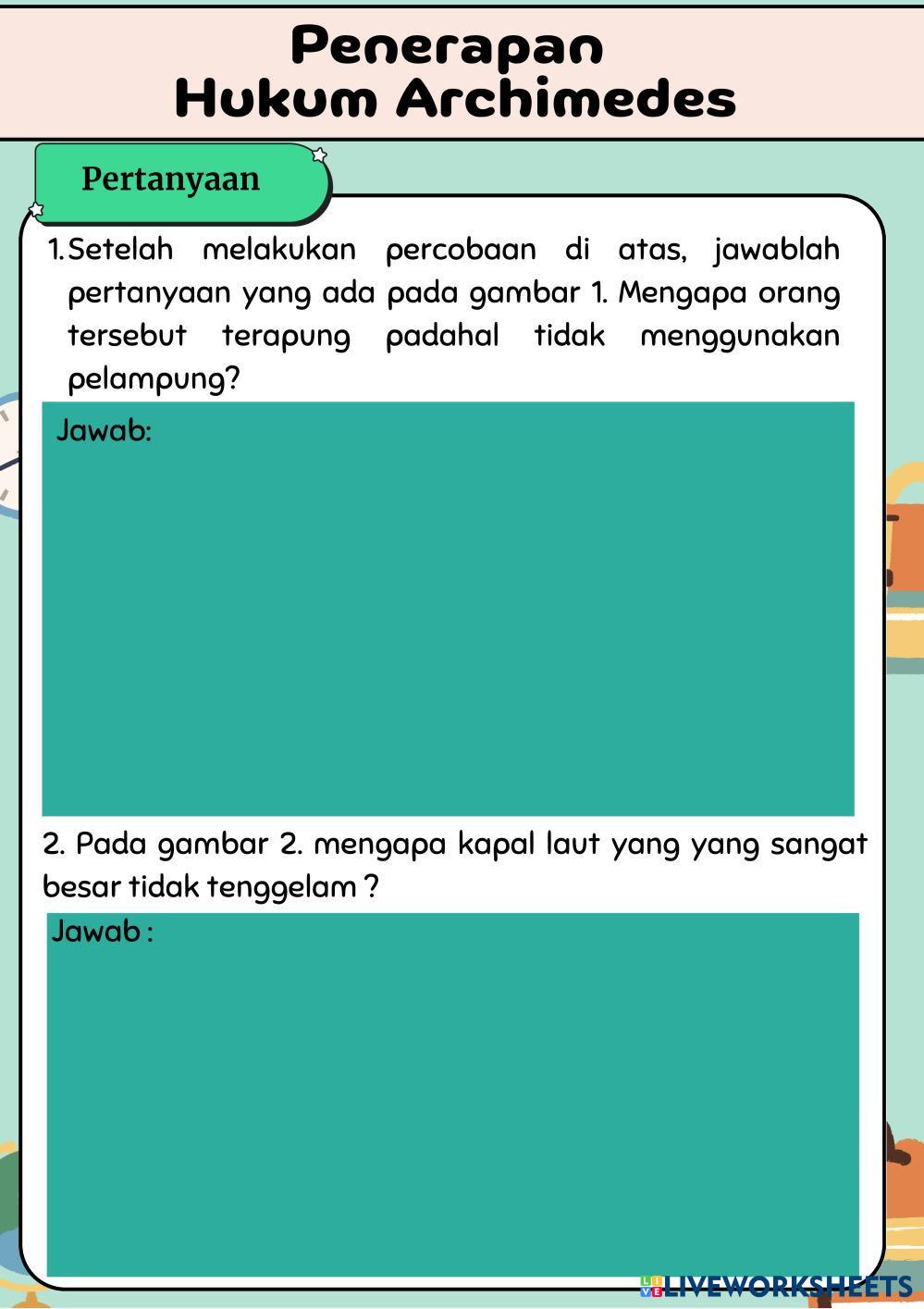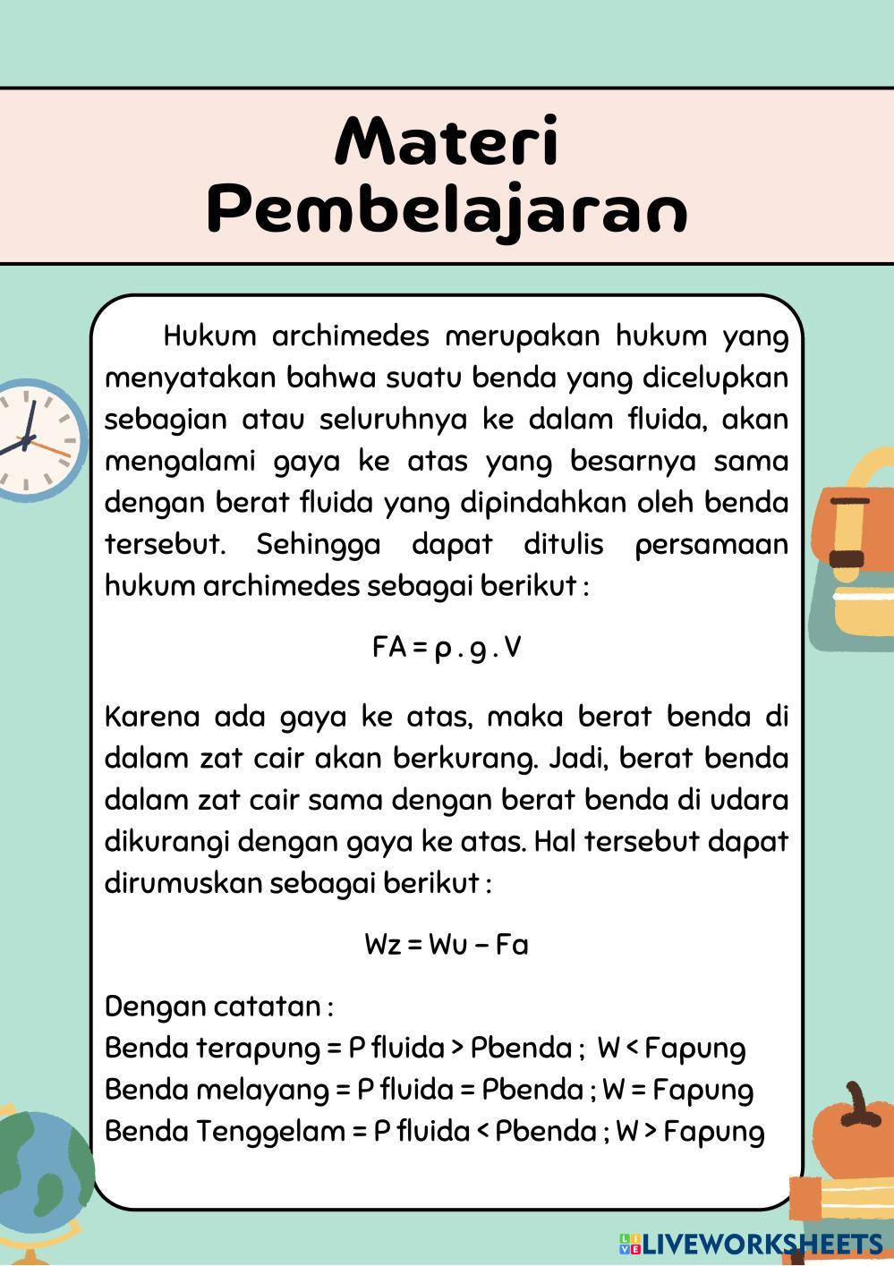 Created byNurul Faradillah Ilmu Pengetahuan Alam (IPA) Hukum Archimedes Age 17-16 level: 11 Indonesian Author's Instructions Hukum Archimedes My Google Classroom Courses × 0 classes selected (0 students total) Quick Access Select all classes (0 classes) All Classes Loading courses... Cancel Share Share to selected Course __COURSE_NAME__ __STUDENT_NAME__ (__STUDENT_EMAIL__) Hukum Archimedes Download Worksheet Validation Check my answers Emails my answers to my teacher Full name Group/level School subject Teacher's email or key code Close Submit Validating worksheet... (12) Your answers have been sent to your teacher. Good luck! OK We encountered an error submitting your answers. Please try again. OK Advertisement | Go Ad Free Created byNurul Faradillah Ilmu Pengetahuan Alam (IPA) Hukum Archimedes Age 17-16 level: 11 Indonesian Author's Instructions Hukum Archimedes