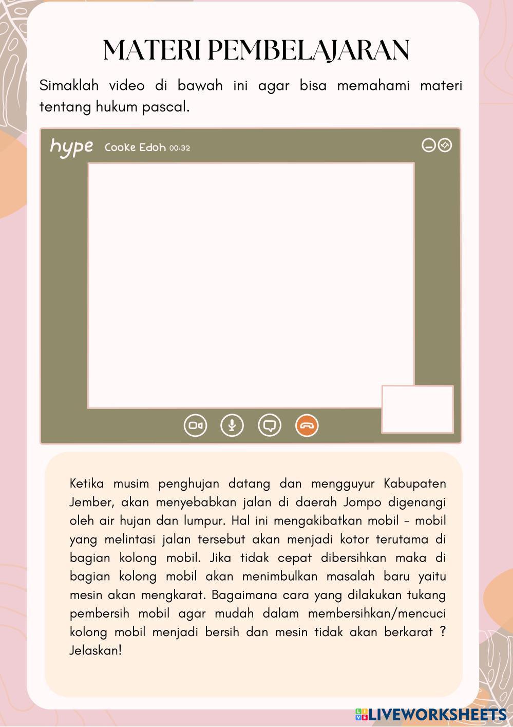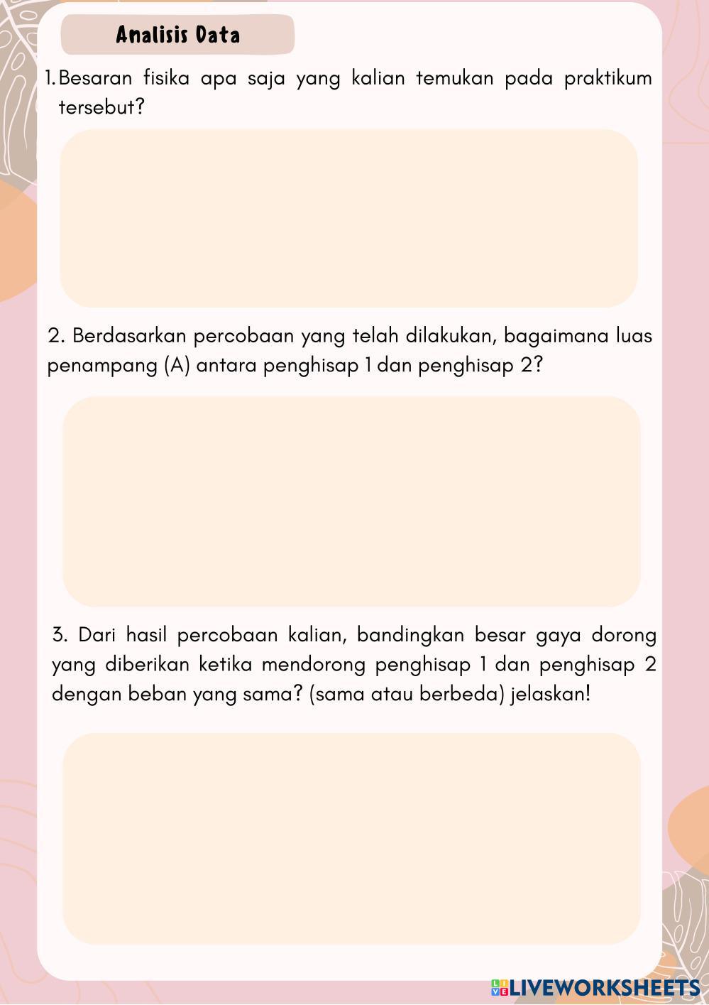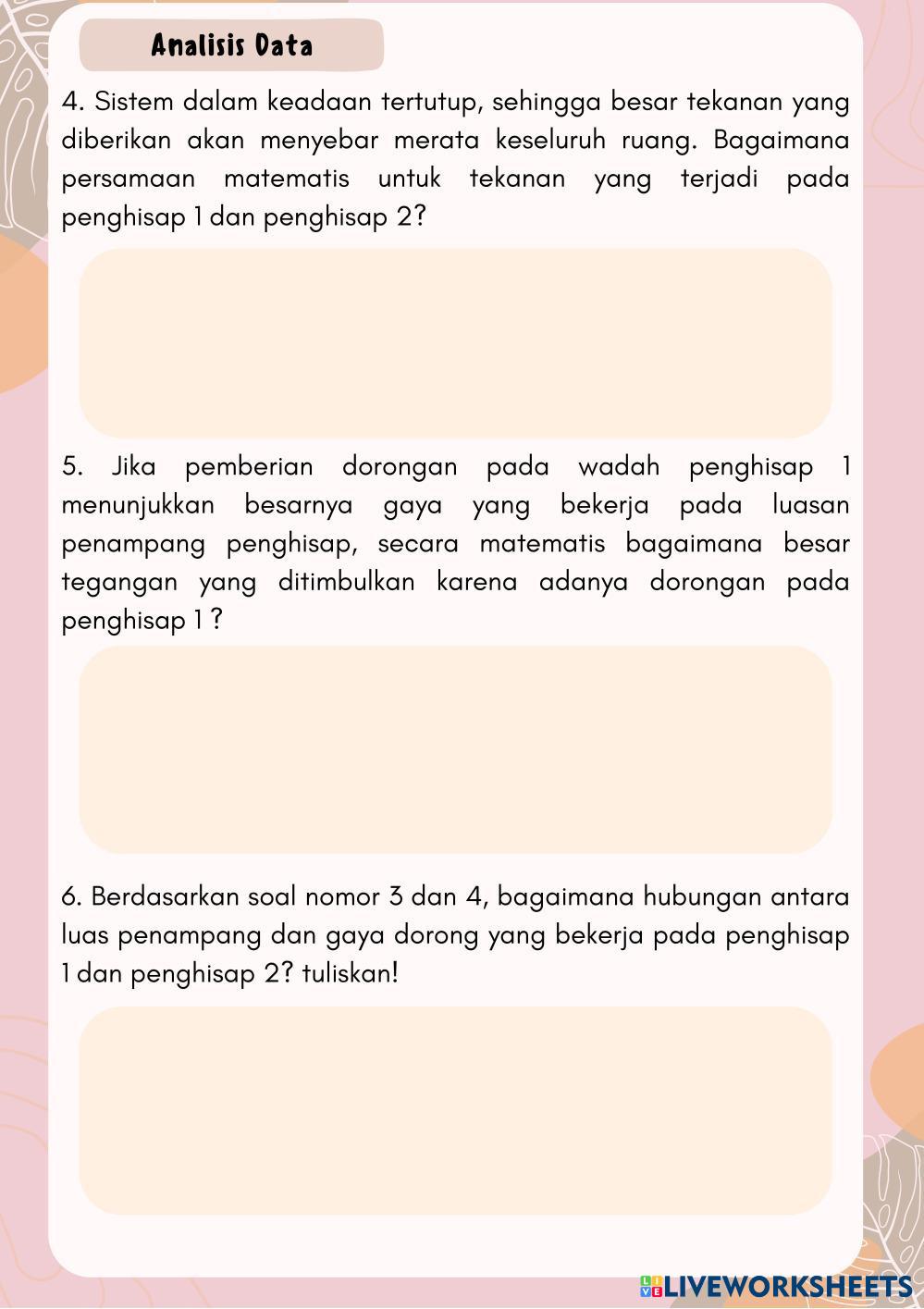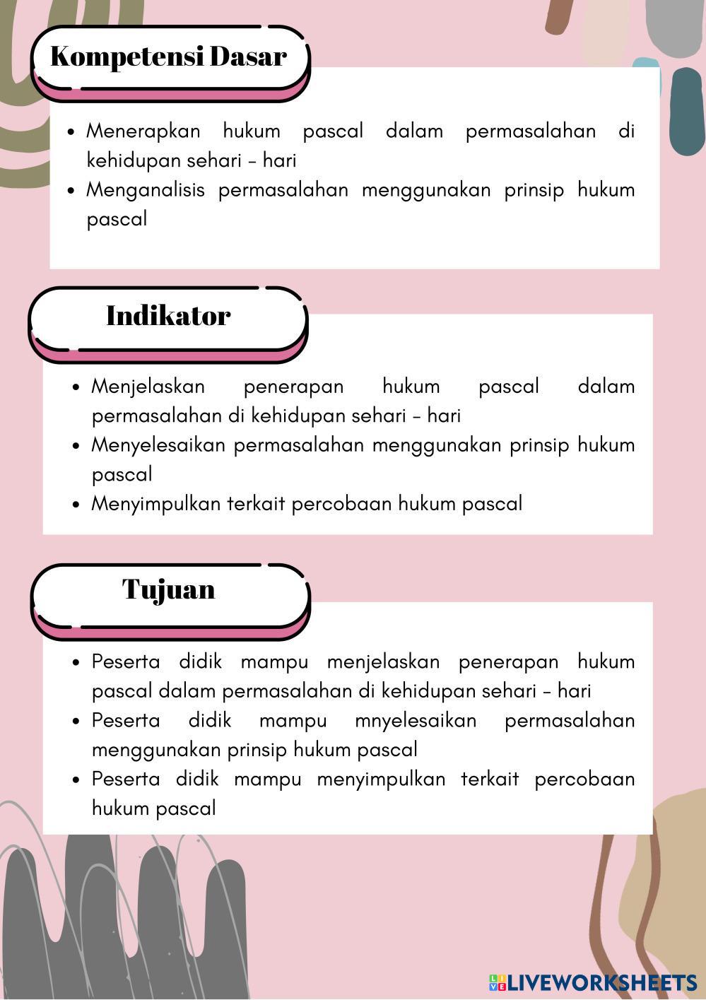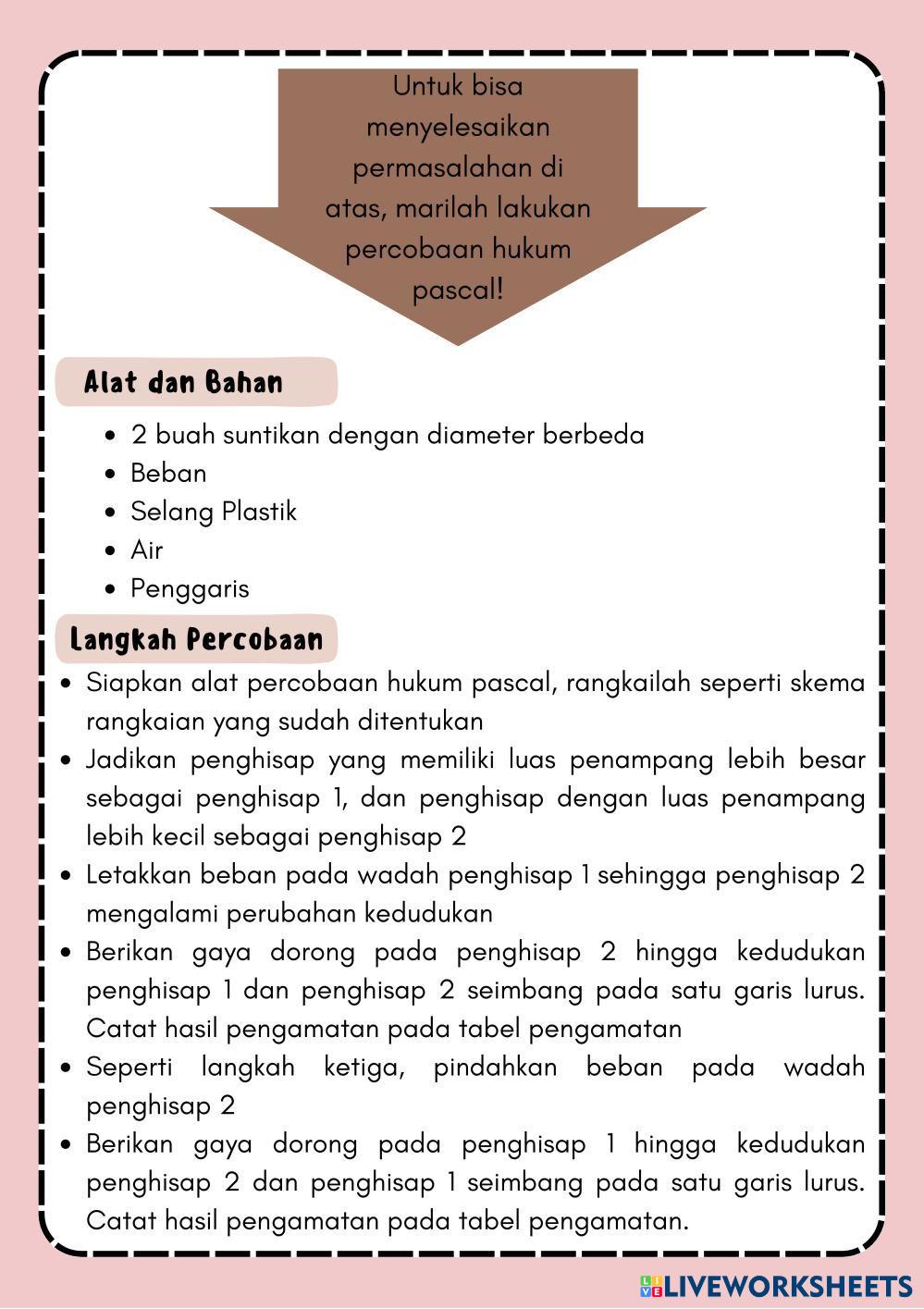 Created byNurul Faradillah Ilmu Pengetahuan Alam (IPA) Hukum Pascal Age 17-16 level: 11 Indonesian Author's Instructions Hukum Pascal My Google Classroom Courses × 0 classes selected (0 students total) Quick Access Select all classes (0 classes) All Classes Loading courses... Cancel Share Share to selected Course __COURSE_NAME__ __STUDENT_NAME__ (__STUDENT_EMAIL__) Hukum Pascal Download Worksheet Validation Check my answers Emails my answers to my teacher Full name Group/level School subject Teacher's email or key code Close Submit Validating worksheet... (12) Your answers have been sent to your teacher. Good luck! OK We encountered an error submitting your answers. Please try again. OK Advertisement | Go Ad Free Created byNurul Faradillah Ilmu Pengetahuan Alam (IPA) Hukum Pascal Age 17-16 level: 11 Indonesian Author's Instructions Hukum Pascal