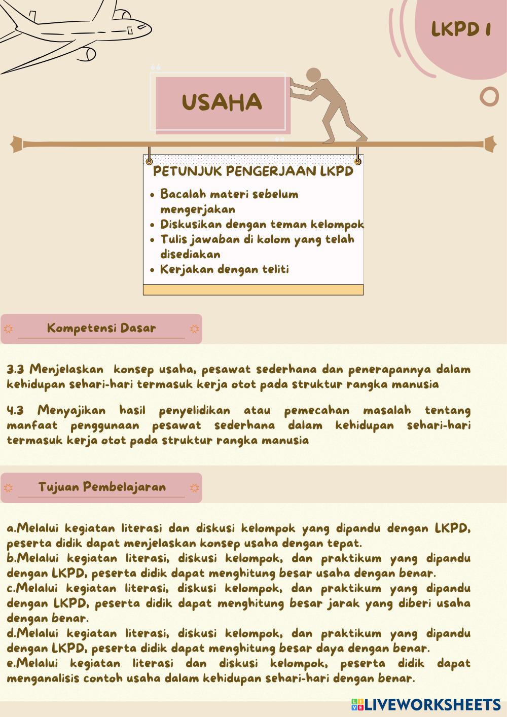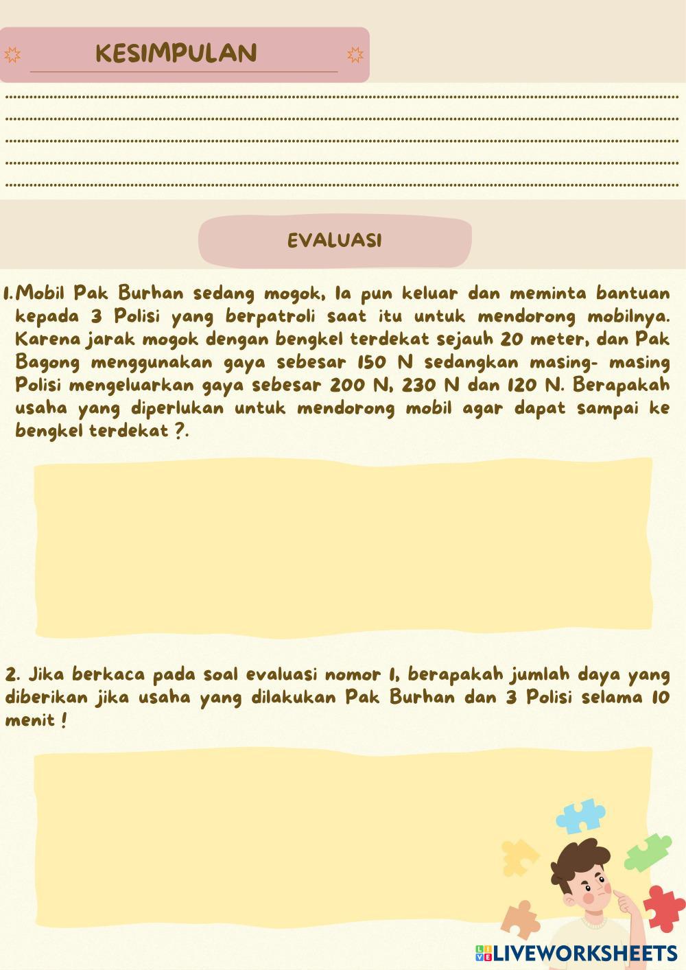 Created by Ayu11 Ilmu Pengetahuan Alam (IPA) Usaha, Energi dan Pesawat Sederhana Age 13-18 level: 8 Indonesian Author's Instructions My Google Classroom Courses × 0 classes selected (0 students total) Quick Access Select all classes (0 classes) All Classes Loading courses... Cancel Share Share to selected Course __COURSE_NAME__ __STUDENT_NAME__ (__STUDENT_EMAIL__) LKPD PERTEMUAN 1 Download Worksheet Validation Check my answers Emails my answers to my teacher Full name Group/level School subject Teacher's email or key code Close Submit Validating worksheet... (12) Your answers have been sent to your teacher. Good luck! OK We encountered an error submitting your answers. Please try again. OK Advertisement | Go Ad Free Created by Ayu11 Ilmu Pengetahuan Alam (IPA) Usaha, Energi dan Pesawat Sederhana Age 13-18 level: 8 Indonesian Author's Instructions