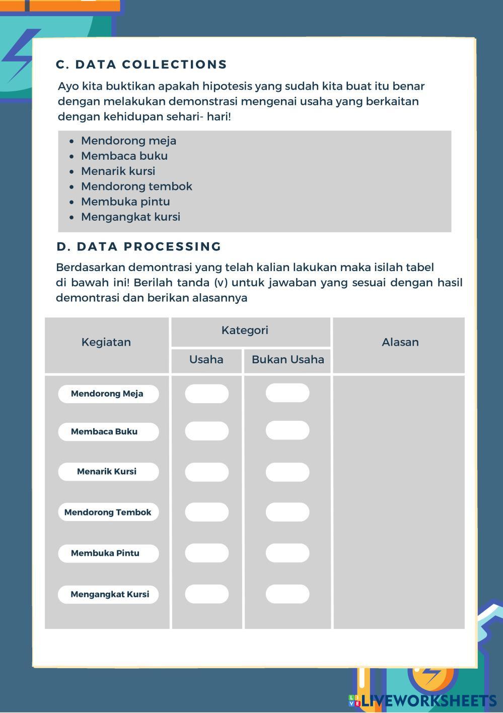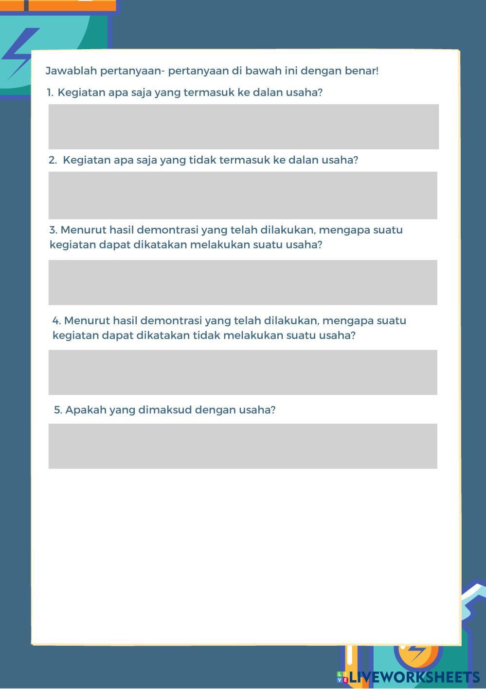 Created byRisia Hanifa Ramadhani Ilmu Pengetahuan Alam (IPA) Usaha Age 14+ level: 8 Indonesian Author's Instructions My Google Classroom Courses × 0 classes selected (0 students total) Quick Access Select all classes (0 classes) All Classes Loading courses... Cancel Share Share to selected Course __COURSE_NAME__ __STUDENT_NAME__ (__STUDENT_EMAIL__) LKPD Usaha Download Worksheet Validation Check my answers Emails my answers to my teacher Full name Group/level School subject Teacher's email or key code Close Submit Validating worksheet... (12) Your answers have been sent to your teacher. Good luck! OK We encountered an error submitting your answers. Please try again. OK Advertisement | Go Ad Free Created byRisia Hanifa Ramadhani Ilmu Pengetahuan Alam (IPA) Usaha Age 14+ level: 8 Indonesian Author's Instructions