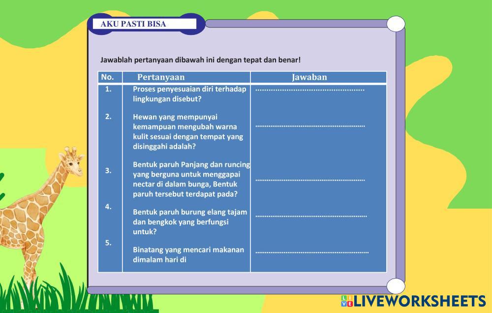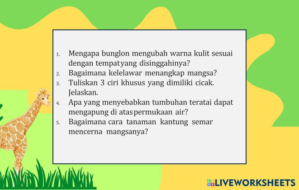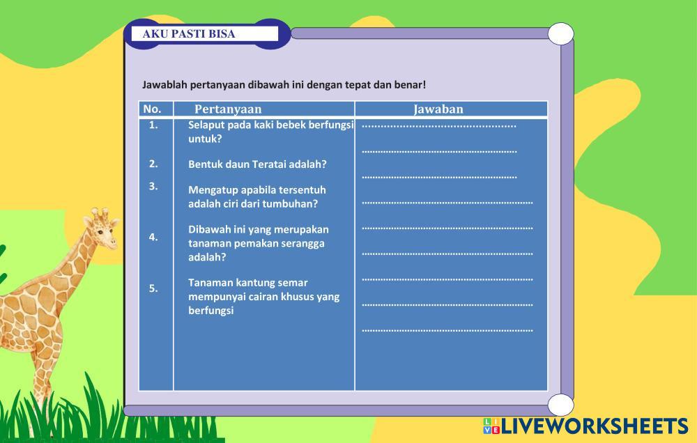 Created byKadekErawati Ilmu Pengetahuan Alam (IPA) Ciri Khusus Makhluk Hidup dan Lingkungan Hidupnya Age 8-15 level: 2 Indonesian Author's Instructions My Google Classroom Courses × 0 classes selected (0 students total) Quick Access Select all classes (0 classes) All Classes Loading courses... Cancel Share Share to selected Course __COURSE_NAME__ __STUDENT_NAME__ (__STUDENT_EMAIL__) E-LKPD Download Worksheet Validation Check my answers Emails my answers to my teacher Full name Group/level School subject Teacher's email or key code Close Submit Validating worksheet... (12) Your answers have been sent to your teacher. Good luck! OK We encountered an error submitting your answers. Please try again. OK Advertisement | Go Ad Free Created byKadekErawati Ilmu Pengetahuan Alam (IPA) Ciri Khusus Makhluk Hidup dan Lingkungan Hidupnya Age 8-15 level: 2 Indonesian Author's Instructions
