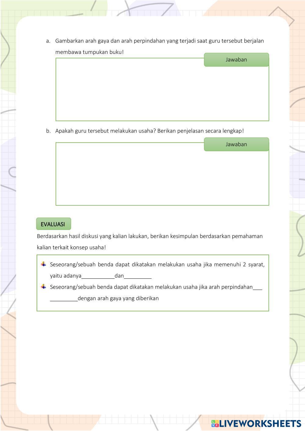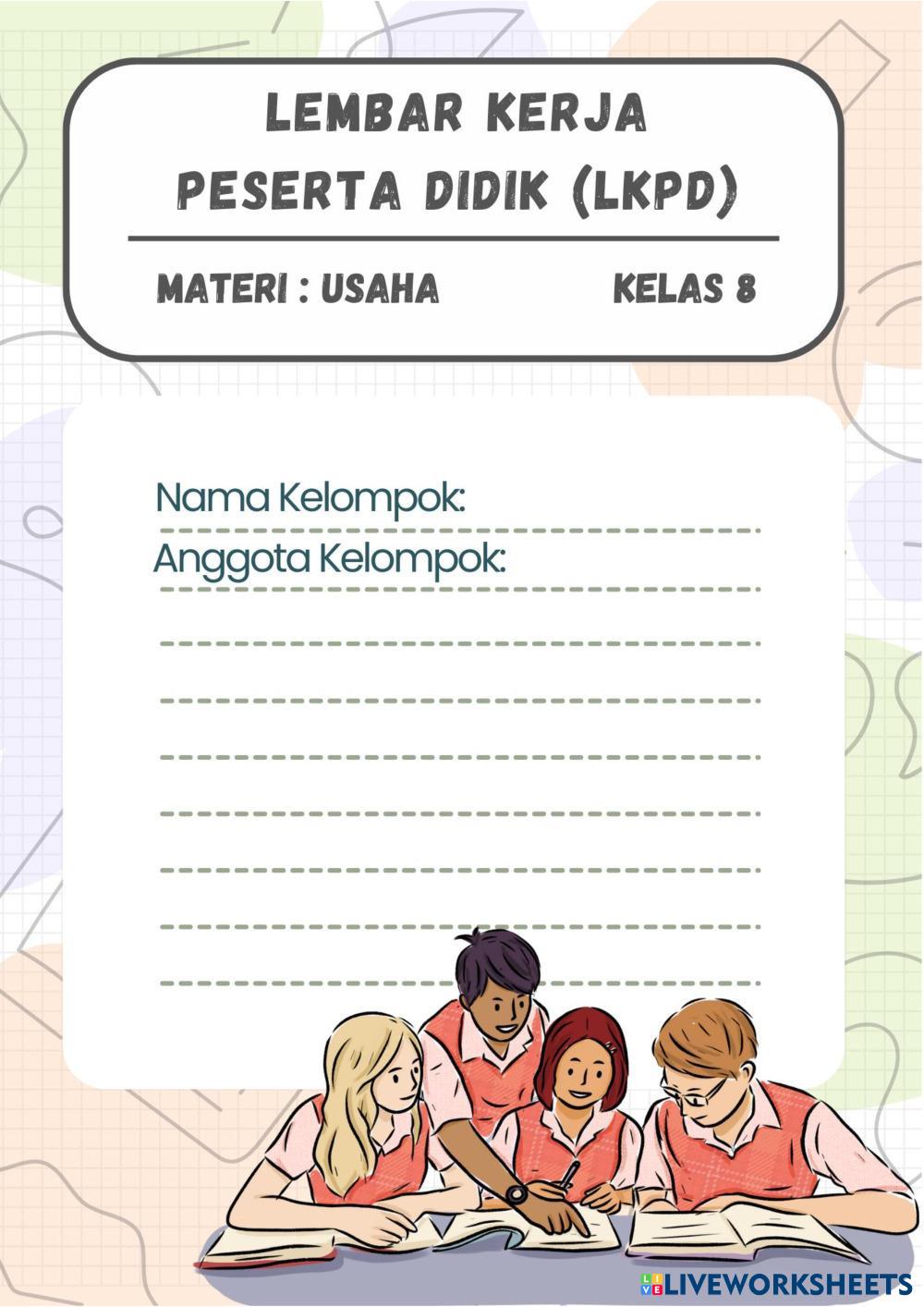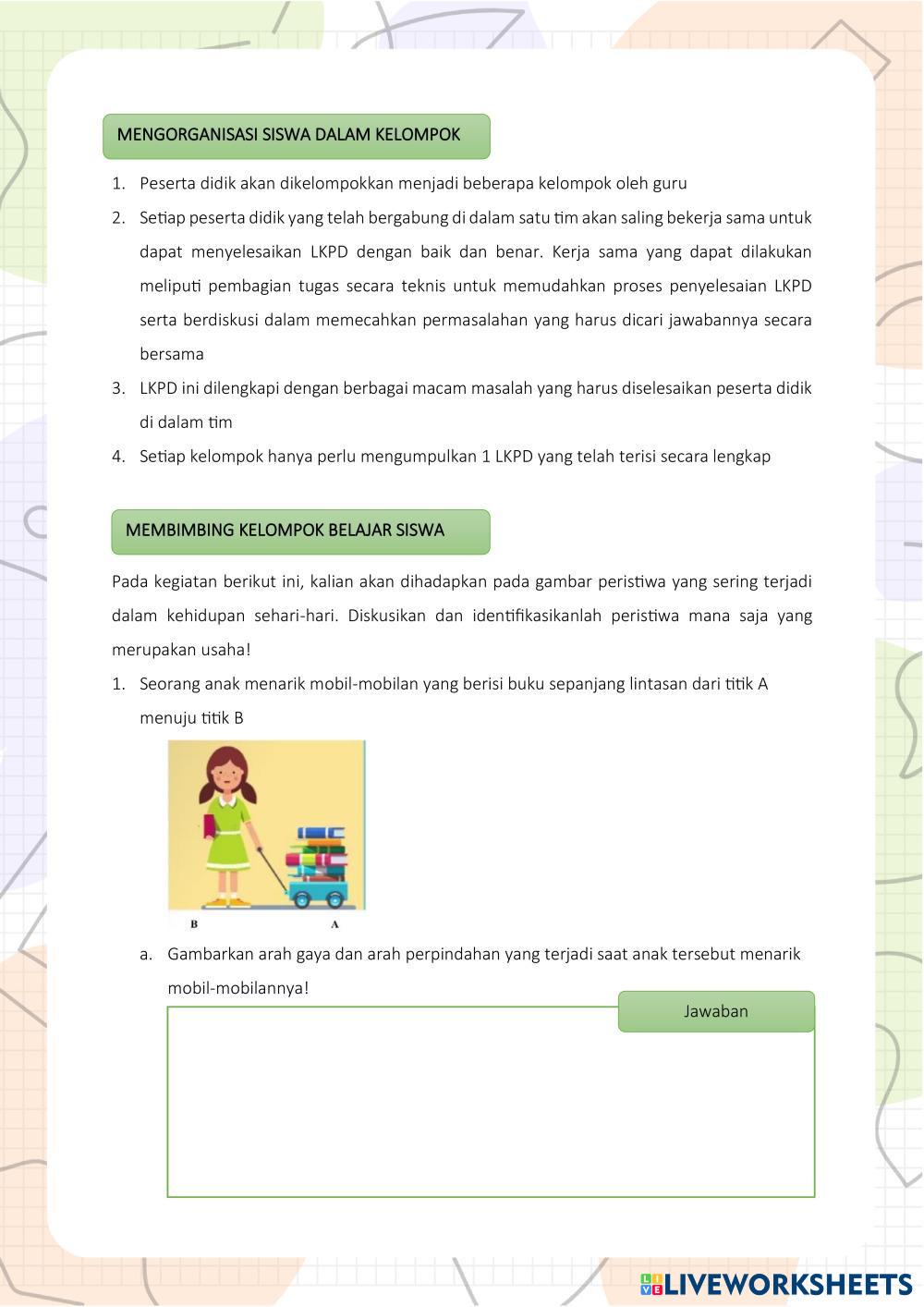 Created byDhiana Wardhani Ilmu Pengetahuan Alam (IPA) Usaha Age 10+ level: 8 Indonesian Author's Instructions My Google Classroom Courses × 0 classes selected (0 students total) Quick Access Select all classes (0 classes) All Classes Loading courses... Cancel Share Share to selected Course __COURSE_NAME__ __STUDENT_NAME__ (__STUDENT_EMAIL__) LKPD USAHA Download Worksheet Validation Check my answers Emails my answers to my teacher Full name Group/level School subject Teacher's email or key code Close Submit Validating worksheet... (12) Your answers have been sent to your teacher. Good luck! OK We encountered an error submitting your answers. Please try again. OK Advertisement | Go Ad Free Created byDhiana Wardhani Ilmu Pengetahuan Alam (IPA) Usaha Age 10+ level: 8 Indonesian Author's Instructions