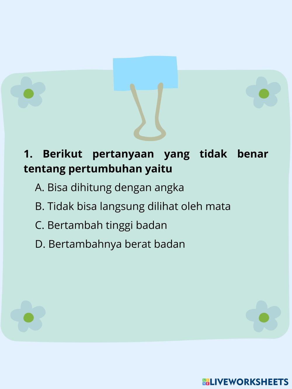 Created byTiti Fitriawati Ilmu Pengetahuan Alam (IPA) Pertumbuhan dan perkembangan tumbuhan Age 7-15 level: 3 Indonesian Author's Instructions PERTUMBUHAN DAN PERKEMBANGAN TANAMAN My Google Classroom Courses × 0 classes selected (0 students total) Quick Access Select all classes (0 classes) All Classes Loading courses... Cancel Share Share to selected Course __COURSE_NAME__ __STUDENT_NAME__ (__STUDENT_EMAIL__) PERTUMBUHAN DAN PERKEMBANGAN TANAMAN Download Worksheet Validation Check my answers Emails my answers to my teacher Full name Group/level School subject Teacher's email or key code Close Submit Validating worksheet... (12) Your answers have been sent to your teacher. Good luck! OK We encountered an error submitting your answers. Please try again. OK Advertisement | Go Ad Free Created byTiti Fitriawati Ilmu Pengetahuan Alam (IPA) Pertumbuhan dan perkembangan tumbuhan Age 7-15 level: 3 Indonesian Author's Instructions PERTUMBUHAN DAN PERKEMBANGAN TANAMAN