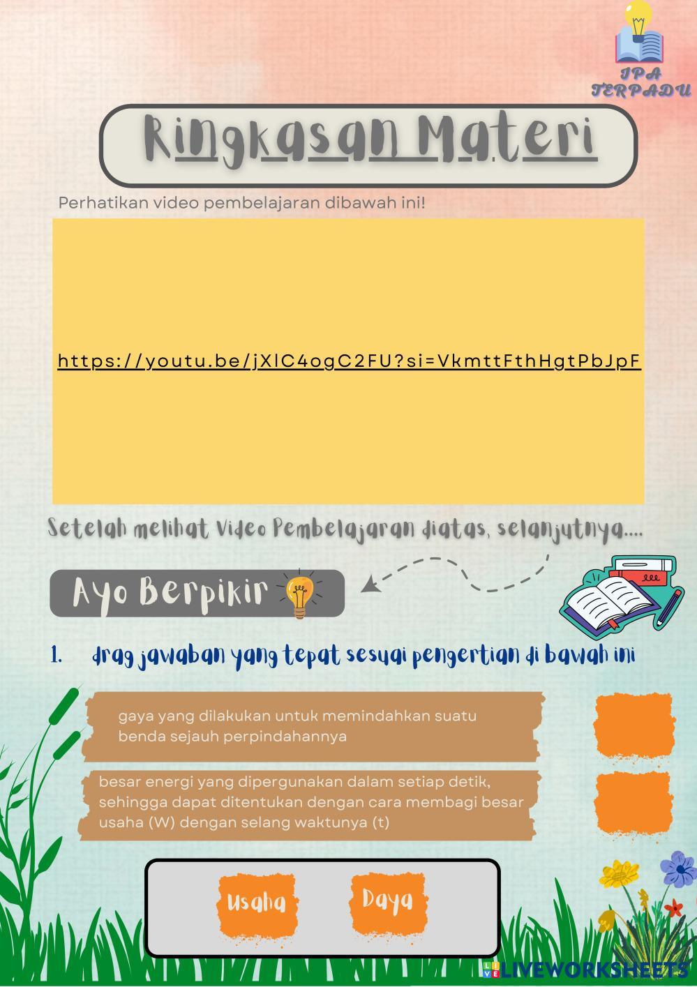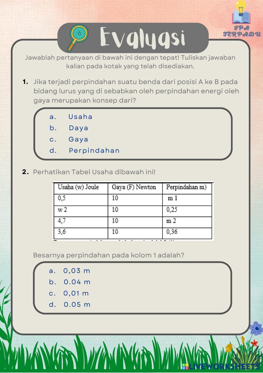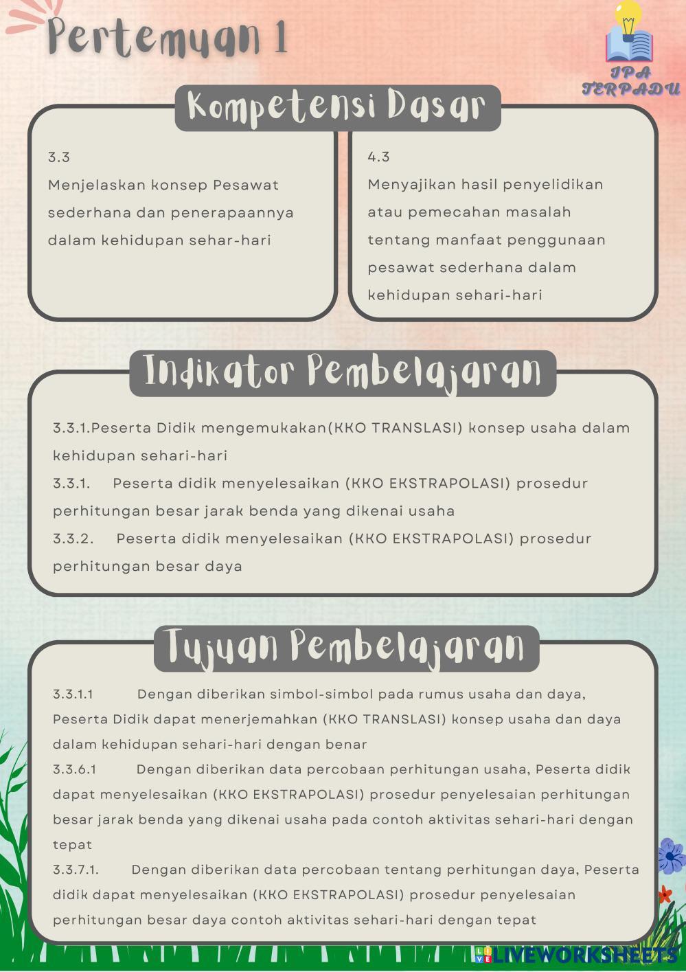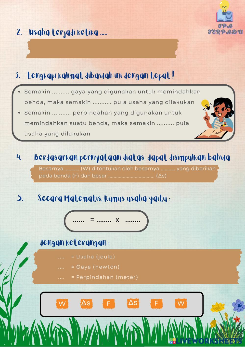 Created byNurkhalifah Febrianty Syah Ilmu Pengetahuan Alam (IPA) Usaha dan pesawat sederhana Age 11+ level: 3 Indonesian Author's Instructions My Google Classroom Courses × 0 classes selected (0 students total) Quick Access Select all classes (0 classes) All Classes Loading courses... Cancel Share Share to selected Course __COURSE_NAME__ __STUDENT_NAME__ (__STUDENT_EMAIL__) LKPD USAHA DAN PESAWAT SEDERHANA - PERTEMUAN 1 Download Worksheet Validation Check my answers Emails my answers to my teacher Full name Group/level School subject Teacher's email or key code Close Submit Validating worksheet... (12) Your answers have been sent to your teacher. Good luck! OK We encountered an error submitting your answers. Please try again. OK Advertisement | Go Ad Free Created byNurkhalifah Febrianty Syah Ilmu Pengetahuan Alam (IPA) Usaha dan pesawat sederhana Age 11+ level: 3 Indonesian Author's Instructions