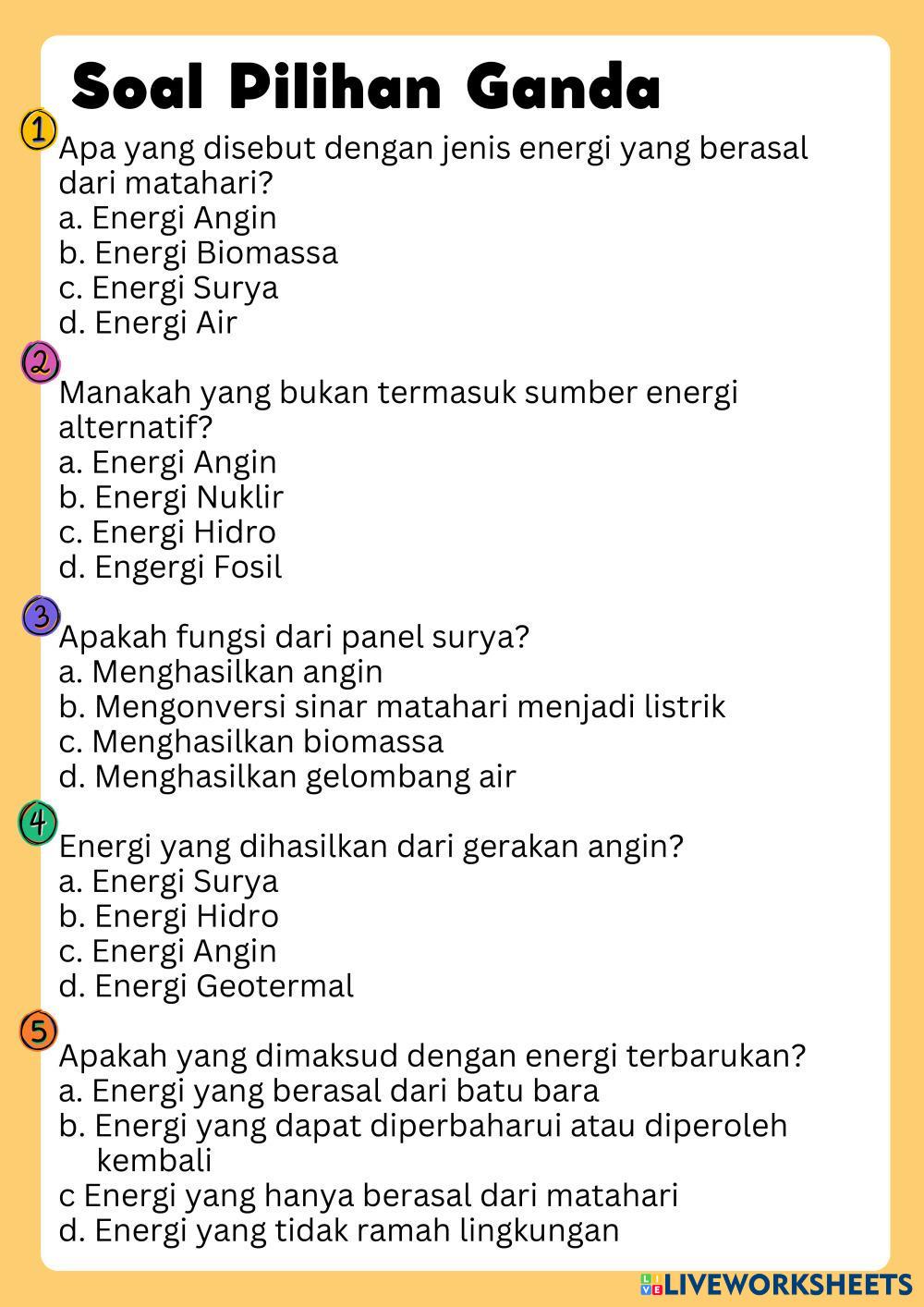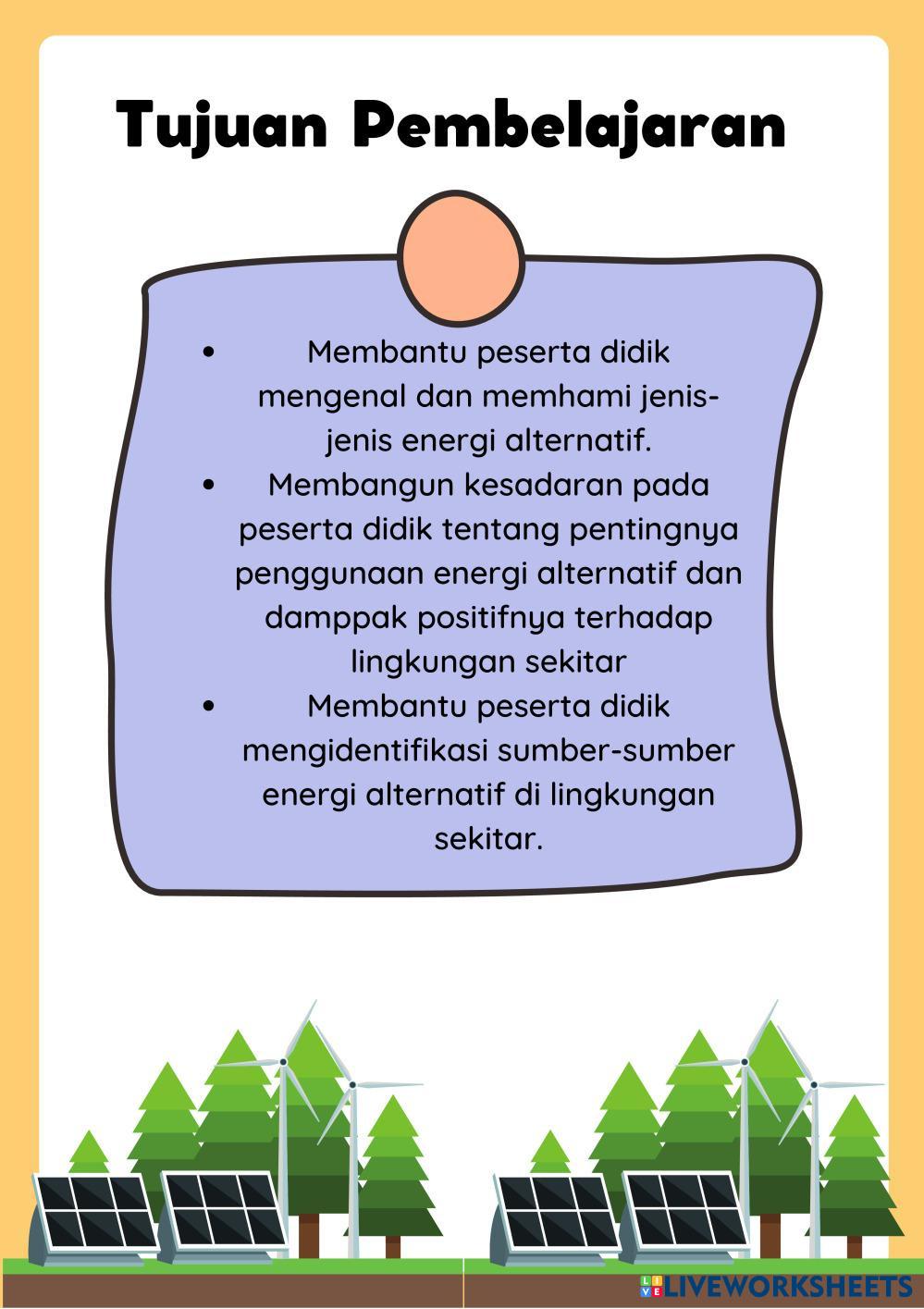 Created byArlusi Listiyani Ilmu Pengetahuan Alam (IPA) Energi Alternatif Age 9+ level: 5 Indonesian Author's Instructions My Google Classroom Courses × 0 classes selected (0 students total) Quick Access Select all classes (0 classes) All Classes Loading courses... Cancel Share Share to selected Course __COURSE_NAME__ __STUDENT_NAME__ (__STUDENT_EMAIL__) Energi Alternatif Download Worksheet Validation Check my answers Emails my answers to my teacher Full name Group/level School subject Teacher's email or key code Close Submit Validating worksheet... (12) Your answers have been sent to your teacher. Good luck! OK We encountered an error submitting your answers. Please try again. OK Advertisement | Go Ad Free Created byArlusi Listiyani Ilmu Pengetahuan Alam (IPA) Energi Alternatif Age 9+ level: 5 Indonesian Author's Instructions