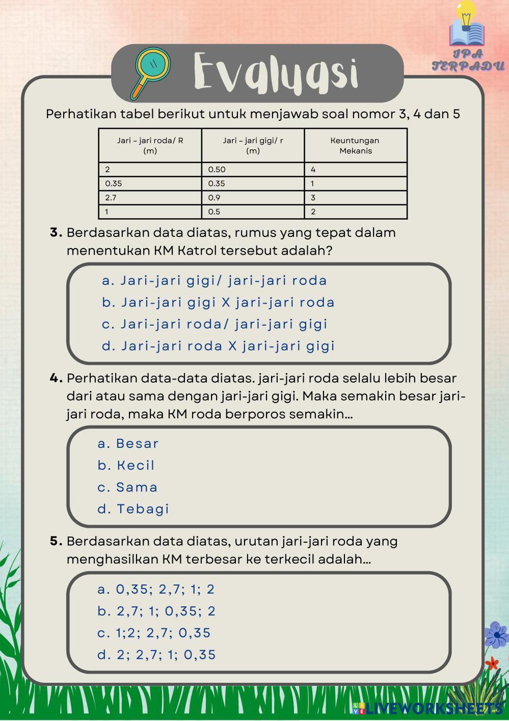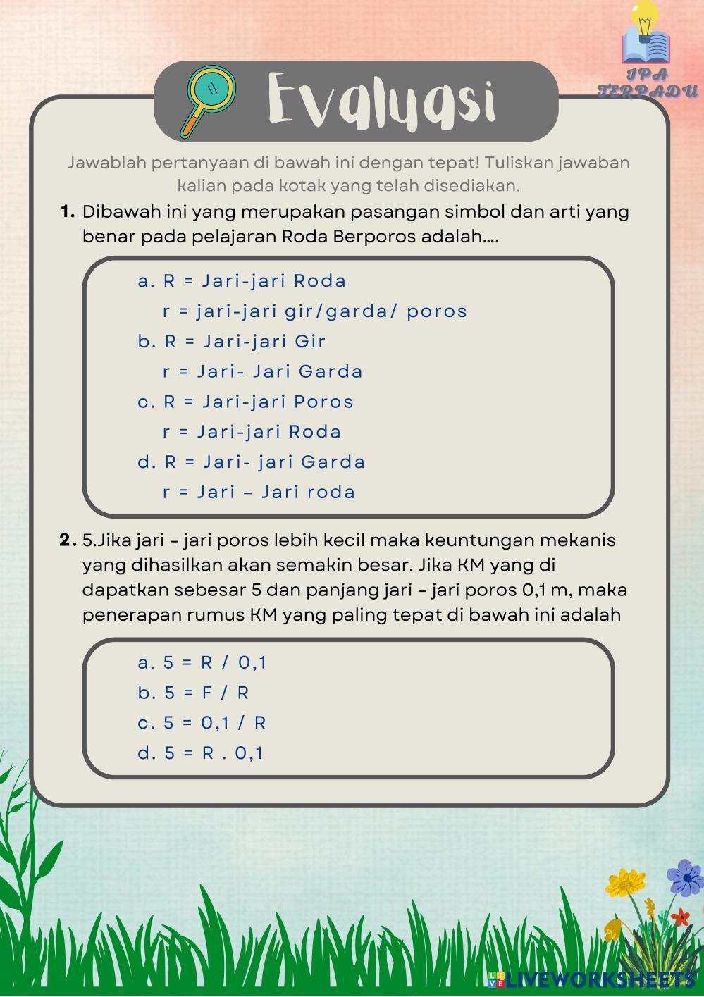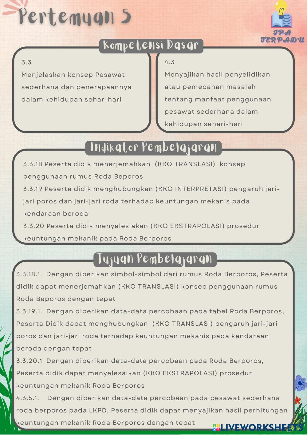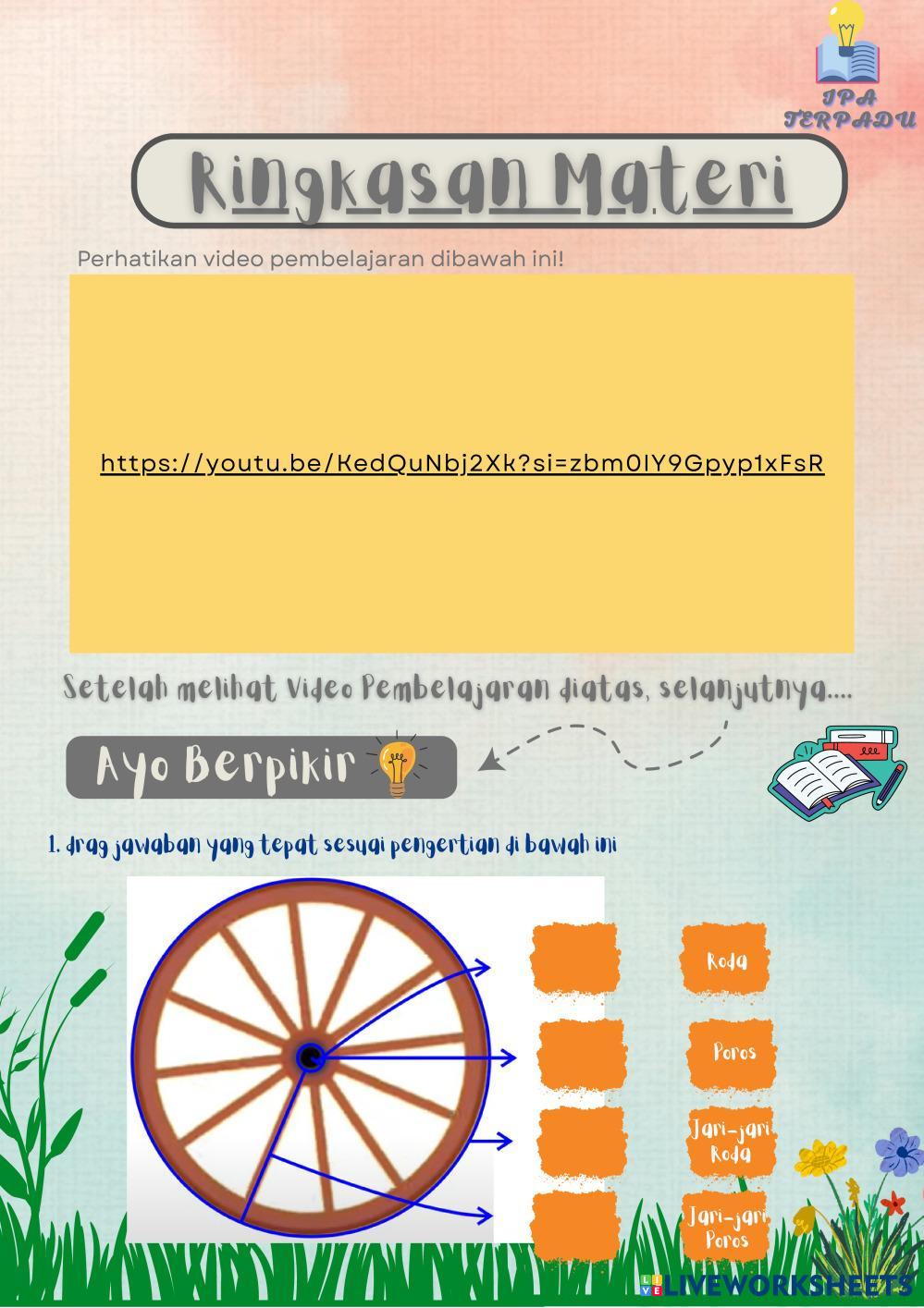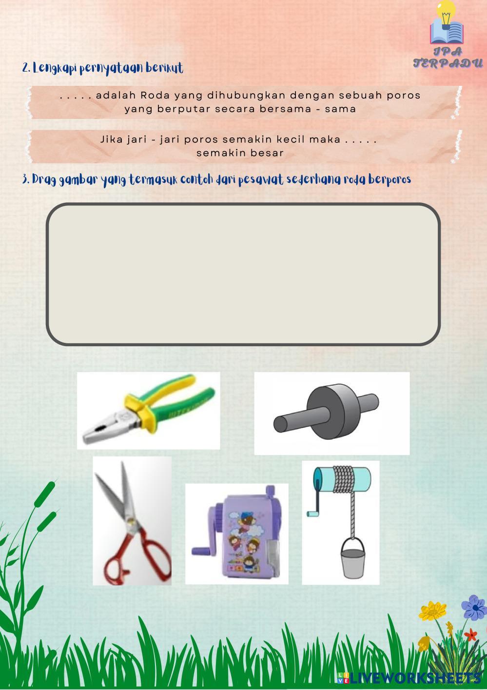 Created byNurkhalifah Febrianty Syah Ilmu Pengetahuan Alam (IPA) Katrol dan Roda Berporos Age 11+ level: 3 Indonesian Author's Instructions My Google Classroom Courses × 0 classes selected (0 students total) Quick Access Select all classes (0 classes) All Classes Loading courses... Cancel Share Share to selected Course __COURSE_NAME__ __STUDENT_NAME__ (__STUDENT_EMAIL__) LKPD USAHA DAN PESAWAT SEDERHANA - PERTEMUAN 2 (part 2) Download Worksheet Validation Check my answers Emails my answers to my teacher Full name Group/level School subject Teacher's email or key code Close Submit Validating worksheet... (12) Your answers have been sent to your teacher. Good luck! OK We encountered an error submitting your answers. Please try again. OK Advertisement | Go Ad Free Created byNurkhalifah Febrianty Syah Ilmu Pengetahuan Alam (IPA) Katrol dan Roda Berporos Age 11+ level: 3 Indonesian Author's Instructions