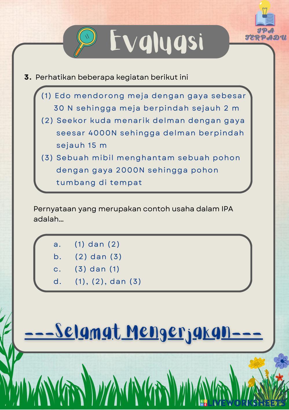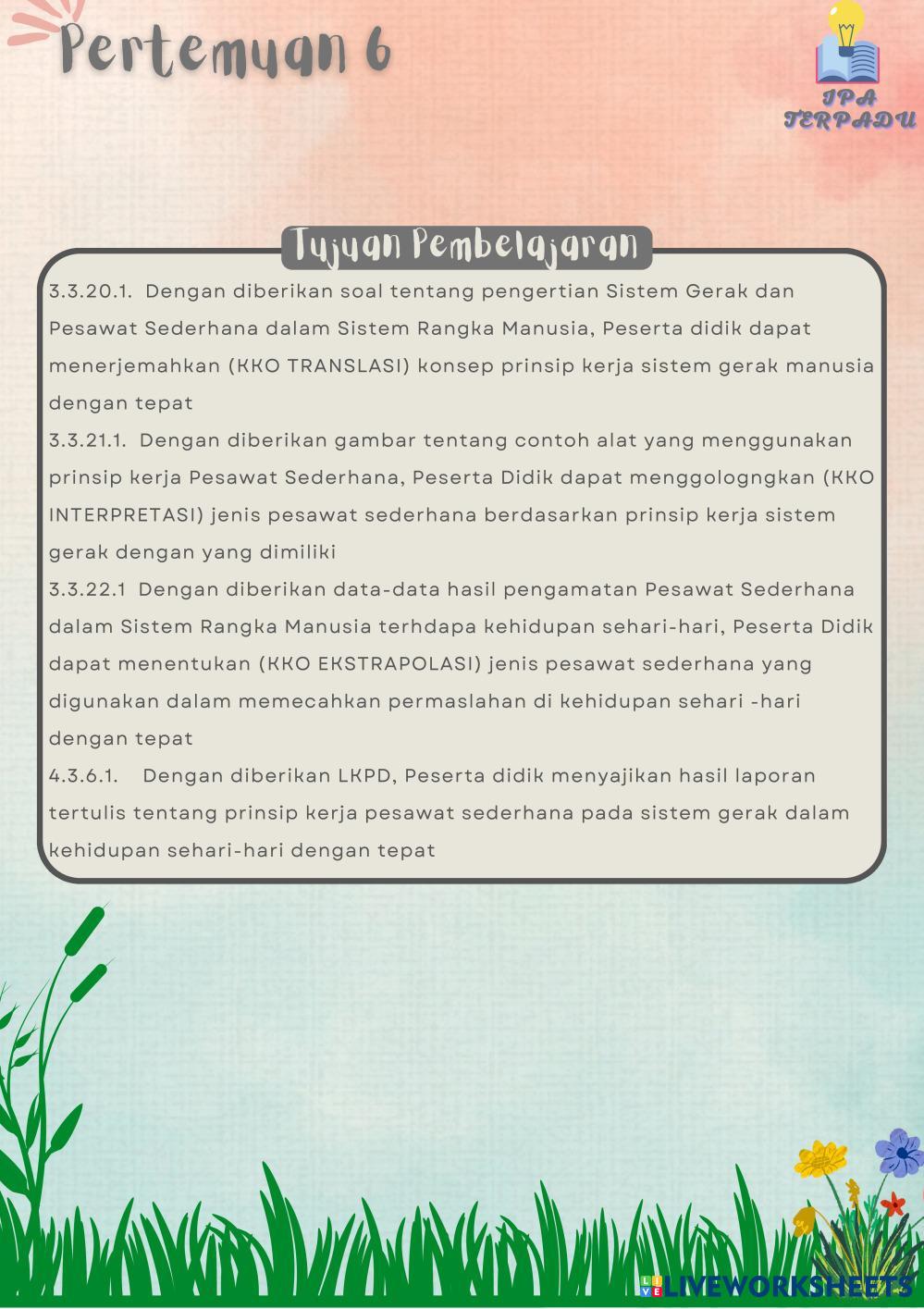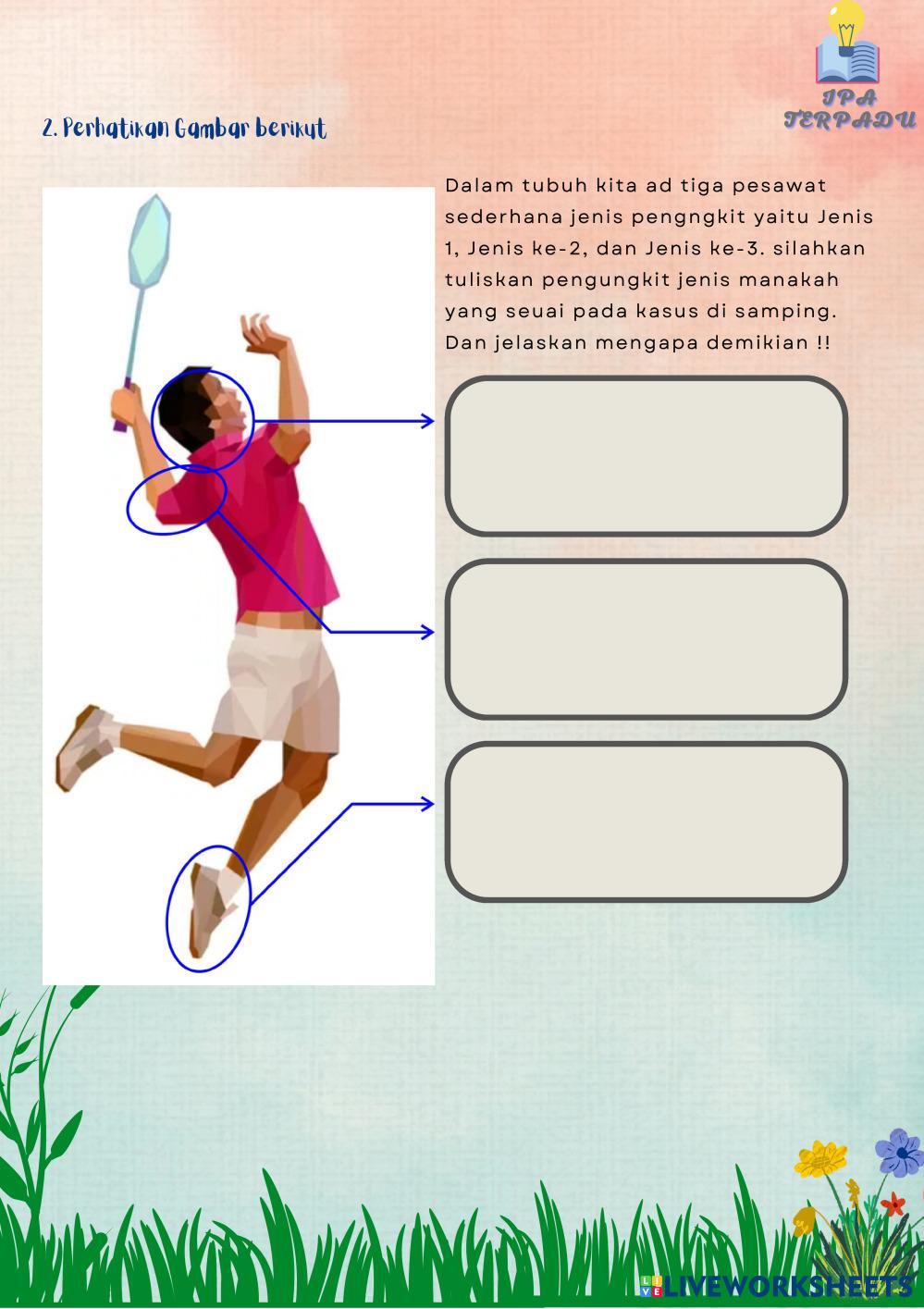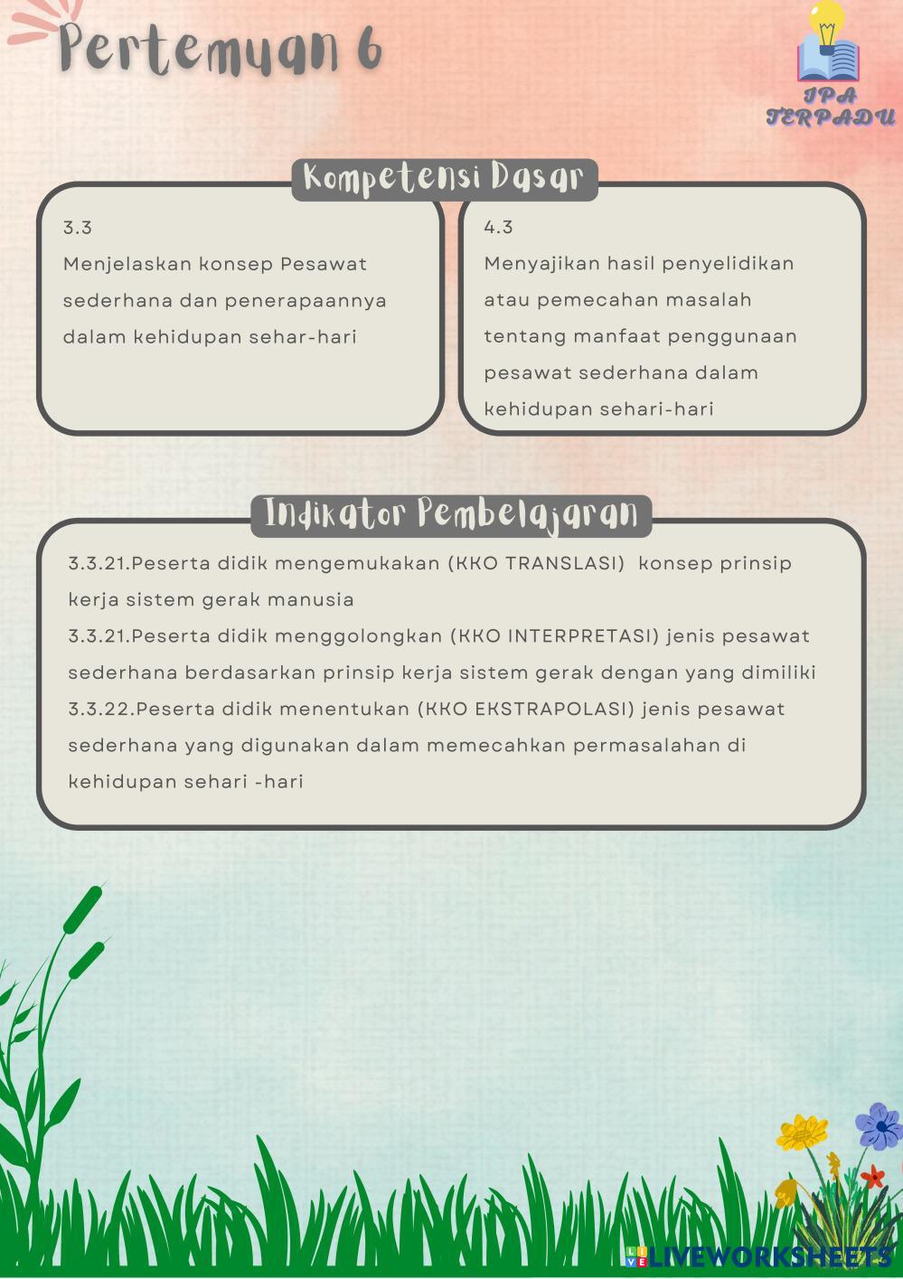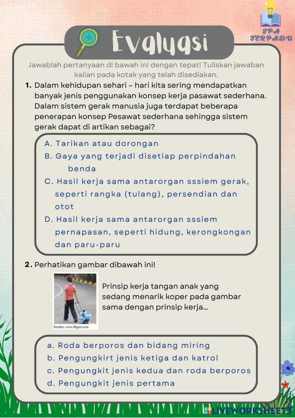 Created byNurkhalifah Febrianty Syah Ilmu Pengetahuan Alam (IPA) Sistem Gerak Manusia Age 11+ level: 3 Indonesian Author's Instructions My Google Classroom Courses × 0 classes selected (0 students total) Quick Access Select all classes (0 classes) All Classes Loading courses... Cancel Share Share to selected Course __COURSE_NAME__ __STUDENT_NAME__ (__STUDENT_EMAIL__) LKPD USAHA DAN PESAWAT SEDERHANA - PERTEMUAN 4 Download Worksheet Validation Check my answers Emails my answers to my teacher Full name Group/level School subject Teacher's email or key code Close Submit Validating worksheet... (12) Your answers have been sent to your teacher. Good luck! OK We encountered an error submitting your answers. Please try again. OK Advertisement | Go Ad Free Created byNurkhalifah Febrianty Syah Ilmu Pengetahuan Alam (IPA) Sistem Gerak Manusia Age 11+ level: 3 Indonesian Author's Instructions