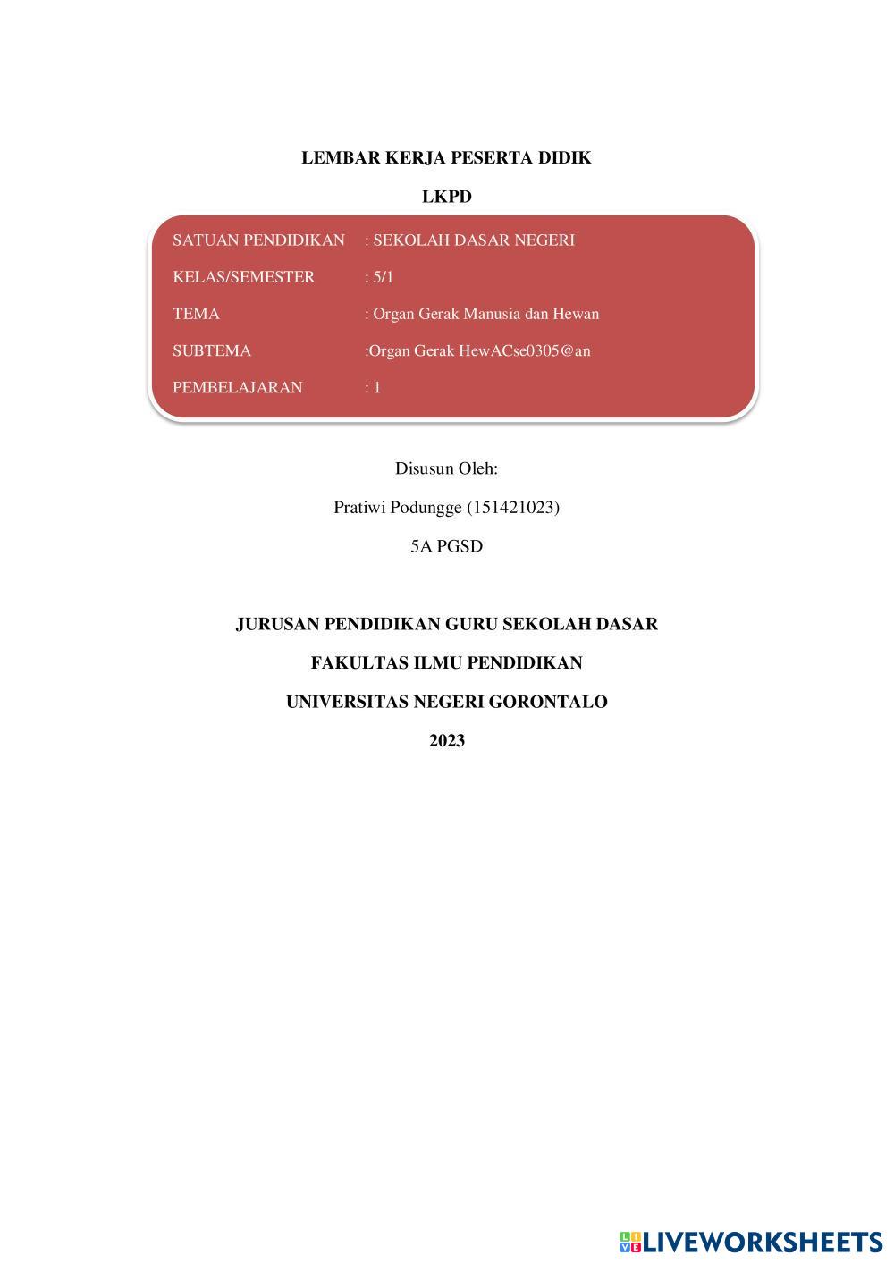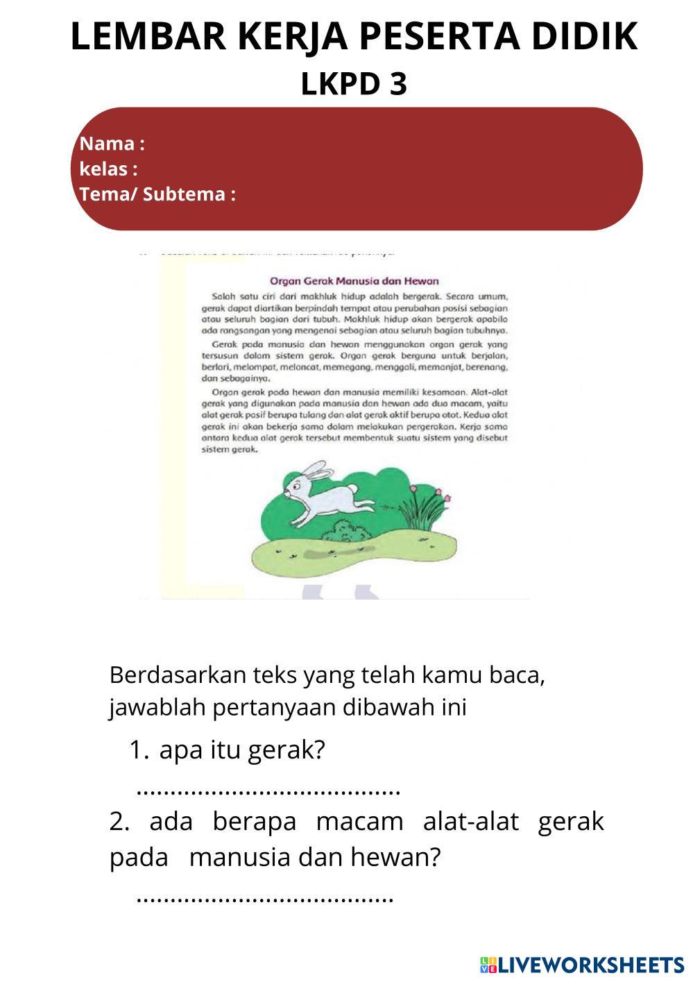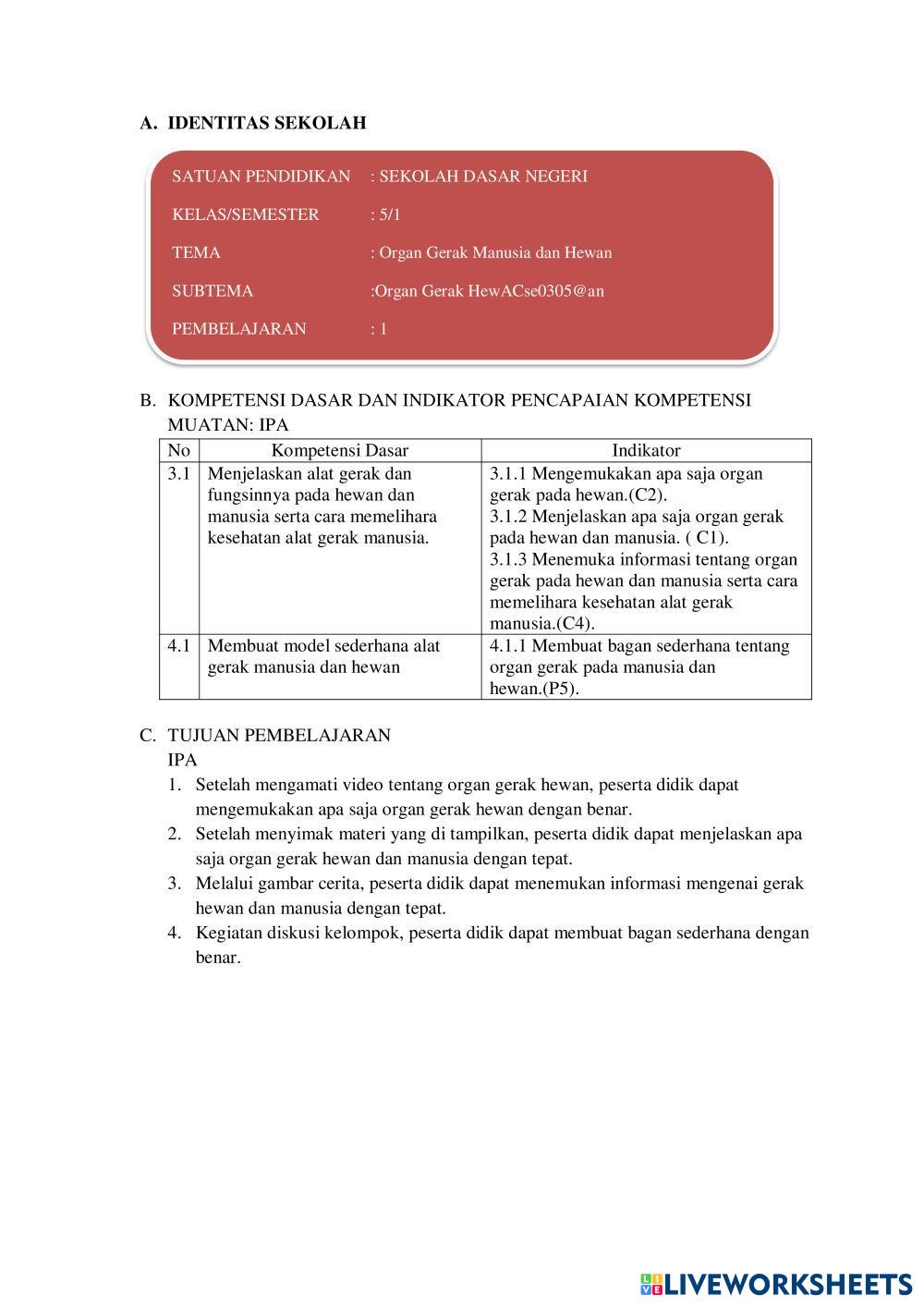 Created byPratiwi Podungge Ilmu Pengetahuan Alam (IPA) Organ Gerak Hewan dan Manusia Age 11-15 level: 5 Indonesian Author's Instructions My Google Classroom Courses × 0 classes selected (0 students total) Quick Access Select all classes (0 classes) All Classes Loading courses... Cancel Share Share to selected Course __COURSE_NAME__ __STUDENT_NAME__ (__STUDENT_EMAIL__) Organ gerak manusia dan hewan Download Worksheet Validation Check my answers Emails my answers to my teacher Full name Group/level School subject Teacher's email or key code Close Submit Validating worksheet... (12) Your answers have been sent to your teacher. Good luck! OK We encountered an error submitting your answers. Please try again. OK Advertisement | Go Ad Free Created byPratiwi Podungge Ilmu Pengetahuan Alam (IPA) Organ Gerak Hewan dan Manusia Age 11-15 level: 5 Indonesian Author's Instructions