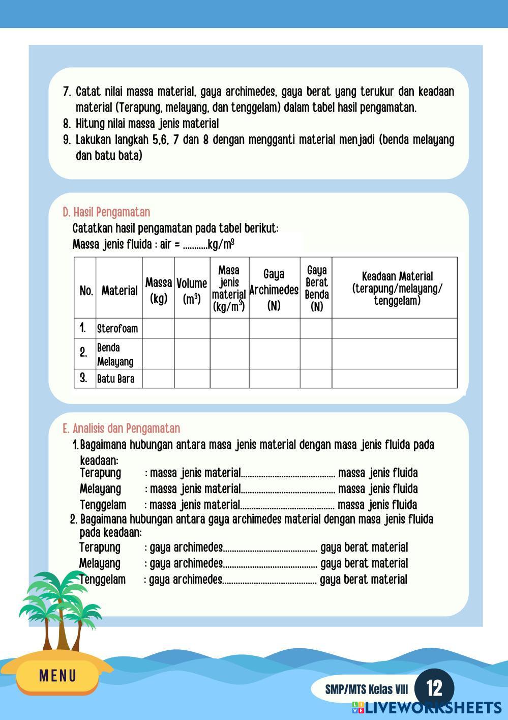 Created byIstighfarotul Mayang Putri Ilmu Pengetahuan Alam (IPA) Tekanan Zat Cair Age 10+ level: SMP/MTs Indonesian Author's Instructions My Google Classroom Courses × 0 classes selected (0 students total) Quick Access Select all classes (0 classes) All Classes Loading courses... Cancel Share Share to selected Course __COURSE_NAME__ __STUDENT_NAME__ (__STUDENT_EMAIL__) TEKANAN ZAT CAIR Download Worksheet Validation Check my answers Emails my answers to my teacher Full name Group/level School subject Teacher's email or key code Close Submit Validating worksheet... (12) Your answers have been sent to your teacher. Good luck! OK We encountered an error submitting your answers. Please try again. OK Advertisement | Go Ad Free Created byIstighfarotul Mayang Putri Ilmu Pengetahuan Alam (IPA) Tekanan Zat Cair Age 10+ level: SMP/MTs Indonesian Author's Instructions