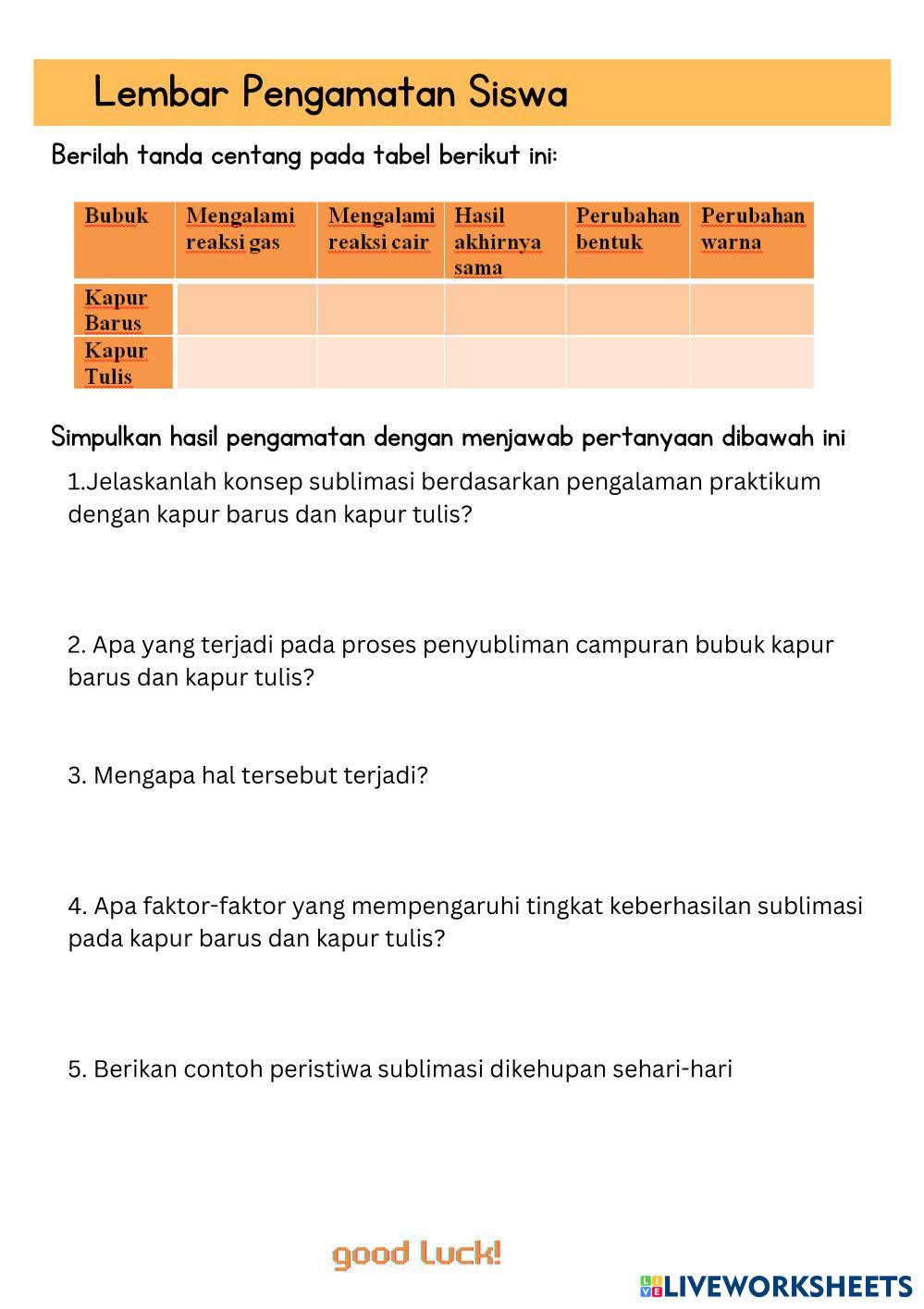 Created bySerent Resiana Hantari Ilmu Pengetahuan Alam (IPA) Pemisahan campuran Age 12-18 level: SMP KELAS 8 Indonesian Author's Instructions My Google Classroom Courses × 0 classes selected (0 students total) Quick Access Select all classes (0 classes) All Classes Loading courses... Cancel Share Share to selected Course __COURSE_NAME__ __STUDENT_NAME__ (__STUDENT_EMAIL__) LKPD SUBLIMASI Download Worksheet Validation Check my answers Emails my answers to my teacher Full name Group/level School subject Teacher's email or key code Close Submit Validating worksheet... (12) Your answers have been sent to your teacher. Good luck! OK We encountered an error submitting your answers. Please try again. OK Advertisement | Go Ad Free Created bySerent Resiana Hantari Ilmu Pengetahuan Alam (IPA) Pemisahan campuran Age 12-18 level: SMP KELAS 8 Indonesian Author's Instructions