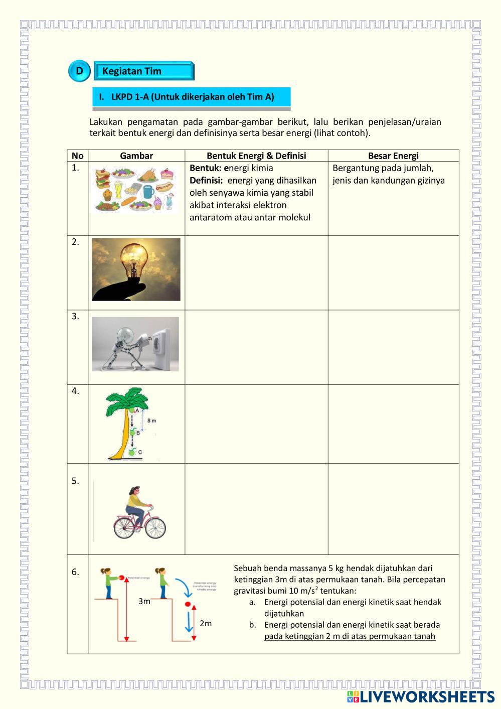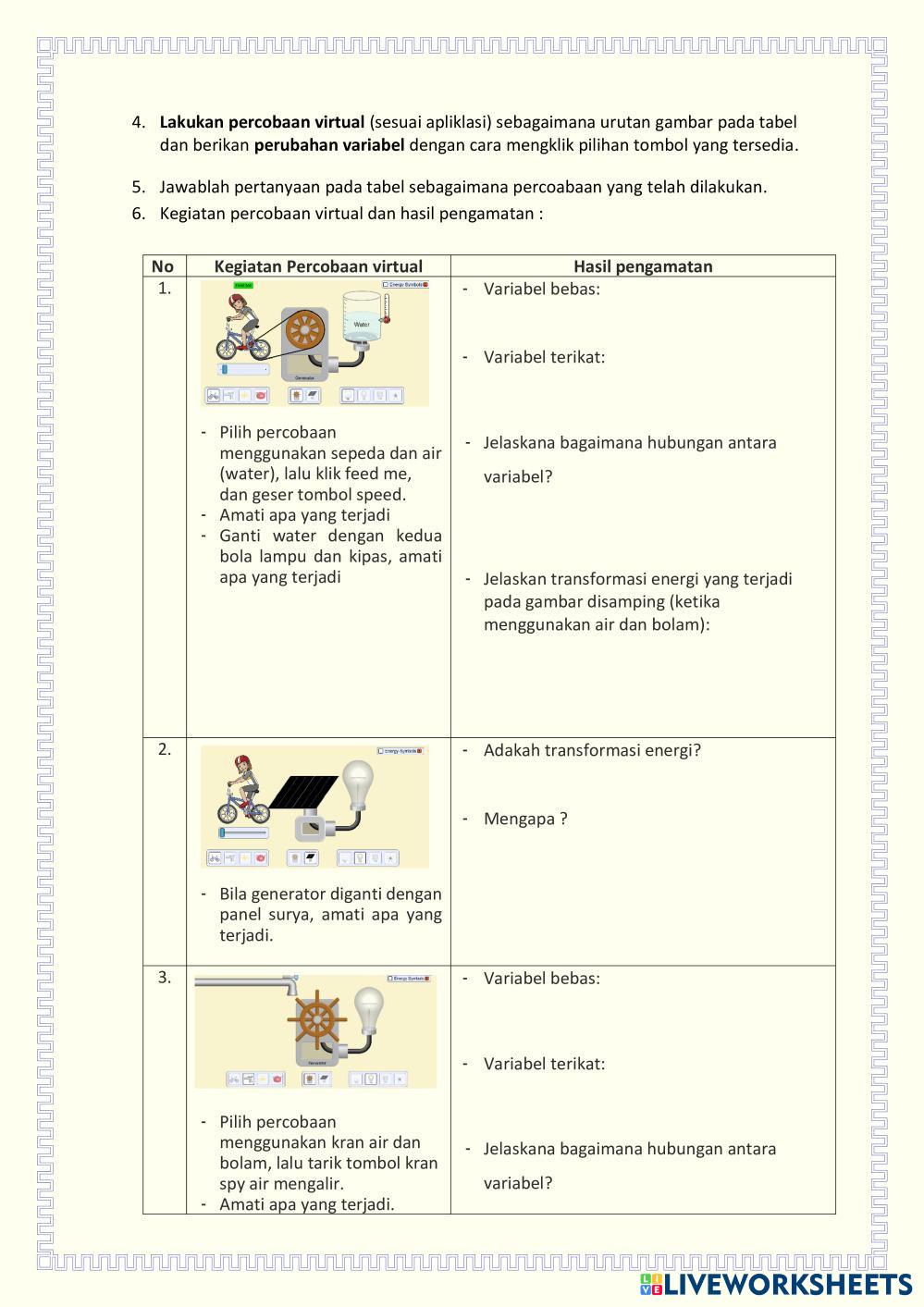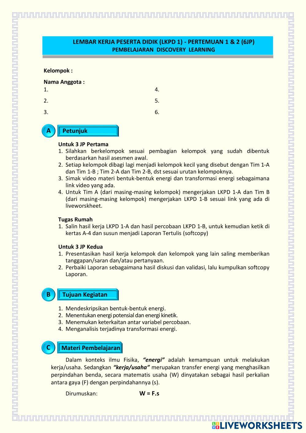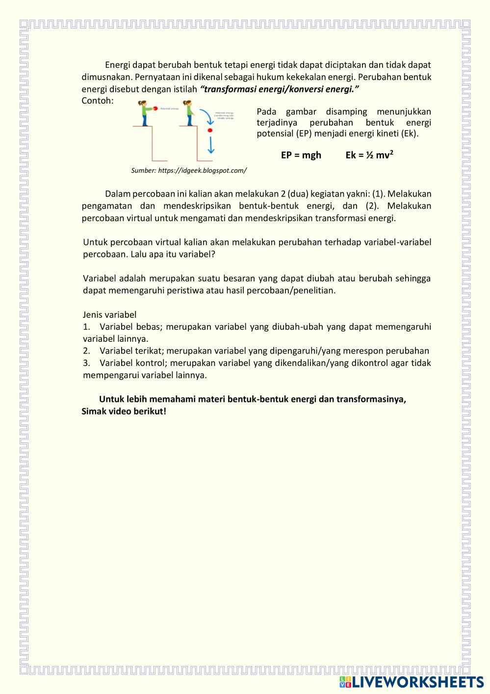 Created byWulyo Slamet Ilmu Pengetahuan Alam (IPA) Energi Alternatif Age 15+ level: 10 Indonesian Author's Instructions My Google Classroom Courses × 0 classes selected (0 students total) Quick Access Select all classes (0 classes) All Classes Loading courses... Cancel Share Share to selected Course __COURSE_NAME__ __STUDENT_NAME__ (__STUDENT_EMAIL__) LKPD-1 IPA-FISIKA "ENERGI ALTERNATIF" Download Worksheet Validation Check my answers Emails my answers to my teacher Full name Group/level School subject Teacher's email or key code Close Submit Validating worksheet... (12) Your answers have been sent to your teacher. Good luck! OK We encountered an error submitting your answers. Please try again. OK Advertisement | Go Ad Free Created byWulyo Slamet Ilmu Pengetahuan Alam (IPA) Energi Alternatif Age 15+ level: 10 Indonesian Author's Instructions