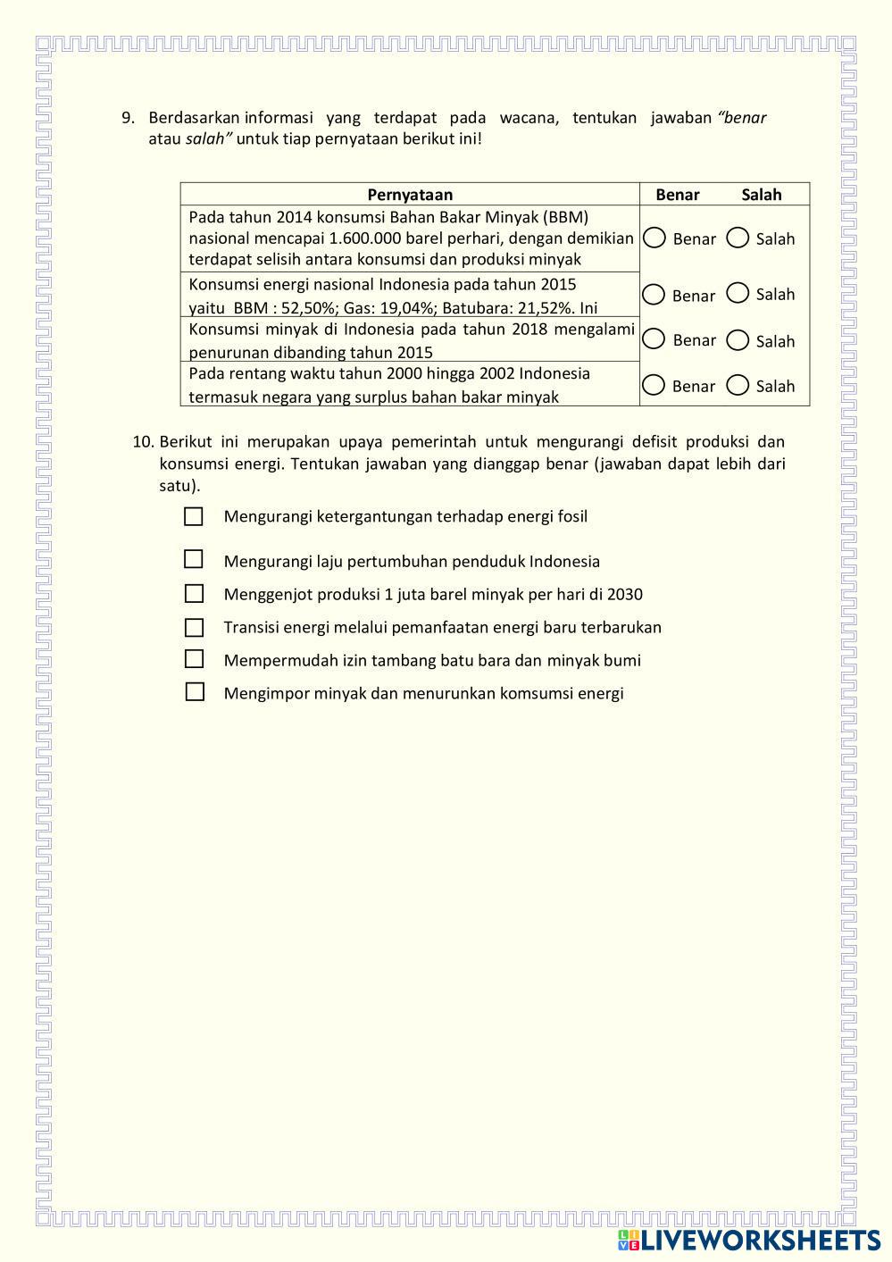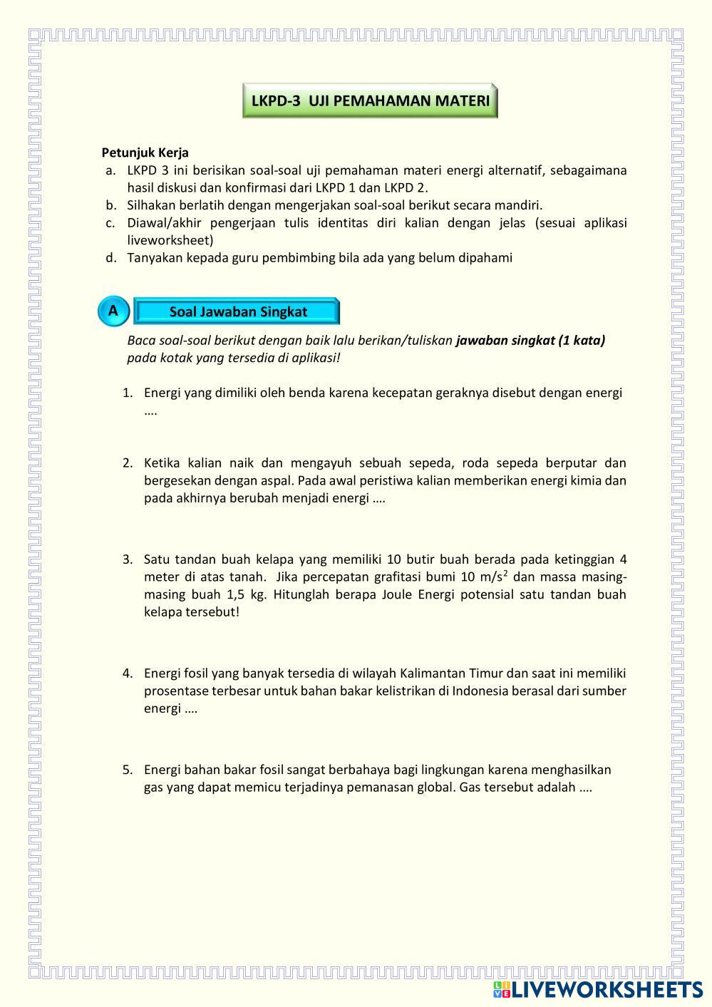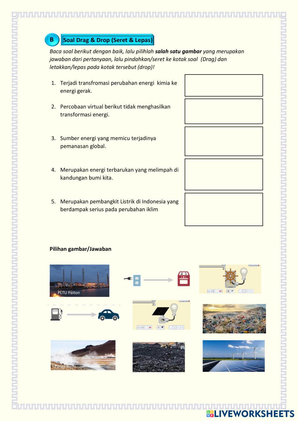 Created byWulyo Slamet Ilmu Pengetahuan Alam (IPA) Energi Alternatif Age 15+ level: 10 Indonesian Author's Instructions My Google Classroom Courses × 0 classes selected (0 students total) Quick Access Select all classes (0 classes) All Classes Loading courses... Cancel Share Share to selected Course __COURSE_NAME__ __STUDENT_NAME__ (__STUDENT_EMAIL__) LKPD-3 UJI PEMAHAMAN MATERI ENERGI ALTERNATIF Download Worksheet Validation Check my answers Emails my answers to my teacher Full name Group/level School subject Teacher's email or key code Close Submit Validating worksheet... (12) Your answers have been sent to your teacher. Good luck! OK We encountered an error submitting your answers. Please try again. OK Advertisement | Go Ad Free Created byWulyo Slamet Ilmu Pengetahuan Alam (IPA) Energi Alternatif Age 15+ level: 10 Indonesian Author's Instructions