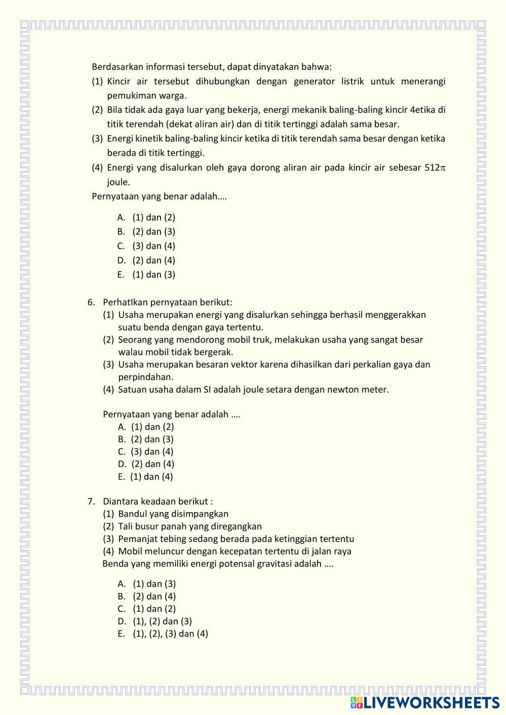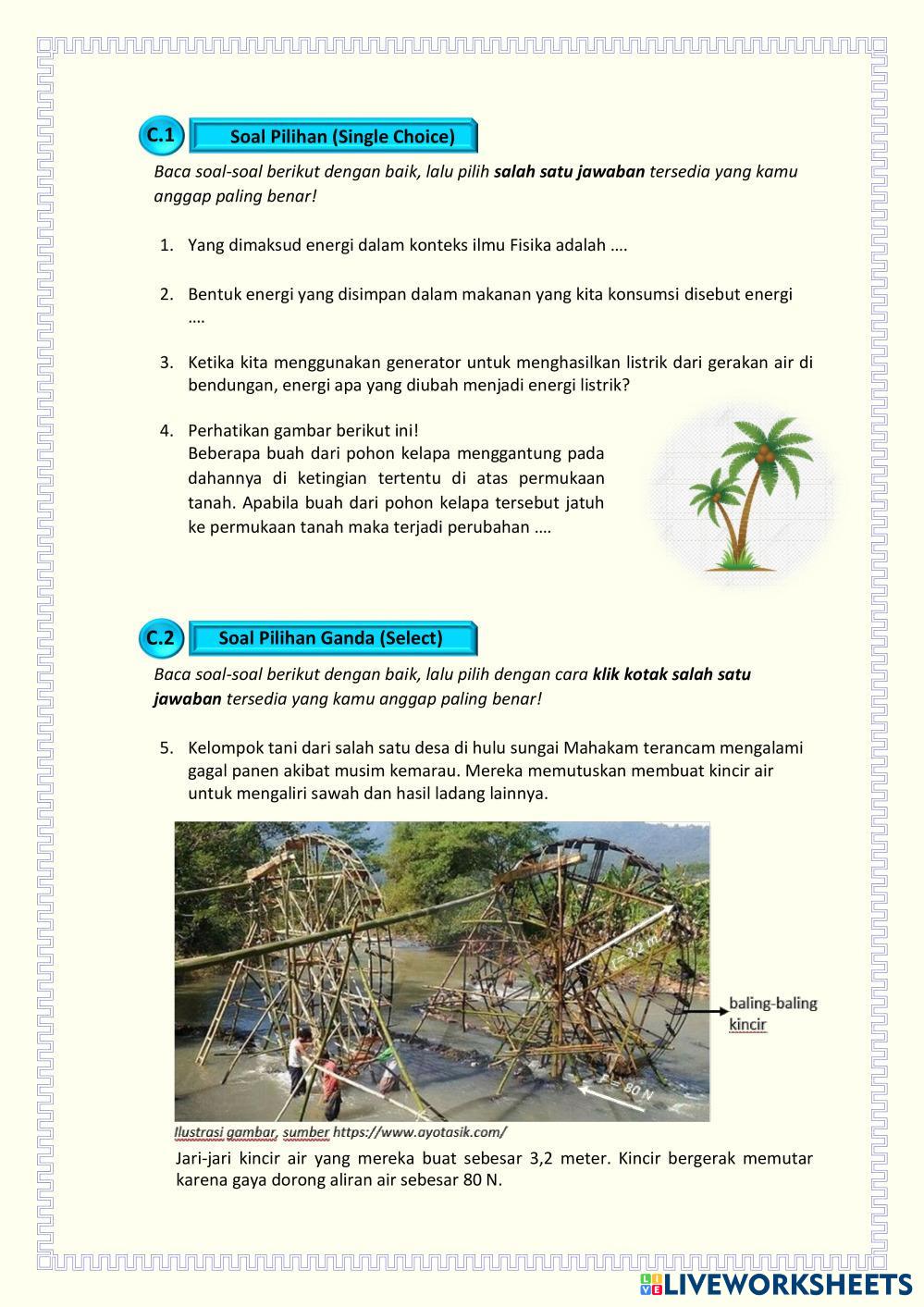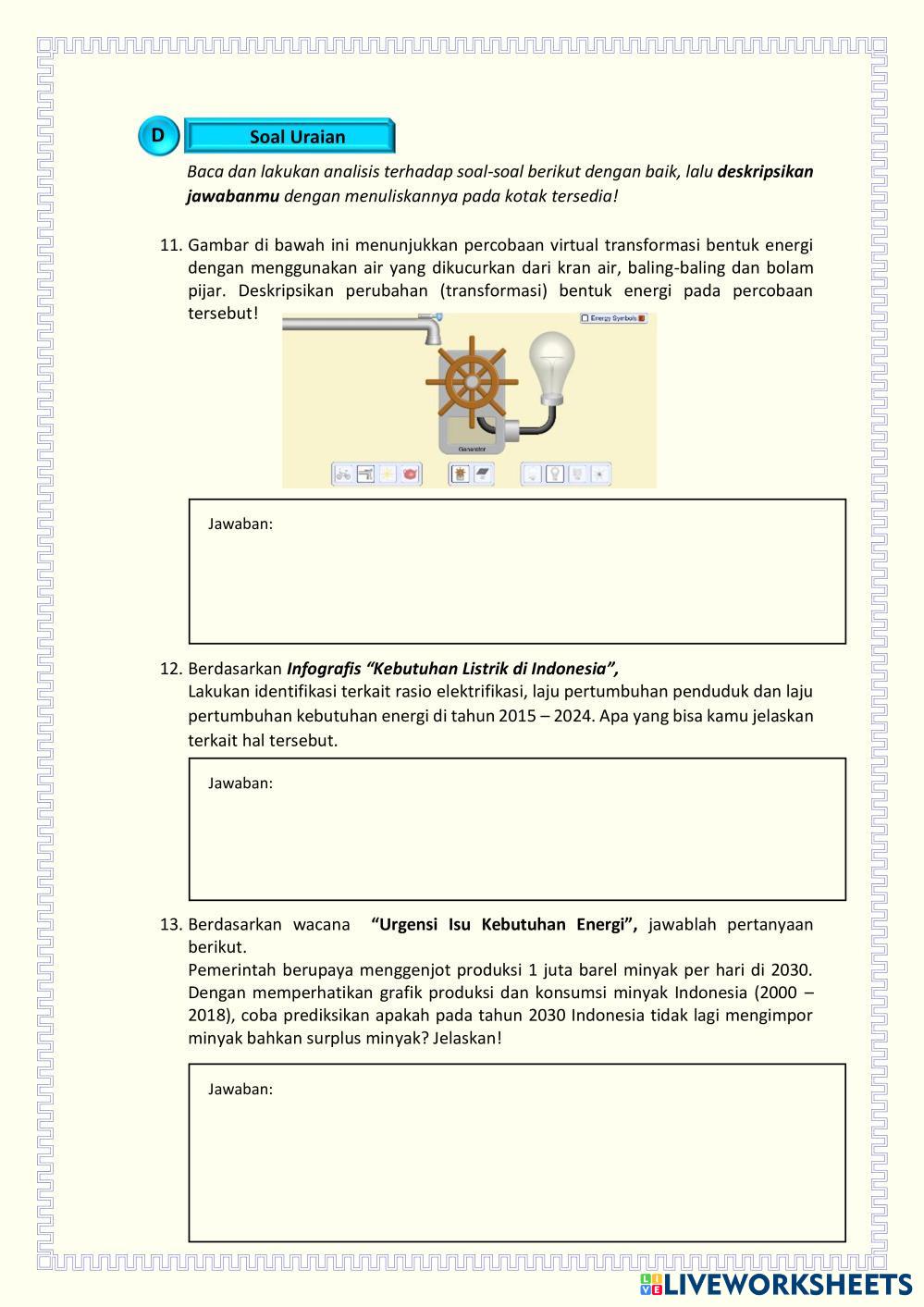 Created byWulyo Slamet Ilmu Pengetahuan Alam (IPA) Energi Alternatif Age 15+ level: 10 Indonesian Author's Instructions My Google Classroom Courses × 0 classes selected (0 students total) Quick Access Select all classes (0 classes) All Classes Loading courses... Cancel Share Share to selected Course __COURSE_NAME__ __STUDENT_NAME__ (__STUDENT_EMAIL__) LKPD-3 UJI PEMAHAMAN MATERI ENERGI ALTERNATIF Download Worksheet Validation Check my answers Emails my answers to my teacher Full name Group/level School subject Teacher's email or key code Close Submit Validating worksheet... (12) Your answers have been sent to your teacher. Good luck! OK We encountered an error submitting your answers. Please try again. OK Advertisement | Go Ad Free Created byWulyo Slamet Ilmu Pengetahuan Alam (IPA) Energi Alternatif Age 15+ level: 10 Indonesian Author's Instructions