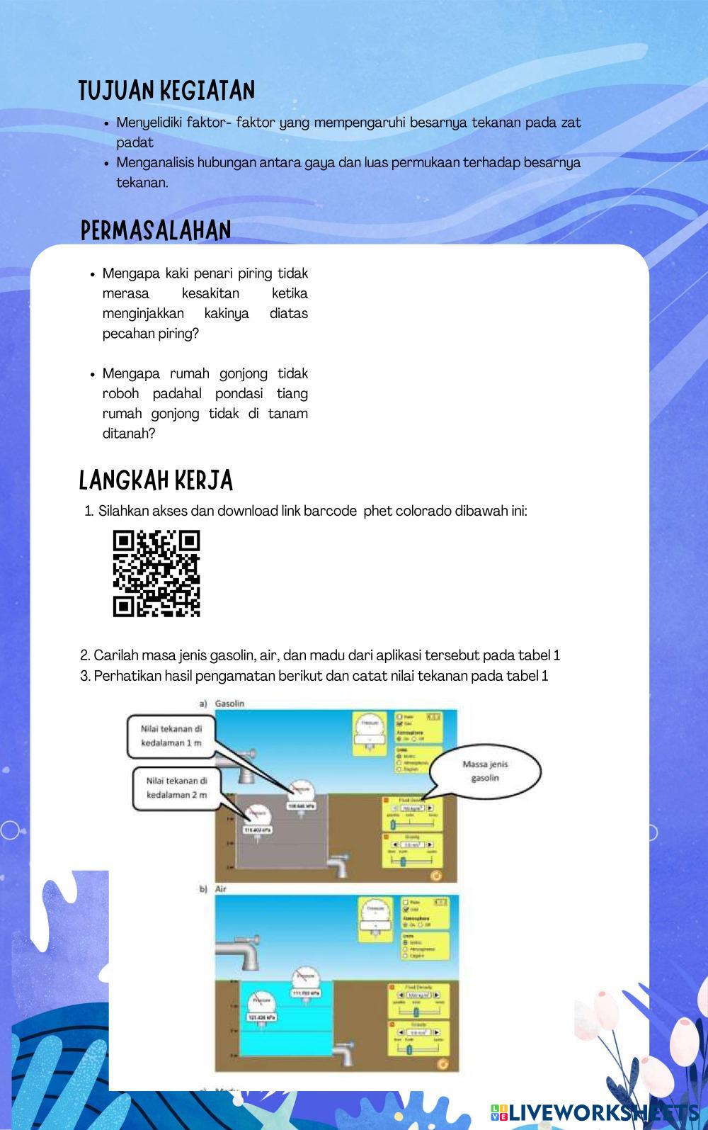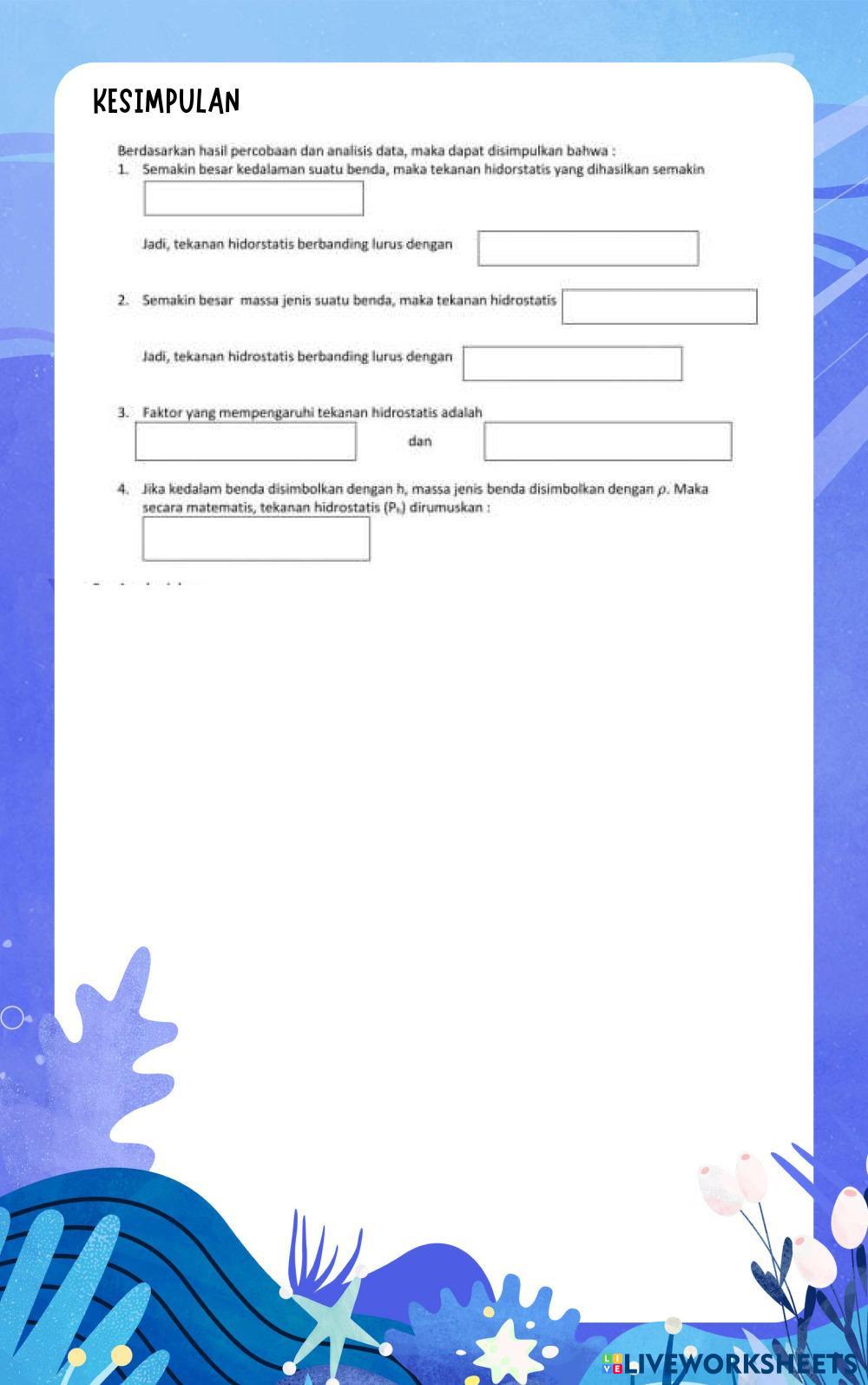Created byUmmi Rosyida Ilmu Pengetahuan Alam (IPA) Tekanan Hidrostatis Age 14+ level: 1 Indonesian Author's Instructions My Google Classroom Courses × 0 classes selected (0 students total) Quick Access Select all classes (0 classes) All Classes Loading courses... Cancel Share Share to selected Course __COURSE_NAME__ __STUDENT_NAME__ (__STUDENT_EMAIL__) Tekanan Hidrostatis Download Worksheet Validation Check my answers Emails my answers to my teacher Full name Group/level School subject Teacher's email or key code Close Submit Validating worksheet... (12) Your answers have been sent to your teacher. Good luck! OK We encountered an error submitting your answers. Please try again. OK Advertisement | Go Ad Free Created byUmmi Rosyida Ilmu Pengetahuan Alam (IPA) Tekanan Hidrostatis Age 14+ level: 1 Indonesian Author's Instructions
