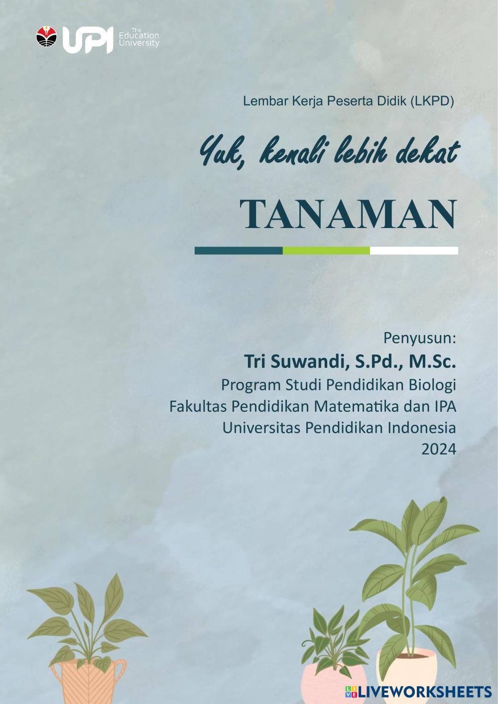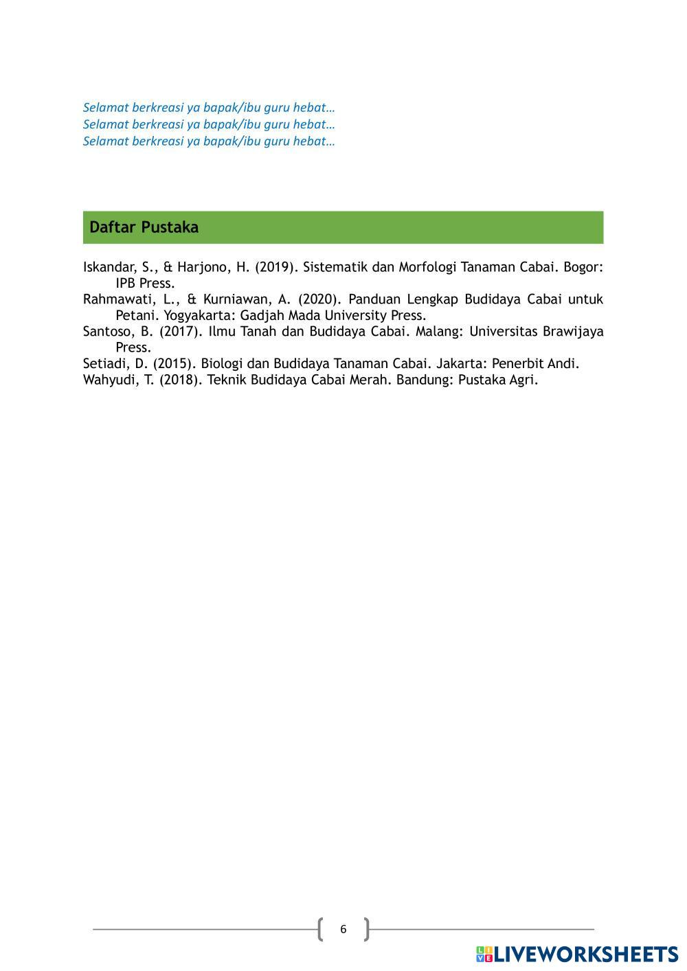 Created byRUIJAH, S.Pd.I Ilmu Pengetahuan Alam (IPA) Budidaya Tanaman Age 12-18 level: 9 Indonesian Author's Instructions LKPD tentang budidaya tanaman cabai My Google Classroom Courses × 0 classes selected (0 students total) Quick Access Select all classes (0 classes) All Classes Loading courses... Cancel Share Share to selected Course __COURSE_NAME__ __STUDENT_NAME__ (__STUDENT_EMAIL__) Kenali Tanaman Cabai Download Worksheet Validation Check my answers Emails my answers to my teacher Full name Group/level School subject Teacher's email or key code Close Submit Validating worksheet... (12) Your answers have been sent to your teacher. Good luck! OK We encountered an error submitting your answers. Please try again. OK Advertisement | Go Ad Free Created byRUIJAH, S.Pd.I Ilmu Pengetahuan Alam (IPA) Budidaya Tanaman Age 12-18 level: 9 Indonesian Author's Instructions LKPD tentang budidaya tanaman cabai