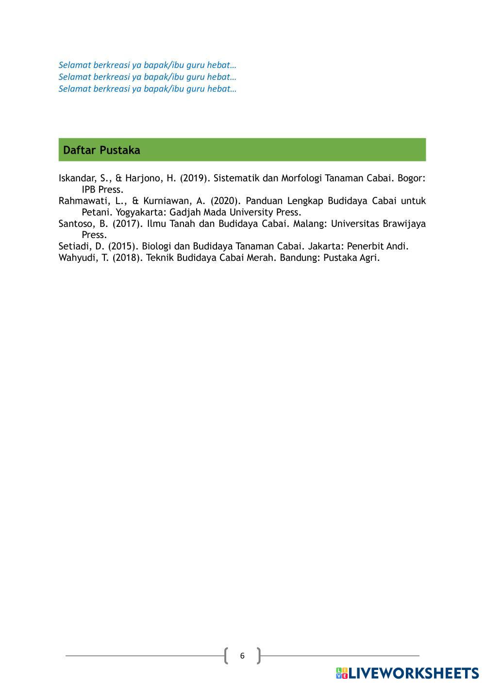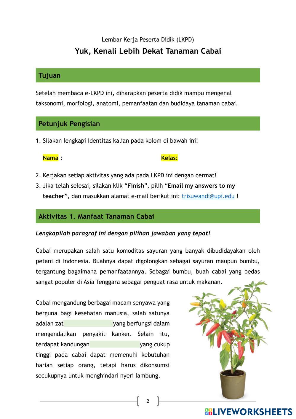 Created byKarlina Ilmu Pengetahuan Alam (IPA) Budidaya Tanaman Age 3+ level: X Indonesian Author's Instructions Siswa My Google Classroom Courses × 0 classes selected (0 students total) Quick Access Select all classes (0 classes) All Classes Loading courses... Cancel Share Share to selected Course __COURSE_NAME__ __STUDENT_NAME__ (__STUDENT_EMAIL__) LKPD TANAMAN CABAI Download Worksheet Validation Check my answers Emails my answers to my teacher Full name Group/level School subject Teacher's email or key code Close Submit Validating worksheet... (12) Your answers have been sent to your teacher. Good luck! OK We encountered an error submitting your answers. Please try again. OK Advertisement | Go Ad Free Created byKarlina Ilmu Pengetahuan Alam (IPA) Budidaya Tanaman Age 3+ level: X Indonesian Author's Instructions Siswa