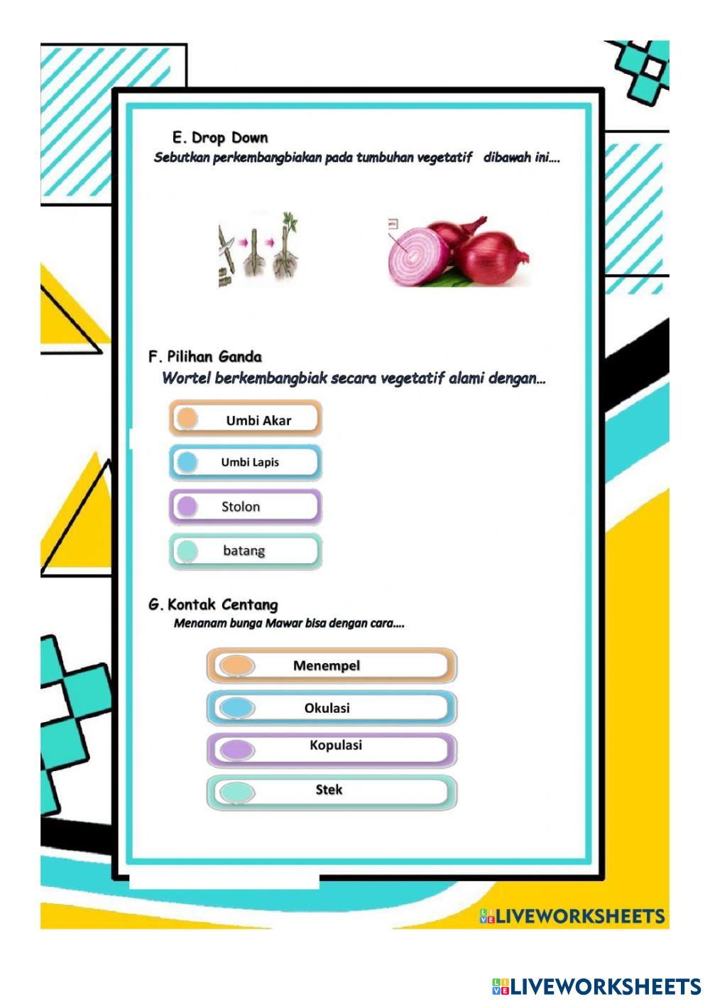 Perkembangbiakan Vegetati adalah perkembangbiakan yang melibatkan satu induk saja atau perkembangbiakan tanpa kawin