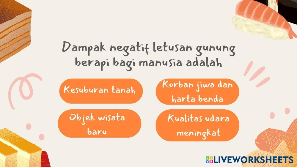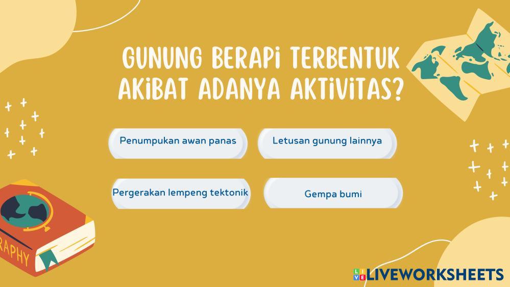 Created by ririanadew Ilmu Pengetahuan Alam (IPA) pretest gunung berapi Age 3+ level: 8 Indonesian Author's Instructions My Google Classroom Courses × 0 classes selected (0 students total) Quick Access Select all classes (0 classes) All Classes Loading courses... Cancel Share Share to selected Course __COURSE_NAME__ __STUDENT_NAME__ (__STUDENT_EMAIL__) Pretest Download Worksheet Validation Check my answers Emails my answers to my teacher Full name Group/level School subject Teacher's email or key code Close Submit Validating worksheet... (12) Your answers have been sent to your teacher. Good luck! OK We encountered an error submitting your answers. Please try again. OK Advertisement | Go Ad Free Created by ririanadew Ilmu Pengetahuan Alam (IPA) pretest gunung berapi Age 3+ level: 8 Indonesian Author's Instructions