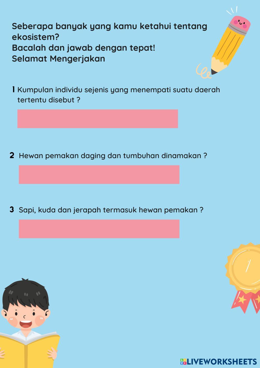 Created byPutri Wardani Ilmu Pengetahuan Alam (IPA) Komponen ekosistem Age 11-15 level: 5 Indonesian Author's Instructions KOMPONEN EKOSISTEM My Google Classroom Courses × 0 classes selected (0 students total) Quick Access Select all classes (0 classes) All Classes Loading courses... Cancel Share Share to selected Course __COURSE_NAME__ __STUDENT_NAME__ (__STUDENT_EMAIL__) ILMU PENGETAHUAN ALAM Download Worksheet Validation Check my answers Emails my answers to my teacher Full name Group/level School subject Teacher's email or key code Close Submit Validating worksheet... (12) Your answers have been sent to your teacher. Good luck! OK We encountered an error submitting your answers. Please try again. OK Advertisement | Go Ad Free Created byPutri Wardani Ilmu Pengetahuan Alam (IPA) Komponen ekosistem Age 11-15 level: 5 Indonesian Author's Instructions KOMPONEN EKOSISTEM