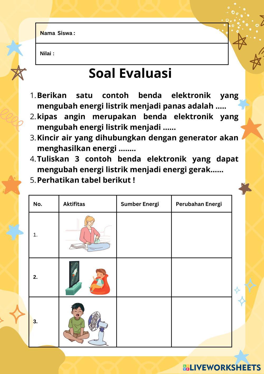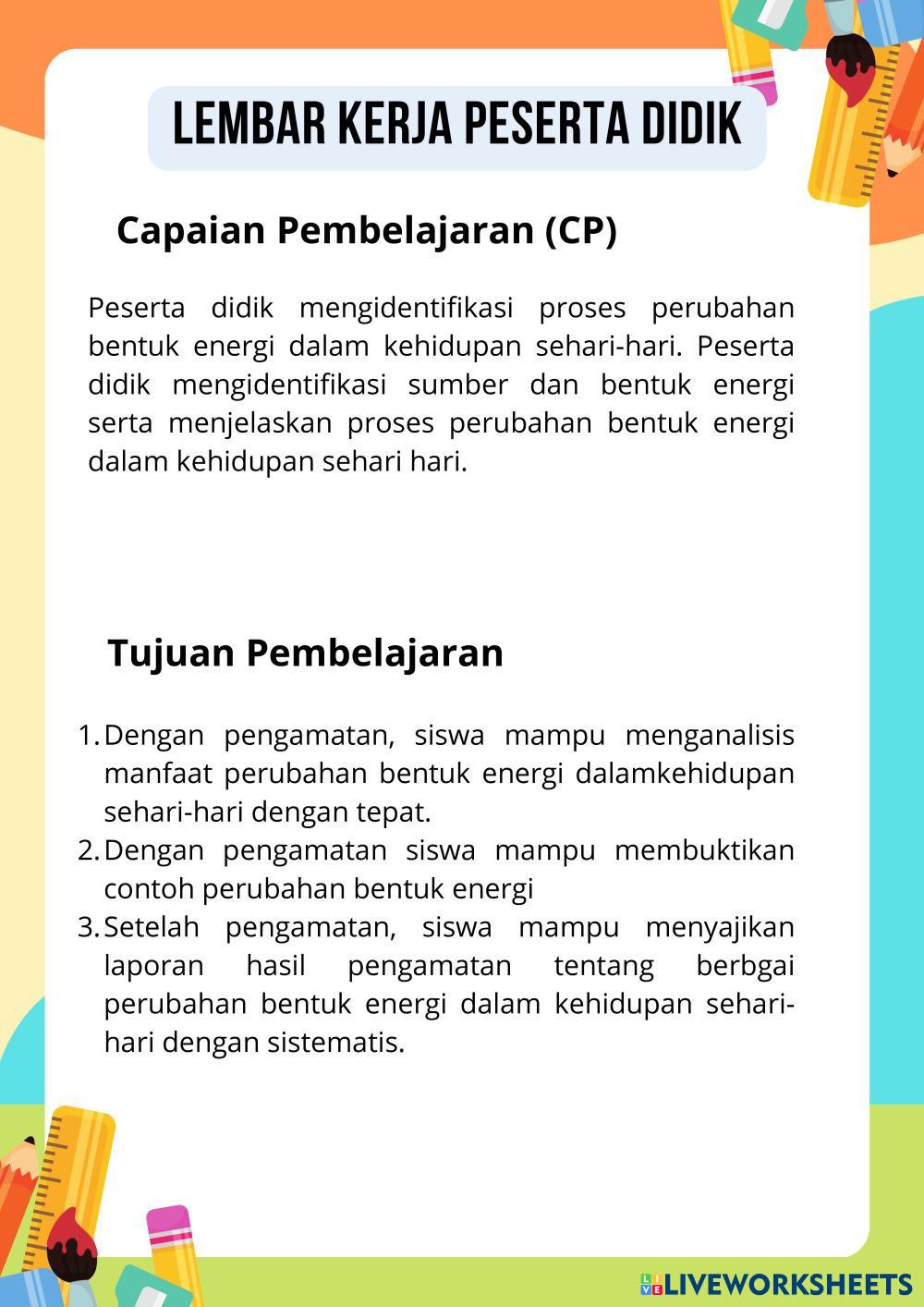 Created byKetut Arini Ilmu Pengetahuan Alam (IPA) Perubahan energi Age 9-15 level: 4 Indonesian Author's Instructions My Google Classroom Courses × 0 classes selected (0 students total) Quick Access Select all classes (0 classes) All Classes Loading courses... Cancel Share Share to selected Course __COURSE_NAME__ __STUDENT_NAME__ (__STUDENT_EMAIL__) LKPD Perubahan Energi Download Worksheet Validation Check my answers Emails my answers to my teacher Full name Group/level School subject Teacher's email or key code Close Submit Validating worksheet... (12) Your answers have been sent to your teacher. Good luck! OK We encountered an error submitting your answers. Please try again. OK Advertisement | Go Ad Free Created byKetut Arini Ilmu Pengetahuan Alam (IPA) Perubahan energi Age 9-15 level: 4 Indonesian Author's Instructions