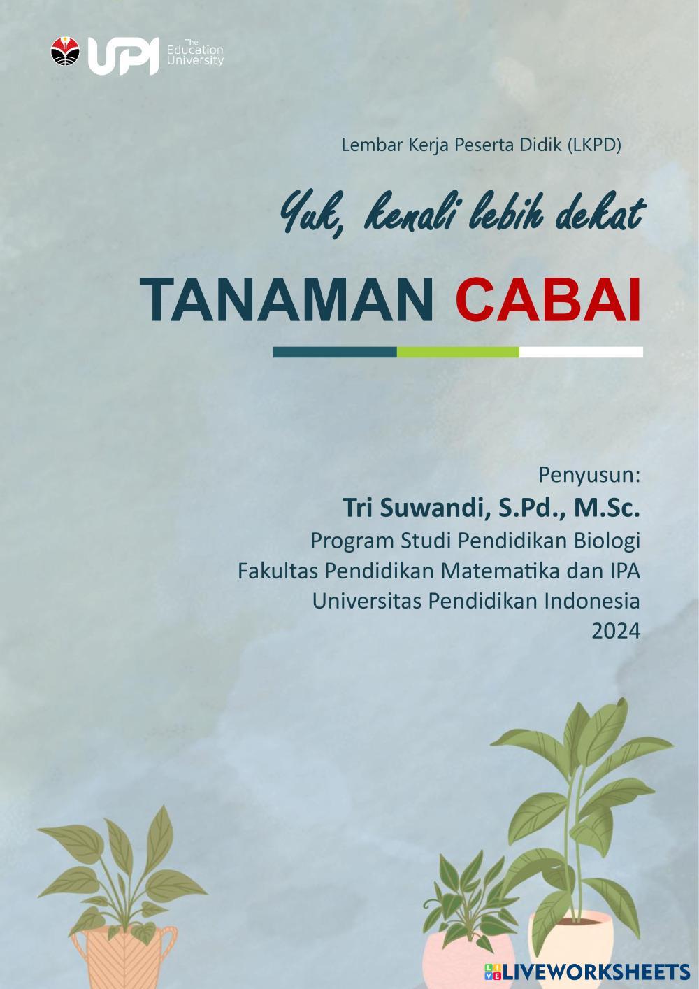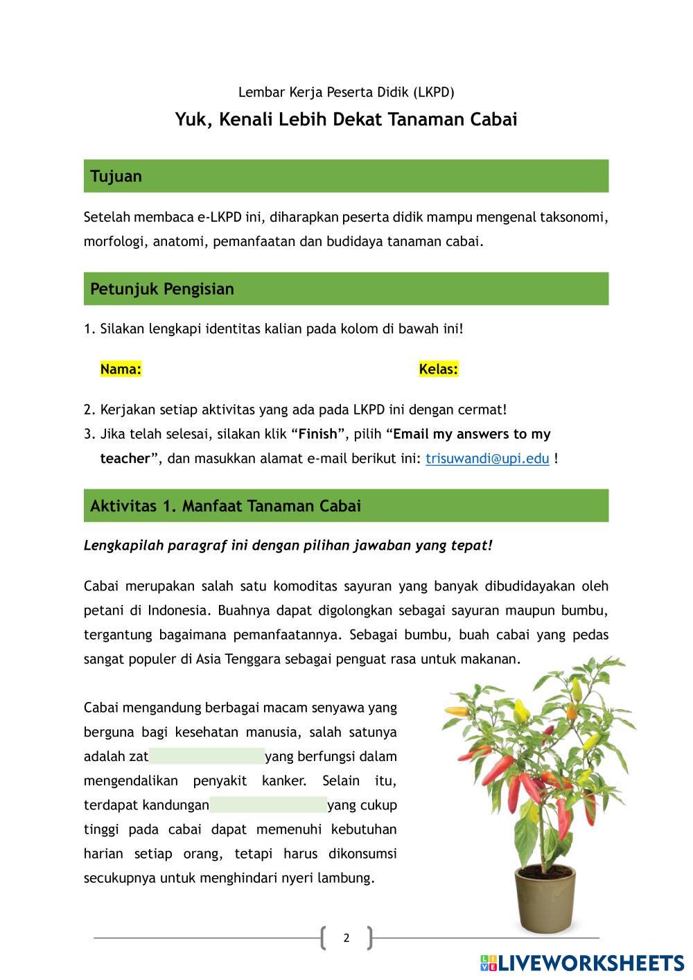 Created by40013 H. Baihakki, S.Pd, M.M Ilmu Pengetahuan Alam (IPA) Cara Merawat Tanaman dan Manfaat Budi Daya Age 12-15 level: 8 Indonesian Author's Instructions cara tanam cabai yang baik My Google Classroom Courses × 0 classes selected (0 students total) Quick Access Select all classes (0 classes) All Classes Loading courses... Cancel Share Share to selected Course __COURSE_NAME__ __STUDENT_NAME__ (__STUDENT_EMAIL__) tanaman cabai Download Worksheet Validation Check my answers Emails my answers to my teacher Full name Group/level School subject Teacher's email or key code Close Submit Validating worksheet... (12) Your answers have been sent to your teacher. Good luck! OK We encountered an error submitting your answers. Please try again. OK Advertisement | Go Ad Free Created by40013 H. Baihakki, S.Pd, M.M Ilmu Pengetahuan Alam (IPA) Cara Merawat Tanaman dan Manfaat Budi Daya Age 12-15 level: 8 Indonesian Author's Instructions cara tanam cabai yang baik