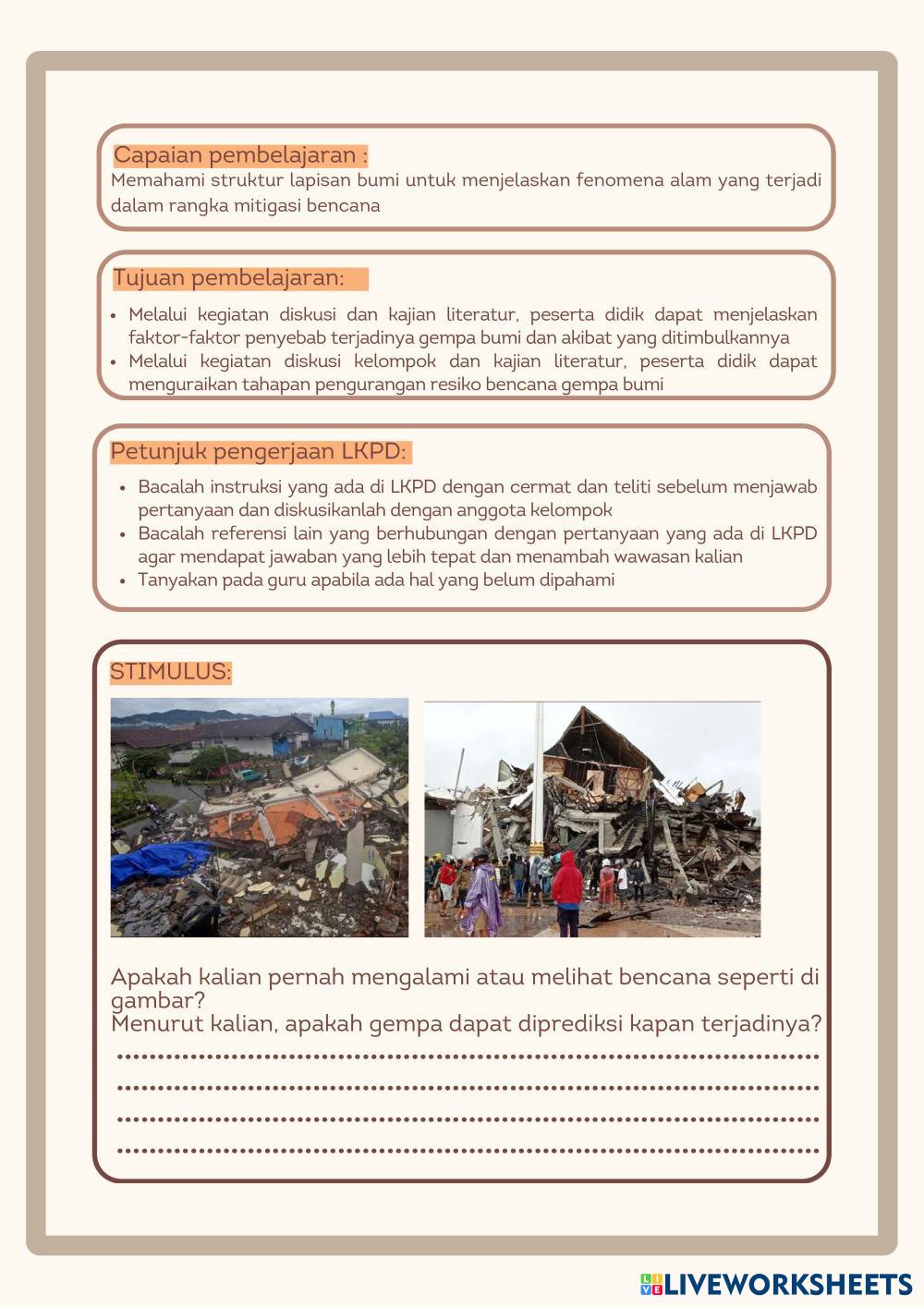Created bysusi lestari Ilmu Pengetahuan Alam (IPA) Gempa bumi Age 13-18 level: 8 Indonesian Author's Instructions My Google Classroom Courses × 0 classes selected (0 students total) Quick Access Select all classes (0 classes) All Classes Loading courses... Cancel Share Share to selected Course __COURSE_NAME__ __STUDENT_NAME__ (__STUDENT_EMAIL__) LKPD Gempa Bumi Download Worksheet Validation Check my answers Emails my answers to my teacher Full name Group/level School subject Teacher's email or key code Close Submit Validating worksheet... (12) Your answers have been sent to your teacher. Good luck! OK We encountered an error submitting your answers. Please try again. OK Advertisement | Go Ad Free Created bysusi lestari Ilmu Pengetahuan Alam (IPA) Gempa bumi Age 13-18 level: 8 Indonesian Author's Instructions