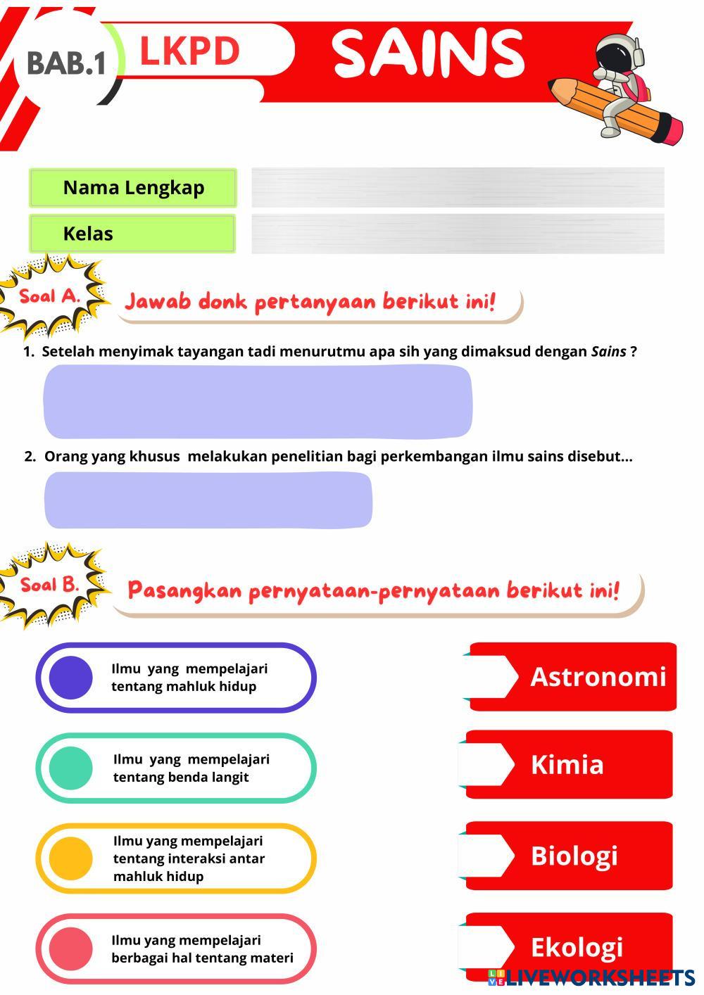 Created byDian Haris Sutrisno Ilmu Pengetahuan Alam (IPA) Hakikat Ilmu Sains & Metode Ilmiah Age 12-17 level: 7 Indonesian Author's Instructions Sains My Google Classroom Courses × 0 classes selected (0 students total) Quick Access Select all classes (0 classes) All Classes Loading courses... Cancel Share Share to selected Course __COURSE_NAME__ __STUDENT_NAME__ (__STUDENT_EMAIL__) LKPD. IPA (Hakikat Sains) Download Worksheet Validation Check my answers Emails my answers to my teacher Full name Group/level School subject Teacher's email or key code Close Submit Validating worksheet... (12) Your answers have been sent to your teacher. Good luck! OK We encountered an error submitting your answers. Please try again. OK Advertisement | Go Ad Free Created byDian Haris Sutrisno Ilmu Pengetahuan Alam (IPA) Hakikat Ilmu Sains & Metode Ilmiah Age 12-17 level: 7 Indonesian Author's Instructions Sains