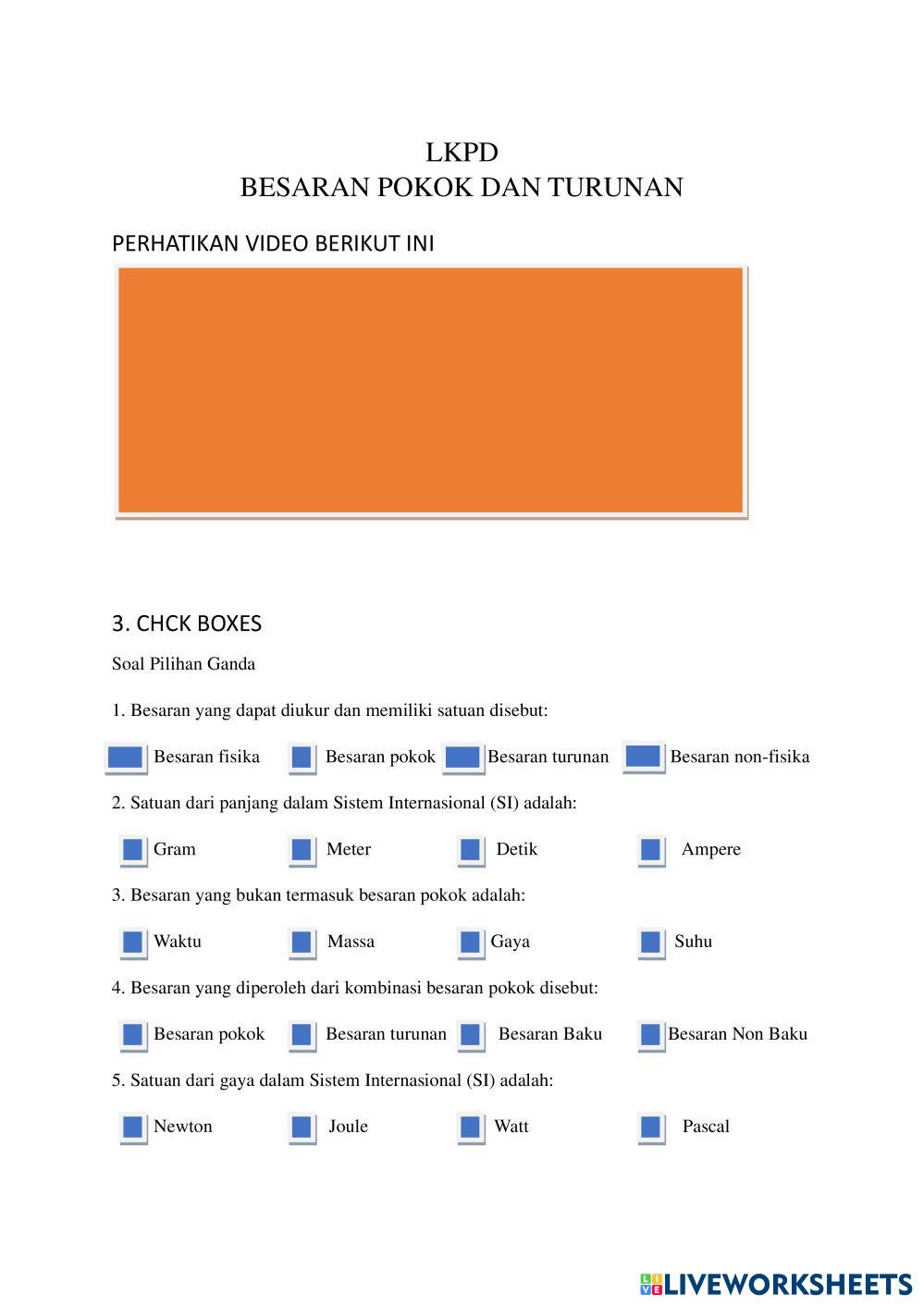 Created bySLAMET KRUI Ilmu Pengetahuan Alam (IPA) Besaran dan satuan Age 14-18 level: 7 Indonesian Author's Instructions My Google Classroom Courses × 0 classes selected (0 students total) Quick Access Select all classes (0 classes) All Classes Loading courses... Cancel Share Share to selected Course __COURSE_NAME__ __STUDENT_NAME__ (__STUDENT_EMAIL__) LKPD BESARAN DAN SATUAN Download Worksheet Validation Check my answers Emails my answers to my teacher Full name Group/level School subject Teacher's email or key code Close Submit Validating worksheet... (12) Your answers have been sent to your teacher. Good luck! OK We encountered an error submitting your answers. Please try again. OK Advertisement | Go Ad Free Created bySLAMET KRUI Ilmu Pengetahuan Alam (IPA) Besaran dan satuan Age 14-18 level: 7 Indonesian Author's Instructions