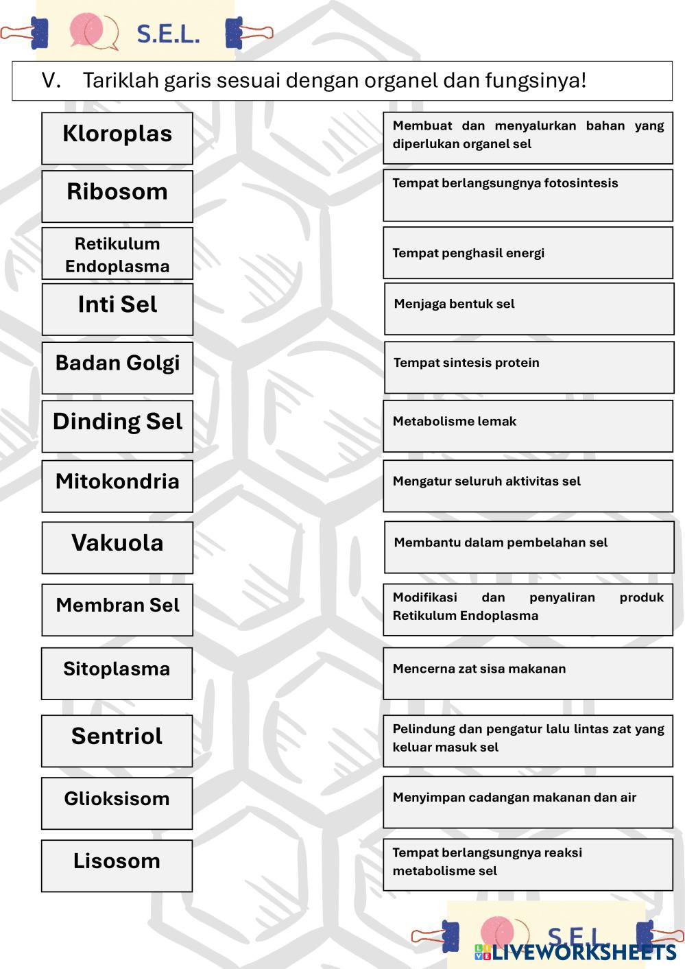 Created byMaissy Ilmu Pengetahuan Alam (IPA) Sel hewan dan sel tumbuhan Age 12-18 level: 8 Indonesian Author's Instructions Sel Hewan dan Sel Tumbuhan My Google Classroom Courses × 0 classes selected (0 students total) Quick Access Select all classes (0 classes) All Classes Loading courses... Cancel Share Share to selected Course __COURSE_NAME__ __STUDENT_NAME__ (__STUDENT_EMAIL__) LKPD SEL HEWAN DAN SEL TUMBUHAN Download Worksheet Validation Check my answers Emails my answers to my teacher Full name Group/level School subject Teacher's email or key code Close Submit Validating worksheet... (12) Your answers have been sent to your teacher. Good luck! OK We encountered an error submitting your answers. Please try again. OK Advertisement | Go Ad Free Created byMaissy Ilmu Pengetahuan Alam (IPA) Sel hewan dan sel tumbuhan Age 12-18 level: 8 Indonesian Author's Instructions Sel Hewan dan Sel Tumbuhan