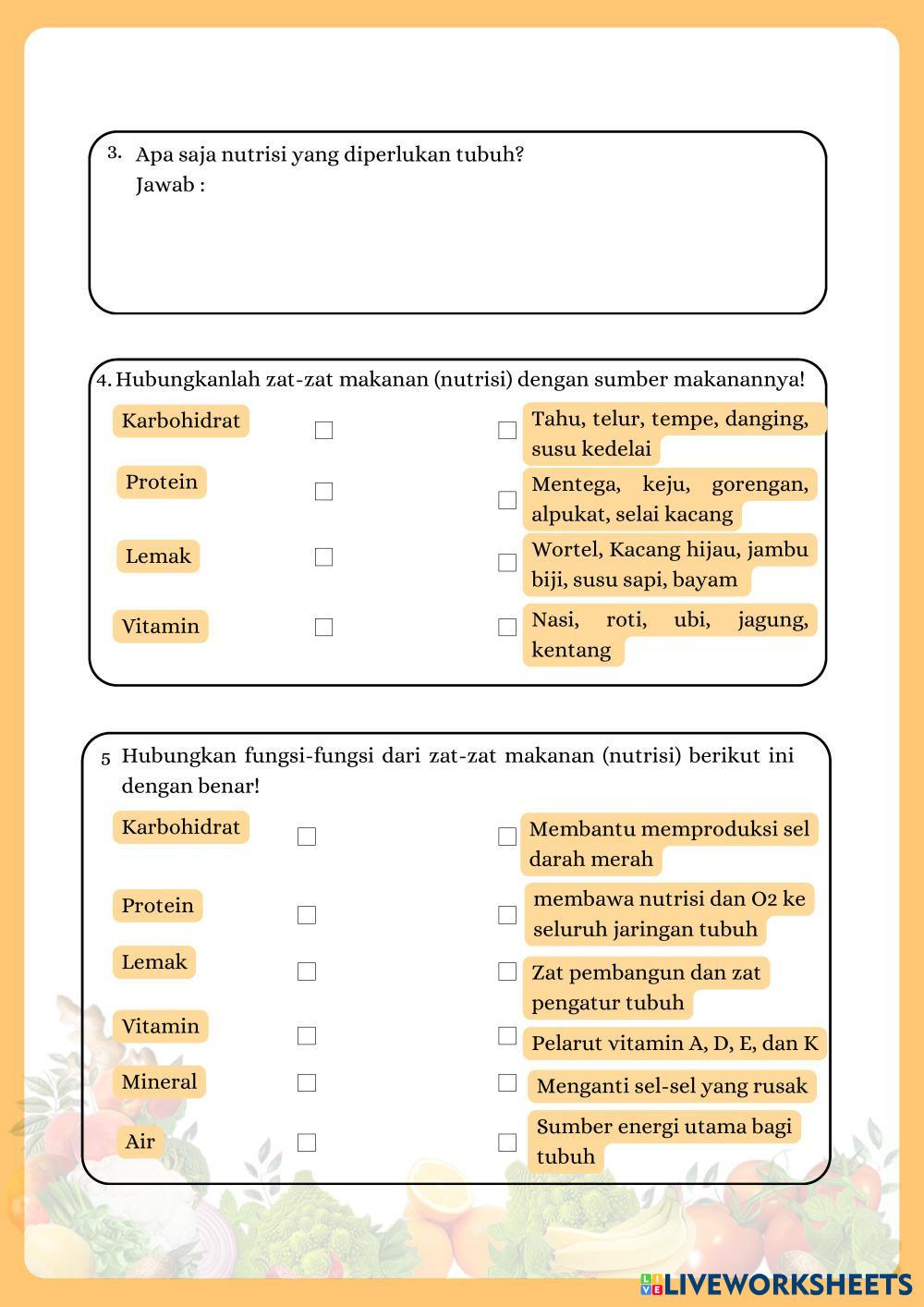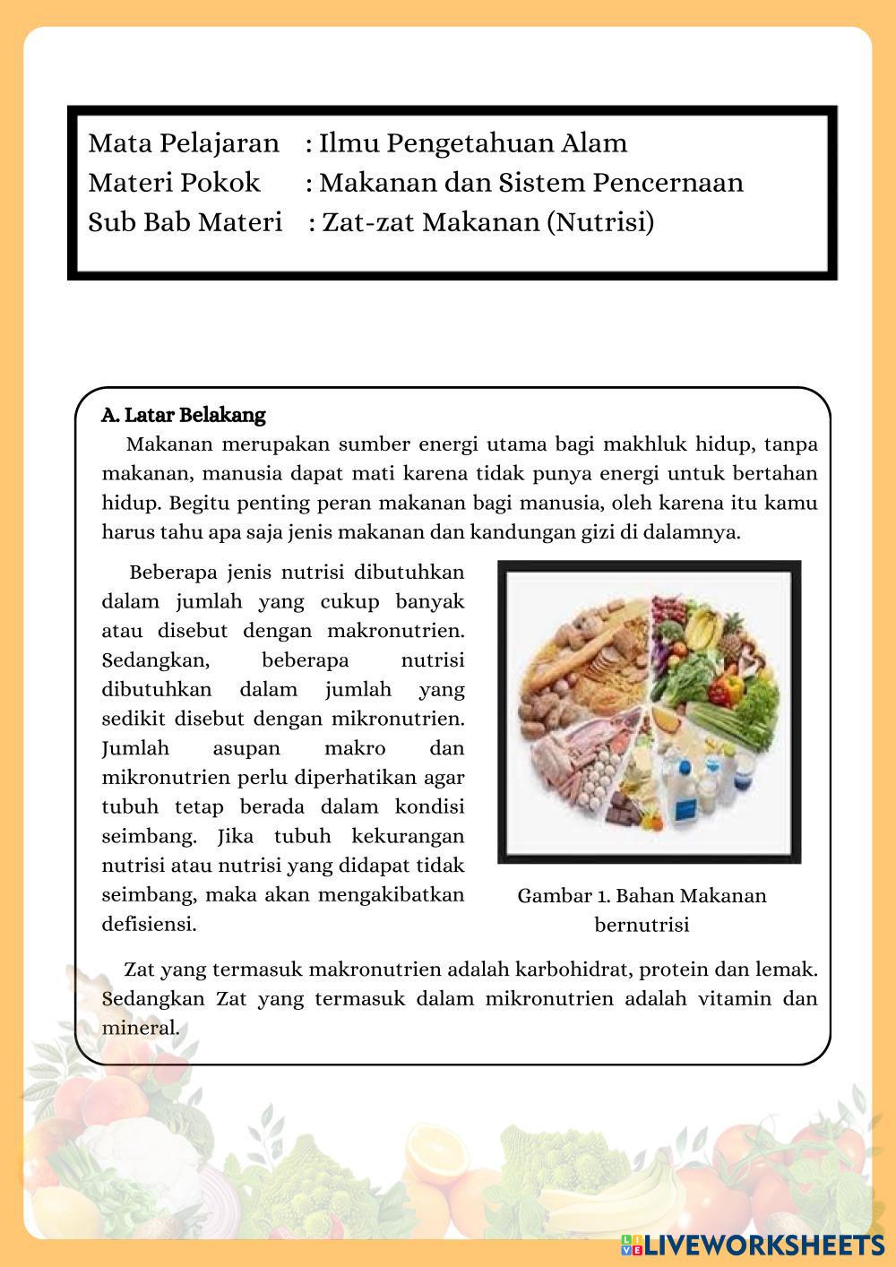 Created byDea Dea Ilmu Pengetahuan Alam (IPA) Nutrisi Pada Makanan Age 15+ level: 8 Indonesian Author's Instructions My Google Classroom Courses × 0 classes selected (0 students total) Quick Access Select all classes (0 classes) All Classes Loading courses... Cancel Share Share to selected Course __COURSE_NAME__ __STUDENT_NAME__ (__STUDENT_EMAIL__) Zat-zat Makanan (Nutrisi) Download Worksheet Validation Check my answers Emails my answers to my teacher Full name Group/level School subject Teacher's email or key code Close Submit Validating worksheet... (12) Your answers have been sent to your teacher. Good luck! OK We encountered an error submitting your answers. Please try again. OK Advertisement | Go Ad Free Created byDea Dea Ilmu Pengetahuan Alam (IPA) Nutrisi Pada Makanan Age 15+ level: 8 Indonesian Author's Instructions
