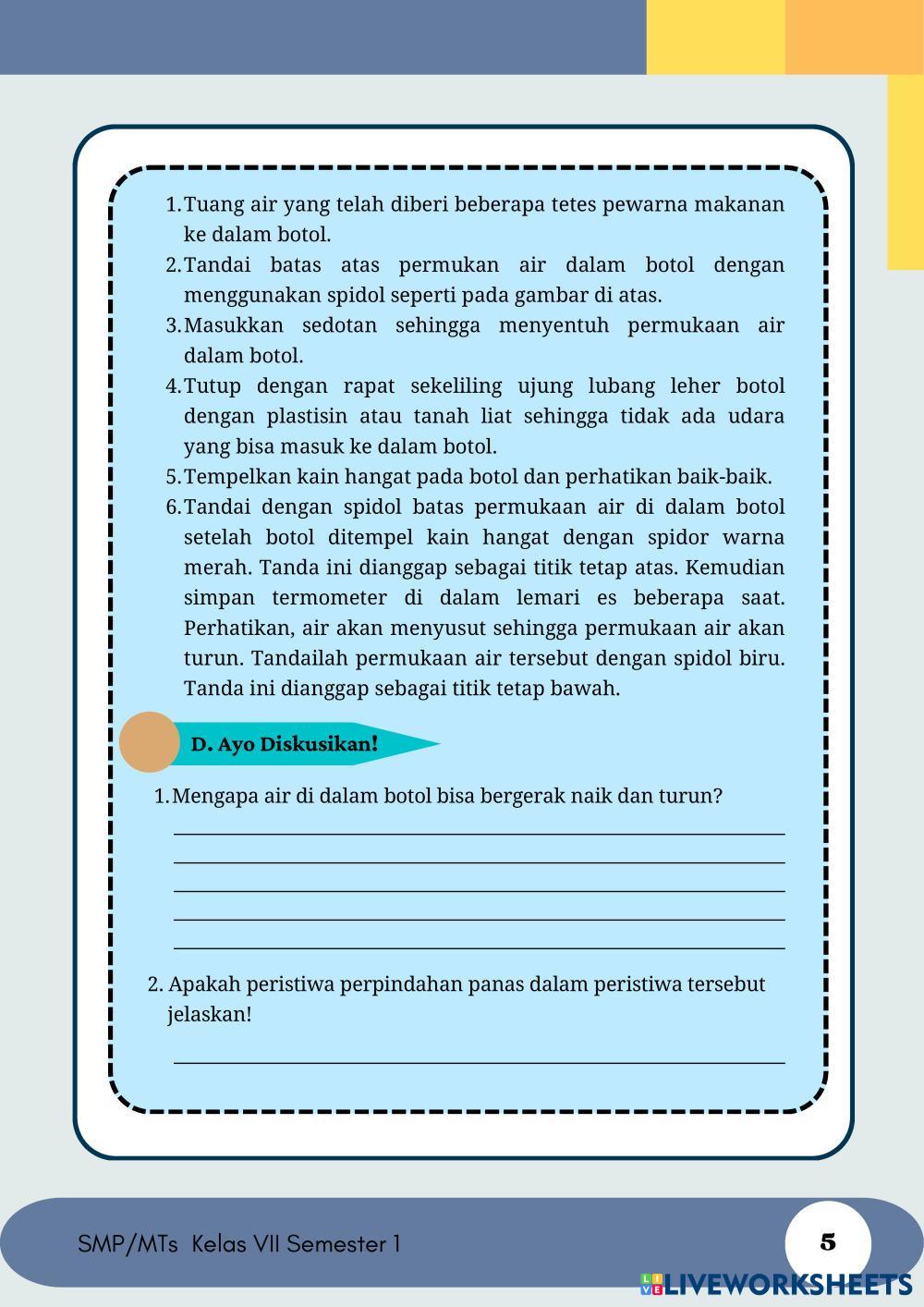 Created byAyraayyy Ilmu Pengetahuan Alam (IPA) Suhu, Kalor dan Pemuaian Age 13+ level: 7 Indonesian Author's Instructions My Google Classroom Courses × 0 classes selected (0 students total) Quick Access Select all classes (0 classes) All Classes Loading courses... Cancel Share Share to selected Course __COURSE_NAME__ __STUDENT_NAME__ (__STUDENT_EMAIL__) LKPD Elektronik_SUHU Download Worksheet Validation Check my answers Emails my answers to my teacher Full name Group/level School subject Teacher's email or key code Close Submit Validating worksheet... (12) Your answers have been sent to your teacher. Good luck! OK We encountered an error submitting your answers. Please try again. OK Advertisement | Go Ad Free Created byAyraayyy Ilmu Pengetahuan Alam (IPA) Suhu, Kalor dan Pemuaian Age 13+ level: 7 Indonesian Author's Instructions