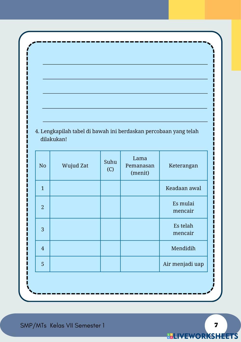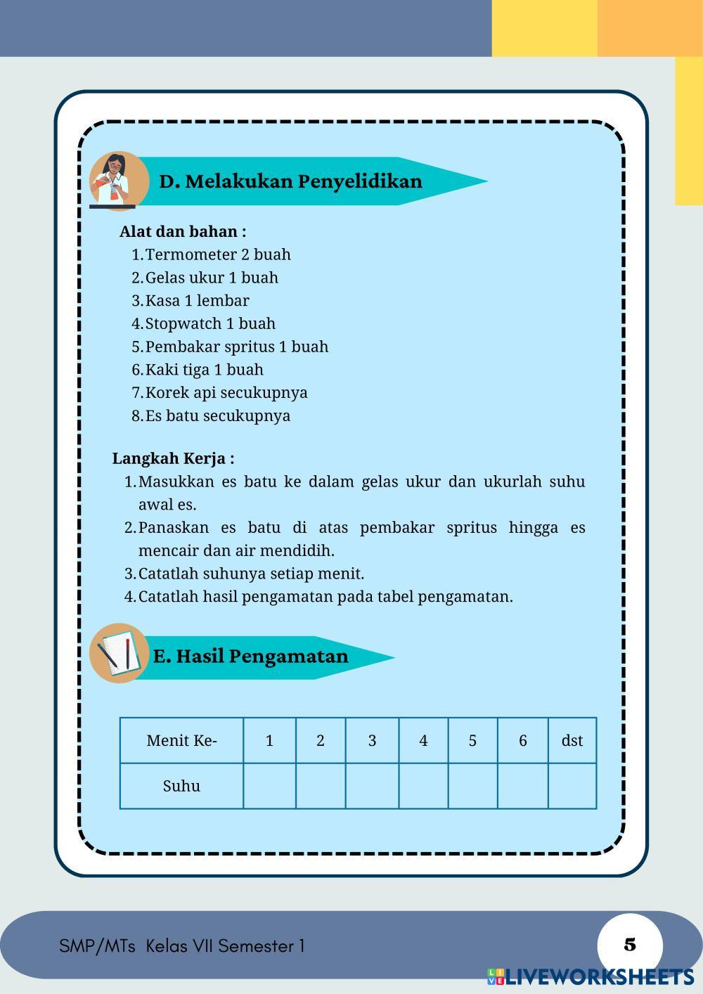 Created byAyraayyy Ilmu Pengetahuan Alam (IPA) Suhu, Kalor dan Pemuaian Age 13+ level: 7 Indonesian Author's Instructions My Google Classroom Courses × 0 classes selected (0 students total) Quick Access Select all classes (0 classes) All Classes Loading courses... Cancel Share Share to selected Course __COURSE_NAME__ __STUDENT_NAME__ (__STUDENT_EMAIL__) E-LKPD KALOR Download Worksheet Validation Check my answers Emails my answers to my teacher Full name Group/level School subject Teacher's email or key code Close Submit Validating worksheet... (12) Your answers have been sent to your teacher. Good luck! OK We encountered an error submitting your answers. Please try again. OK Advertisement | Go Ad Free Created byAyraayyy Ilmu Pengetahuan Alam (IPA) Suhu, Kalor dan Pemuaian Age 13+ level: 7 Indonesian Author's Instructions