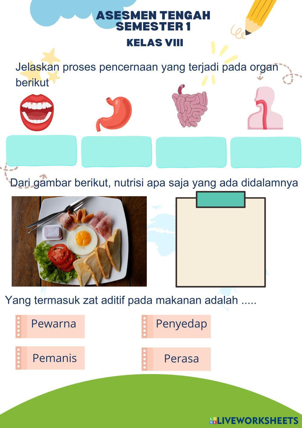 Created byDianita Ilmu Pengetahuan Alam (IPA) Sistem pencernaan Age 11-15 level: 8 Indonesian Author's Instructions Soal asesmen tengah semester 1 tentang sistem pencernaan My Google Classroom Courses × 0 classes selected (0 students total) Quick Access Select all classes (0 classes) All Classes Loading courses... Cancel Share Share to selected Course __COURSE_NAME__ __STUDENT_NAME__ (__STUDENT_EMAIL__) Asesmen Tengah Semester 1 Tahun 2024/2025 Download Worksheet Validation Check my answers Emails my answers to my teacher Full name Group/level School subject Teacher's email or key code Close Submit Validating worksheet... (12) Your answers have been sent to your teacher. Good luck! OK We encountered an error submitting your answers. Please try again. OK Advertisement | Go Ad Free Created byDianita Ilmu Pengetahuan Alam (IPA) Sistem pencernaan Age 11-15 level: 8 Indonesian Author's Instructions Soal asesmen tengah semester 1 tentang sistem pencernaan