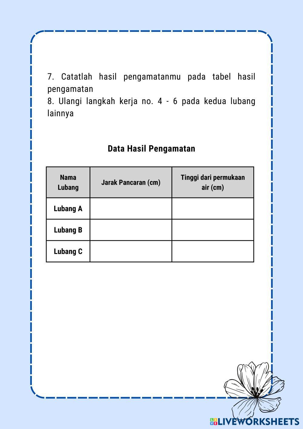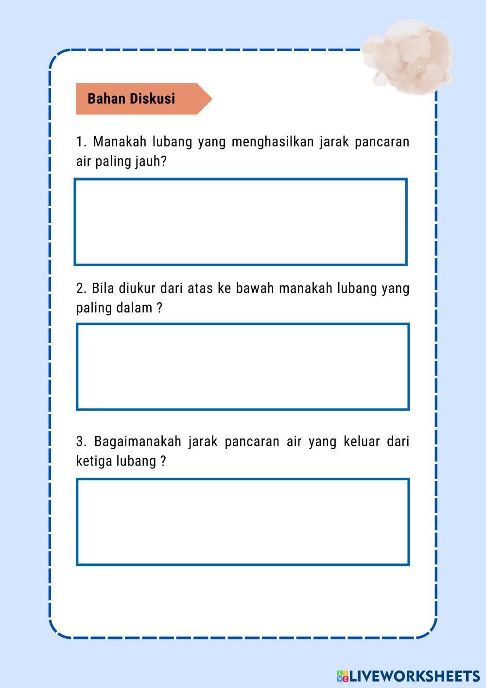 Created by salmahanii_ Ilmu Pengetahuan Alam (IPA) Tekanan Zat Cair Age 13-17 level: 8 Indonesian Author's Instructions Tekanan zat cair merupakan materi kelas 8 My Google Classroom Courses × 0 classes selected (0 students total) Quick Access Select all classes (0 classes) All Classes Loading courses... Cancel Share Share to selected Course __COURSE_NAME__ __STUDENT_NAME__ (__STUDENT_EMAIL__) LKPD Tekanan Hidrostatis Download Worksheet Validation Check my answers Emails my answers to my teacher Full name Group/level School subject Teacher's email or key code Close Submit Validating worksheet... (12) Your answers have been sent to your teacher. Good luck! OK We encountered an error submitting your answers. Please try again. OK Advertisement | Go Ad Free Created by salmahanii_ Ilmu Pengetahuan Alam (IPA) Tekanan Zat Cair Age 13-17 level: 8 Indonesian Author's Instructions Tekanan zat cair merupakan materi kelas 8