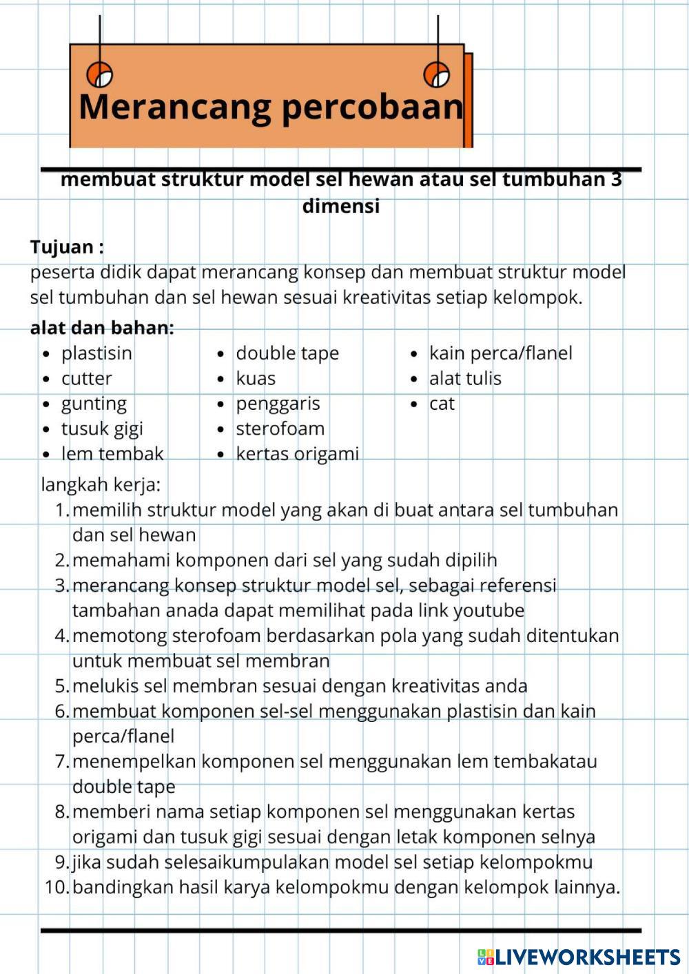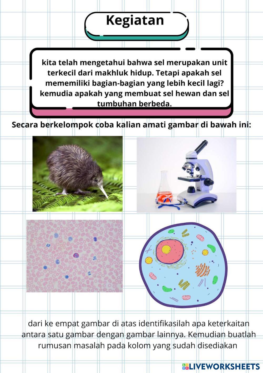 Created byNoviyaniRachmat Ilmu Pengetahuan Alam (IPA) Pengenalan Sel Age 12-17 level: 8 Indonesian Author's Instructions Pengenalan sel hewan dan sel tumbuhan My Google Classroom Courses × 0 classes selected (0 students total) Quick Access Select all classes (0 classes) All Classes Loading courses... Cancel Share Share to selected Course __COURSE_NAME__ __STUDENT_NAME__ (__STUDENT_EMAIL__) LKPD Pengenalan Sel Download Worksheet Validation Check my answers Emails my answers to my teacher Full name Group/level School subject Teacher's email or key code Close Submit Validating worksheet... (12) Your answers have been sent to your teacher. Good luck! OK We encountered an error submitting your answers. Please try again. OK Advertisement | Go Ad Free Created byNoviyaniRachmat Ilmu Pengetahuan Alam (IPA) Pengenalan Sel Age 12-17 level: 8 Indonesian Author's Instructions Pengenalan sel hewan dan sel tumbuhan