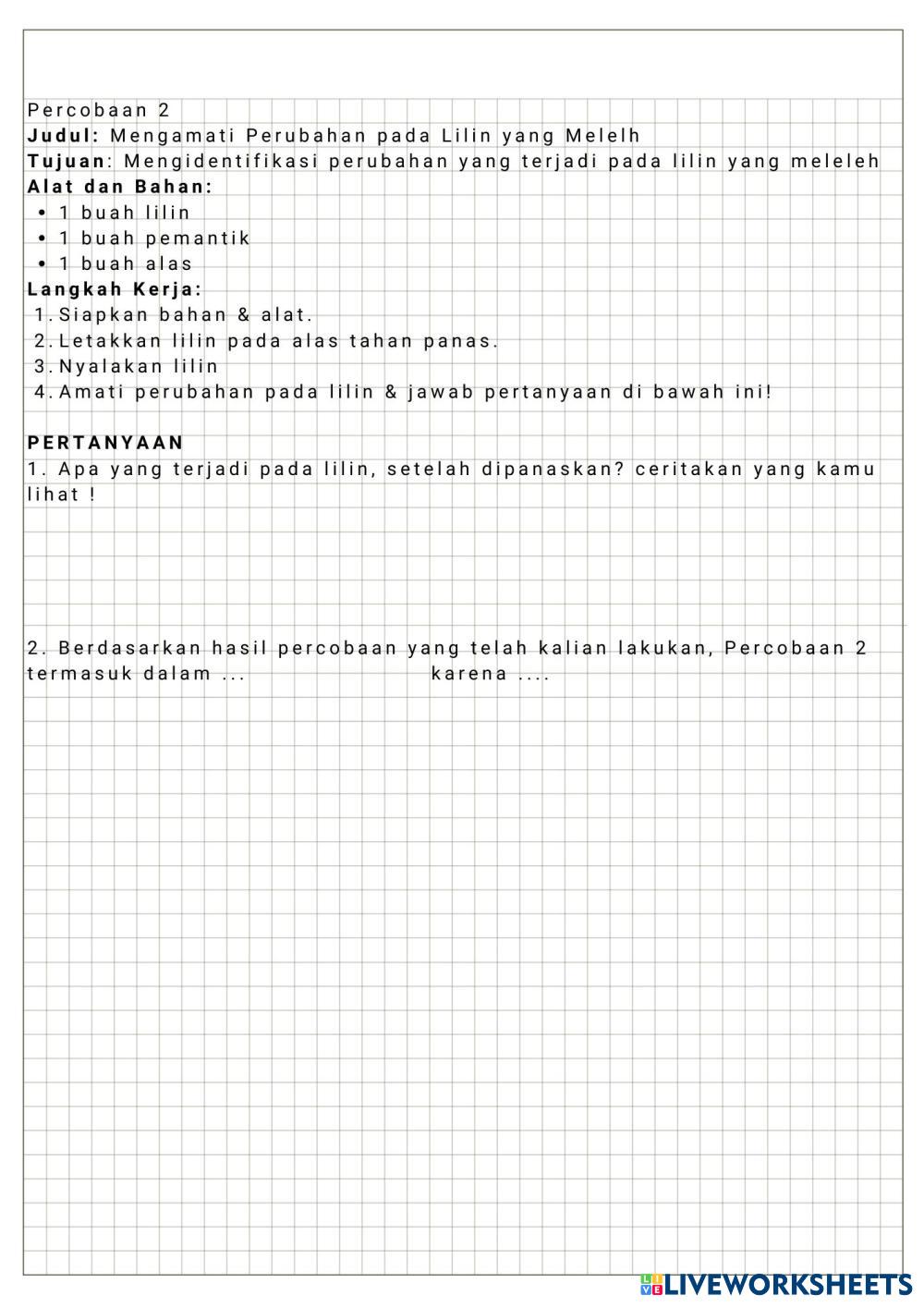 Created byRiska Sukma Isnayanti, S.Pd. Ilmu Pengetahuan Alam (IPA) Perubahan Fisika dan Kimia Age 13-18 level: Kelas 7 Indonesian Author's Instructions My Google Classroom Courses × 0 classes selected (0 students total) Quick Access Select all classes (0 classes) All Classes Loading courses... Cancel Share Share to selected Course __COURSE_NAME__ __STUDENT_NAME__ (__STUDENT_EMAIL__) Riska Sukma Download Worksheet Validation Check my answers Emails my answers to my teacher Full name Group/level School subject Teacher's email or key code Close Submit Validating worksheet... (12) Your answers have been sent to your teacher. Good luck! OK We encountered an error submitting your answers. Please try again. OK Advertisement | Go Ad Free Created byRiska Sukma Isnayanti, S.Pd. Ilmu Pengetahuan Alam (IPA) Perubahan Fisika dan Kimia Age 13-18 level: Kelas 7 Indonesian Author's Instructions