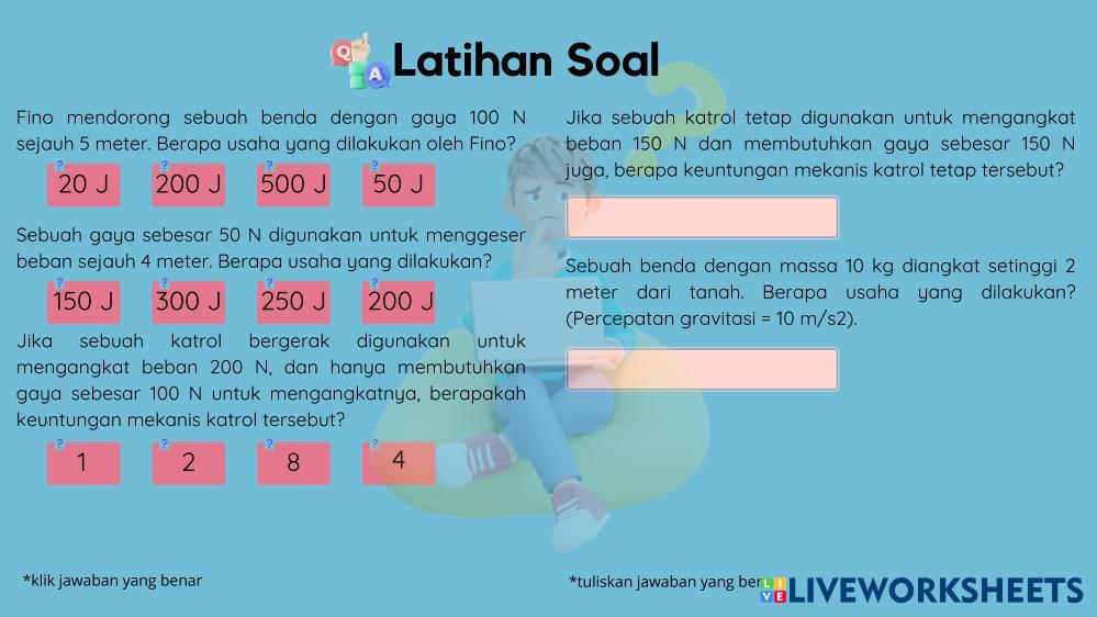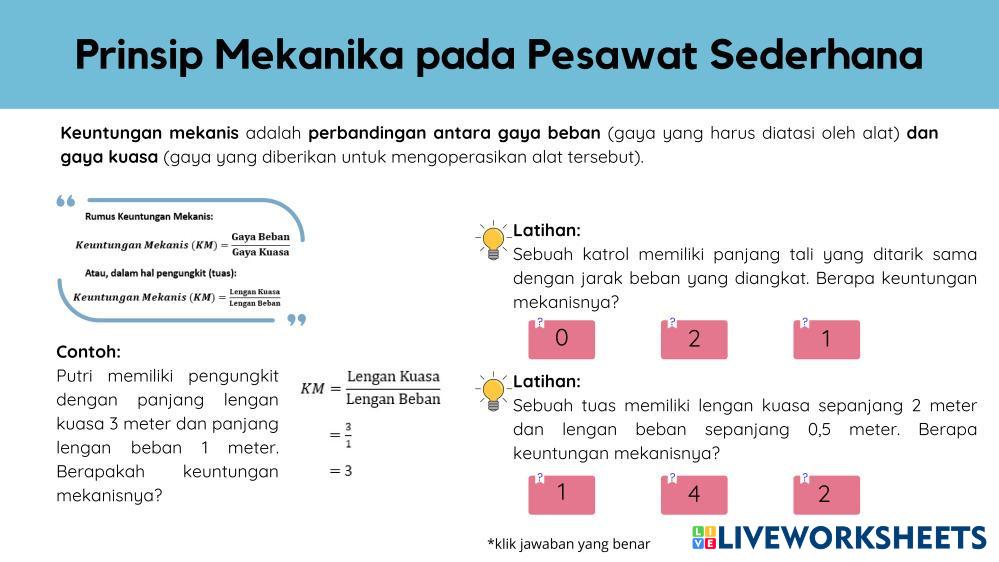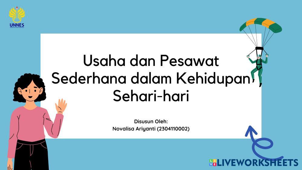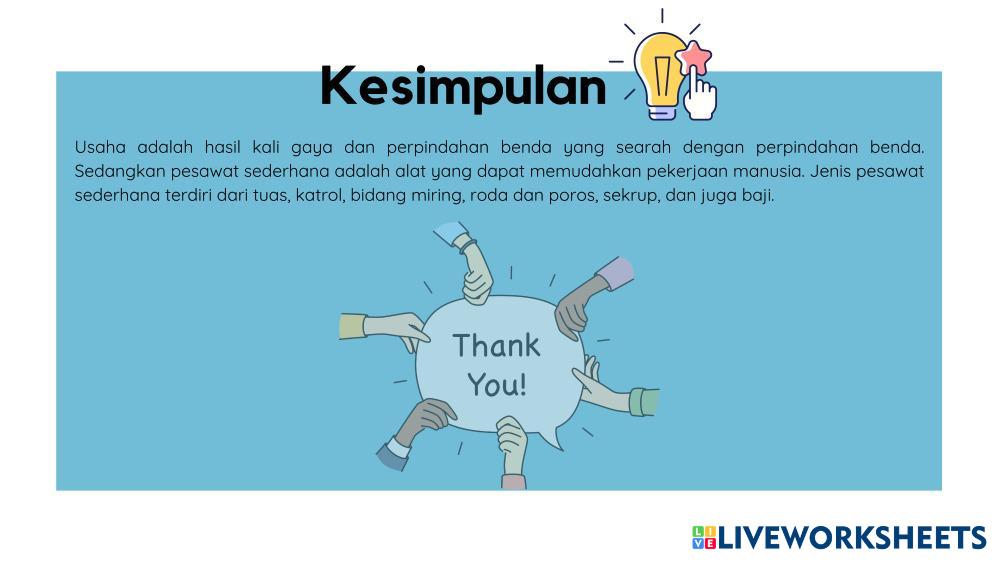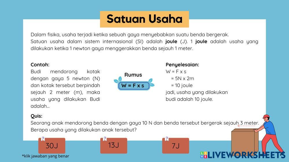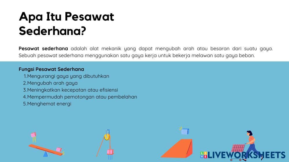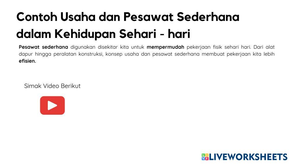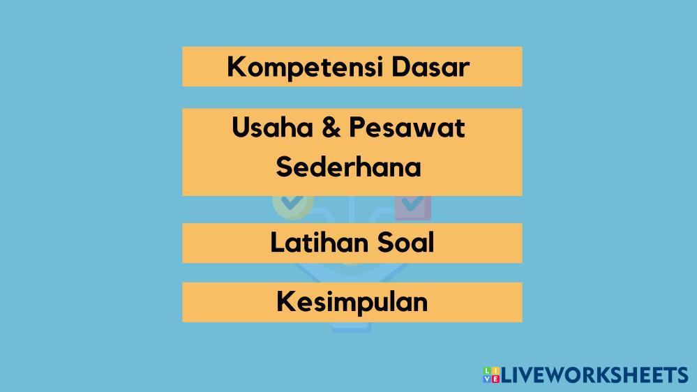 Created bySasa Riya Ilmu Pengetahuan Alam (IPA) Usaha dan pesawat sederhana Age 13-18 level: 8 Indonesian Author's Instructions Materi dan Latihan Soal My Google Classroom Courses × 0 classes selected (0 students total) Quick Access Select all classes (0 classes) All Classes Loading courses... Cancel Share Share to selected Course __COURSE_NAME__ __STUDENT_NAME__ (__STUDENT_EMAIL__) Novalisa Ariyanti Download Worksheet Validation Check my answers Emails my answers to my teacher Full name Group/level School subject Teacher's email or key code Close Submit Validating worksheet... (12) Your answers have been sent to your teacher. Good luck! OK We encountered an error submitting your answers. Please try again. OK Advertisement | Go Ad Free Created bySasa Riya Ilmu Pengetahuan Alam (IPA) Usaha dan pesawat sederhana Age 13-18 level: 8 Indonesian Author's Instructions Materi dan Latihan Soal