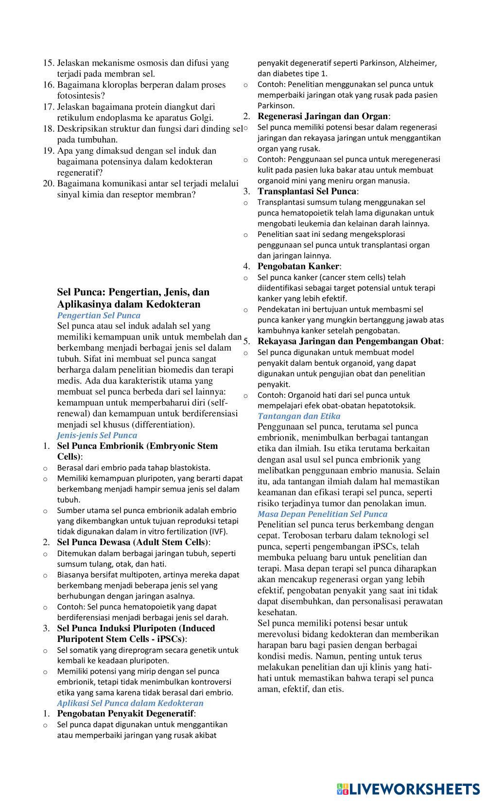 Created byMultiani Rasyid Ilmu Pengetahuan Alam (IPA) Pengenalan Sel Age 13-17 level: kelas VIII Indonesian Author's Instructions My Google Classroom Courses × 0 classes selected (0 students total) Quick Access Select all classes (0 classes) All Classes Loading courses... Cancel Share Share to selected Course __COURSE_NAME__ __STUDENT_NAME__ (__STUDENT_EMAIL__) LKPD Sel Download Worksheet Validation Check my answers Emails my answers to my teacher Full name Group/level School subject Teacher's email or key code Close Submit Validating worksheet... (12) Your answers have been sent to your teacher. Good luck! OK We encountered an error submitting your answers. Please try again. OK Advertisement | Go Ad Free Created byMultiani Rasyid Ilmu Pengetahuan Alam (IPA) Pengenalan Sel Age 13-17 level: kelas VIII Indonesian Author's Instructions