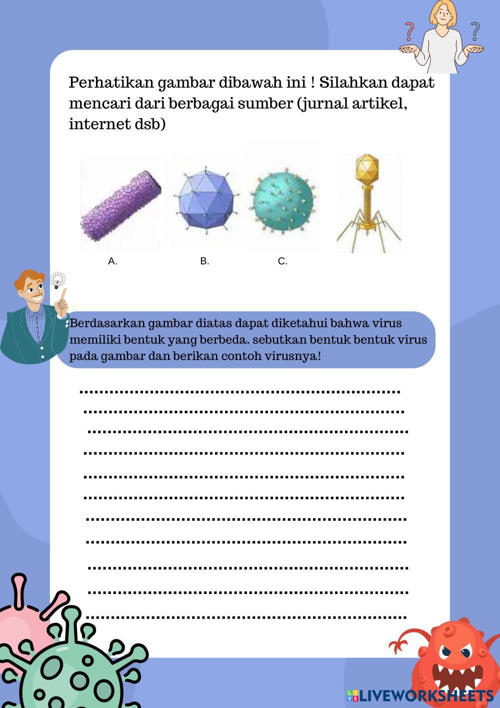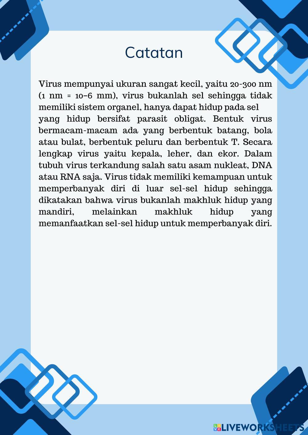 Created byRaras Nur Febriana Ilmu Pengetahuan Alam (IPA) Virus Age 14+ level: 7 Indonesian Author's Instructions My Google Classroom Courses × 0 classes selected (0 students total) Quick Access Select all classes (0 classes) All Classes Loading courses... Cancel Share Share to selected Course __COURSE_NAME__ __STUDENT_NAME__ (__STUDENT_EMAIL__) virus Download Worksheet Validation Check my answers Emails my answers to my teacher Full name Group/level School subject Teacher's email or key code Close Submit Validating worksheet... (12) Your answers have been sent to your teacher. Good luck! OK We encountered an error submitting your answers. Please try again. OK Advertisement | Go Ad Free Created byRaras Nur Febriana Ilmu Pengetahuan Alam (IPA) Virus Age 14+ level: 7 Indonesian Author's Instructions
