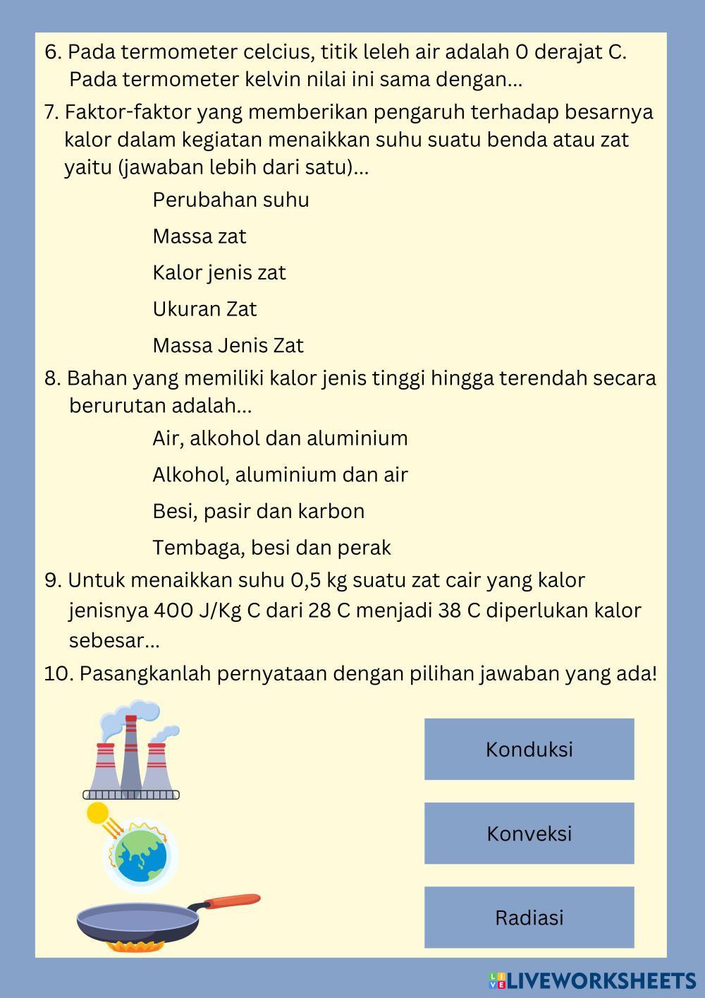 Created byLusiana Elva Ilmu Pengetahuan Alam (IPA) Suhu, Kalor dan Pemuaian Age 11+ level: 7 Indonesian Author's Instructions My Google Classroom Courses × 0 classes selected (0 students total) Quick Access Select all classes (0 classes) All Classes Loading courses... Cancel Share Share to selected Course __COURSE_NAME__ __STUDENT_NAME__ (__STUDENT_EMAIL__) Penilaian Sumatif Harian 3 Download Worksheet Validation Check my answers Emails my answers to my teacher Full name Group/level School subject Teacher's email or key code Close Submit Validating worksheet... (12) Your answers have been sent to your teacher. Good luck! OK We encountered an error submitting your answers. Please try again. OK Advertisement | Go Ad Free Created byLusiana Elva Ilmu Pengetahuan Alam (IPA) Suhu, Kalor dan Pemuaian Age 11+ level: 7 Indonesian Author's Instructions