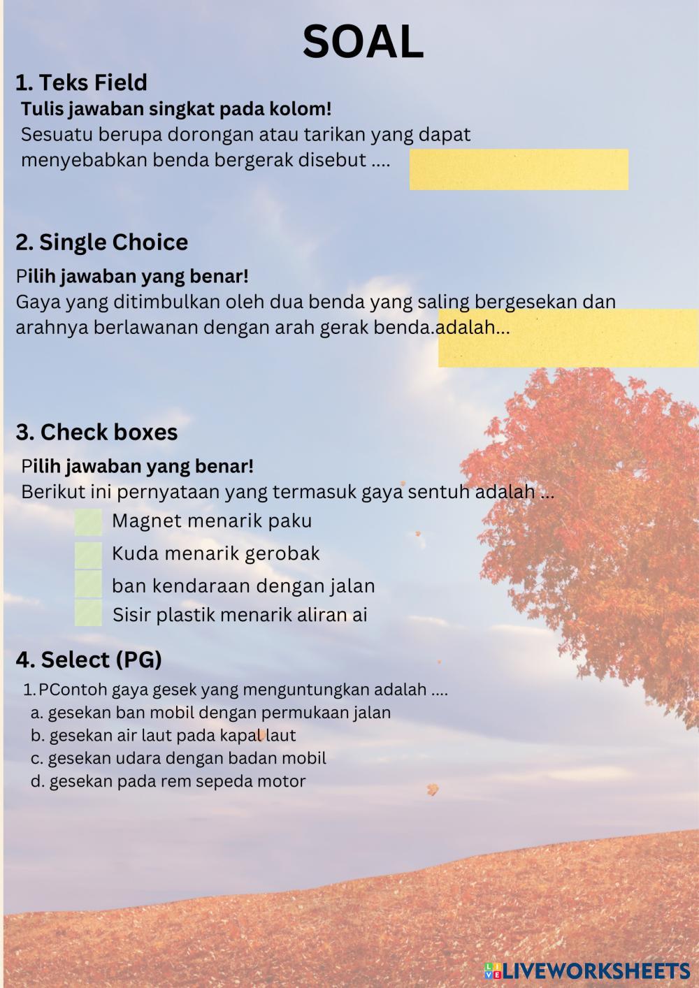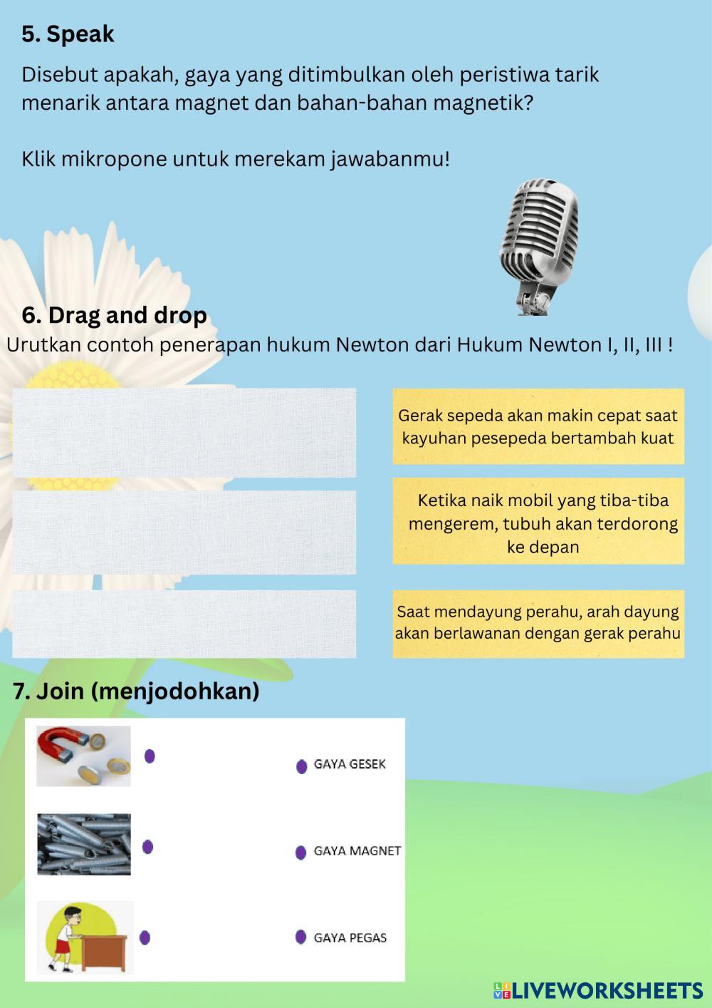 Created bydevi astuti alawiyah Ilmu Pengetahuan Alam (IPA) BAB 4 Gaya dan Gerak Age 12-17 level: Kelas 7 Indonesian Author's Instructions My Google Classroom Courses × 0 classes selected (0 students total) Quick Access Select all classes (0 classes) All Classes Loading courses... Cancel Share Share to selected Course __COURSE_NAME__ __STUDENT_NAME__ (__STUDENT_EMAIL__) Gaya Download Worksheet Validation Check my answers Emails my answers to my teacher Full name Group/level School subject Teacher's email or key code Close Submit Validating worksheet... (12) Your answers have been sent to your teacher. Good luck! OK We encountered an error submitting your answers. Please try again. OK Advertisement | Go Ad Free Created bydevi astuti alawiyah Ilmu Pengetahuan Alam (IPA) BAB 4 Gaya dan Gerak Age 12-17 level: Kelas 7 Indonesian Author's Instructions